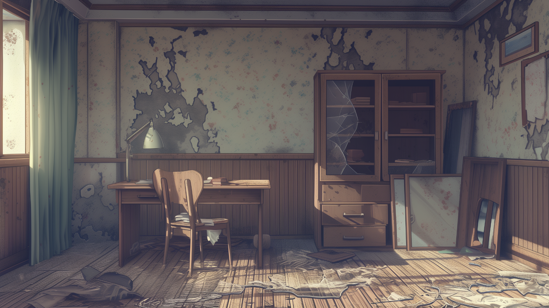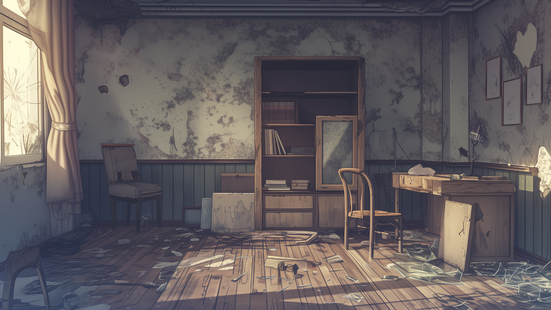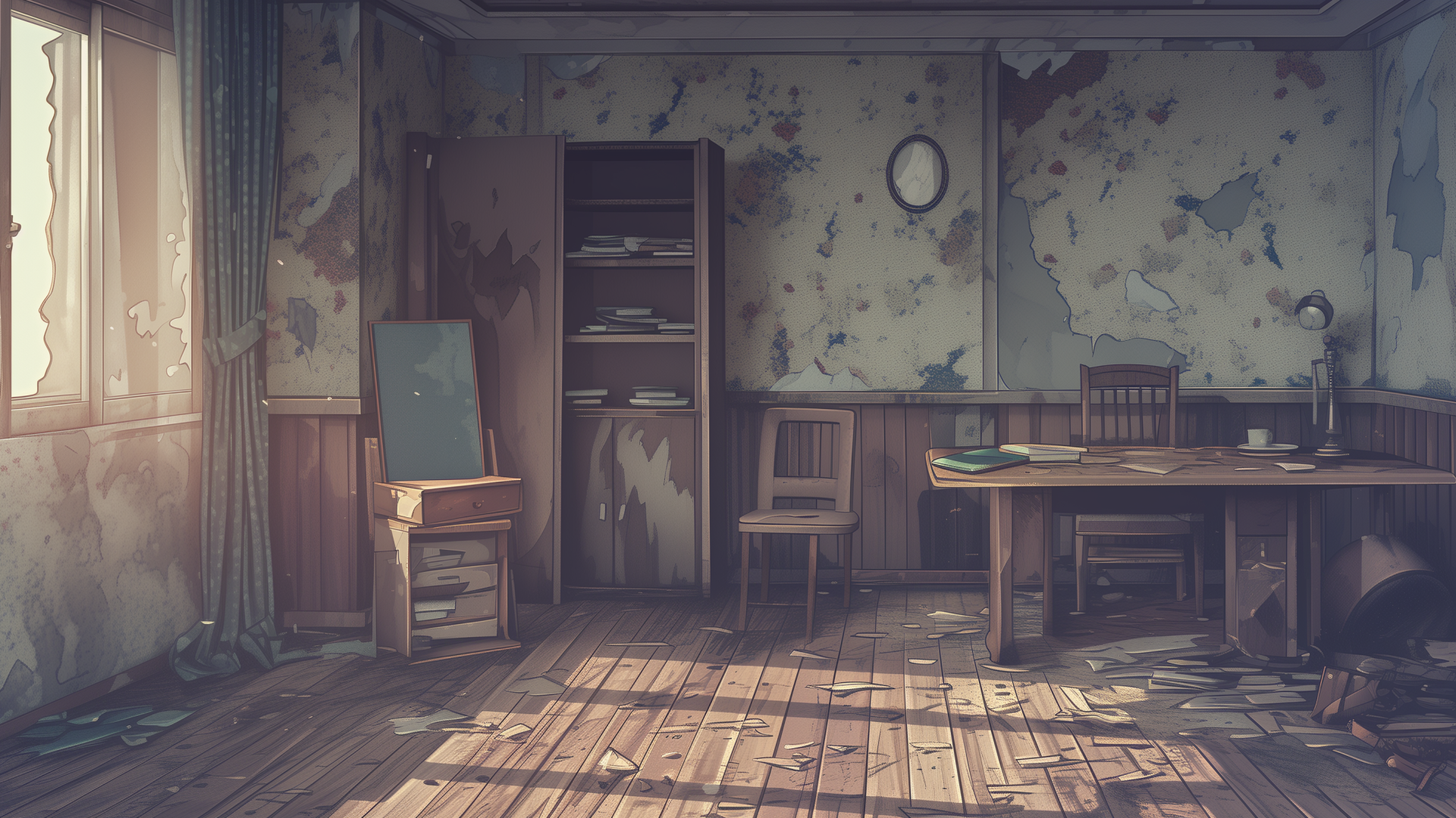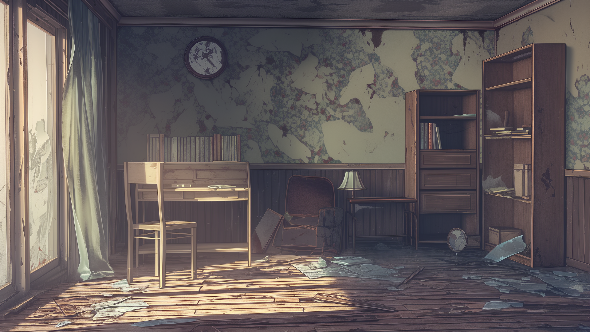 廃墟と化したアパートの部屋。埃をかぶった机や割れた窓ガラスが、過去の出来事を静かに物語る。TRPGの廃墟を探索するシーンに使えるフリー背景素材。