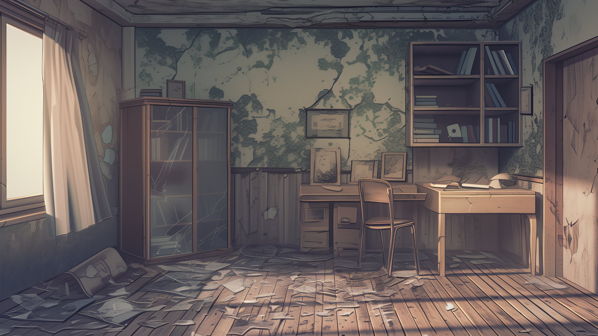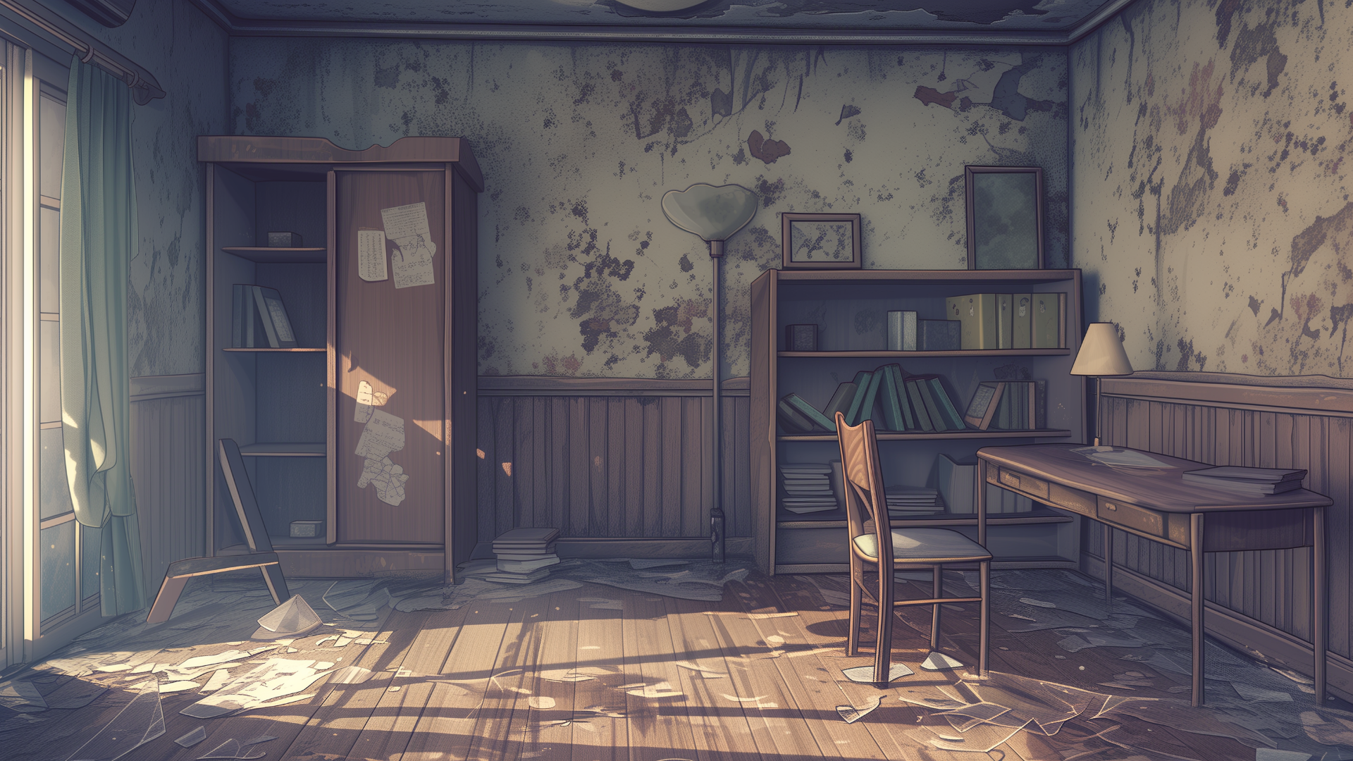 荒れ果てた部屋。剥がれた壁紙や散乱する書類が、長く放置された空間の静けさを際立たせる。TRPGのミステリーシナリオ向けのフリー背景素材。