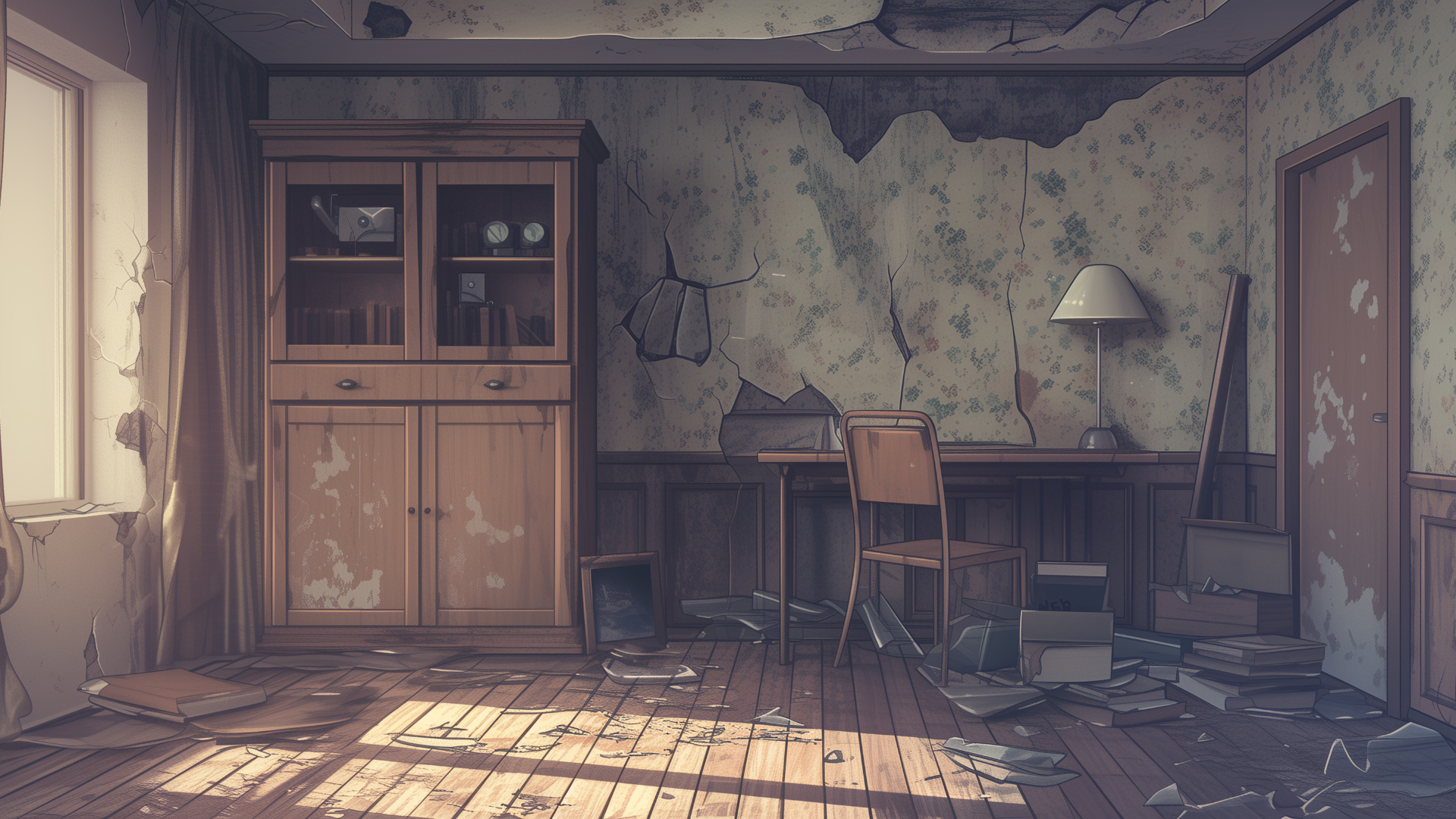 放棄されたアパートの一室。壁には無数のひび割れが走り、家具は崩れかけている。不穏な雰囲気が漂うTRPG向けのフリー背景素材。クトゥルフ神話TRPGにもおすすめ。
