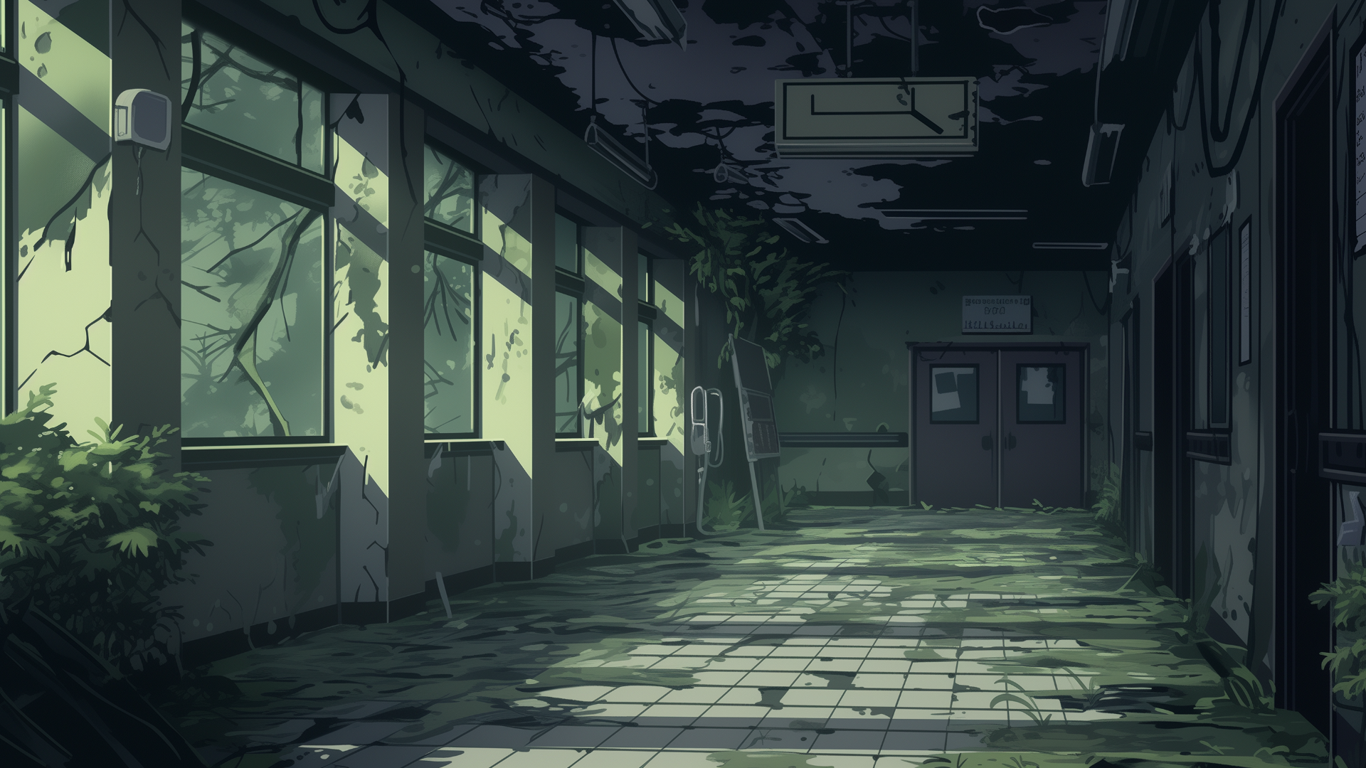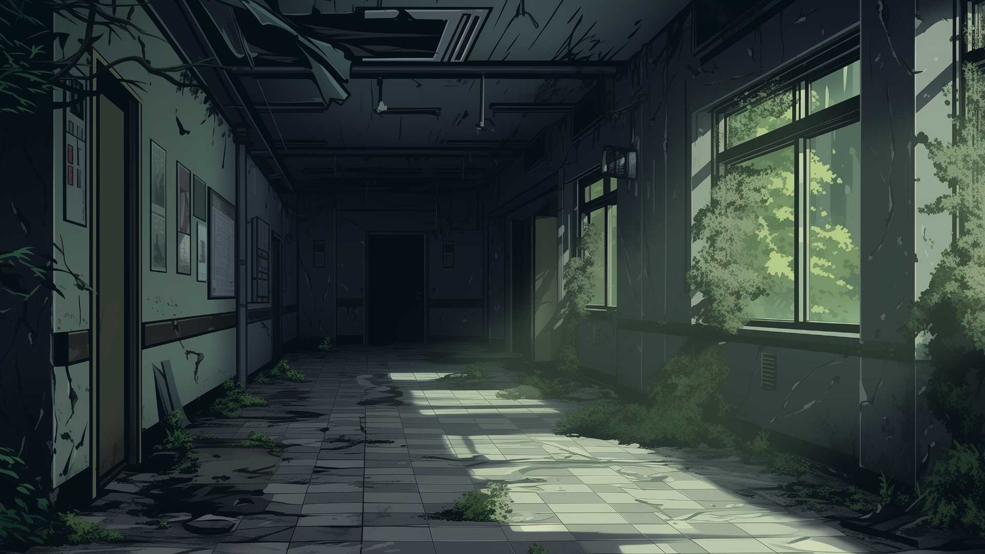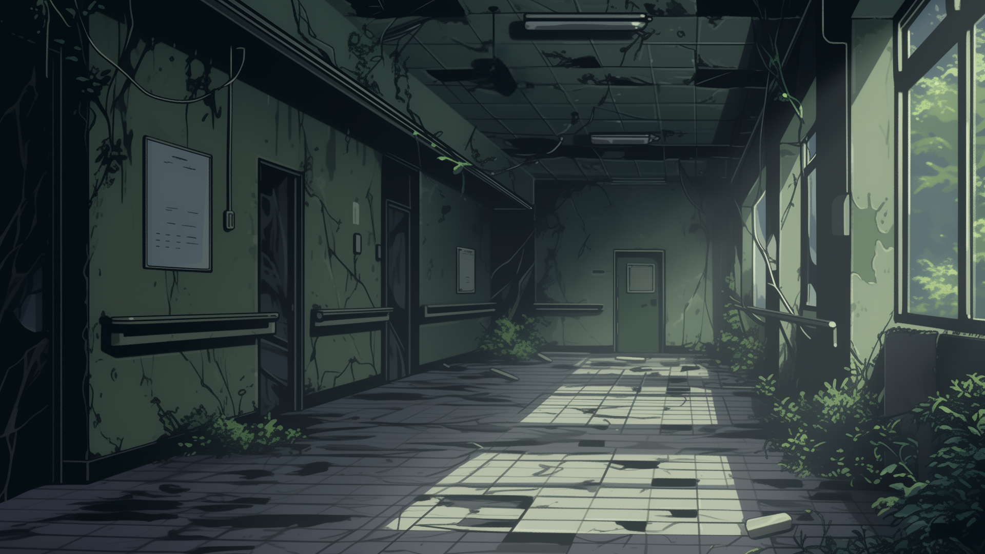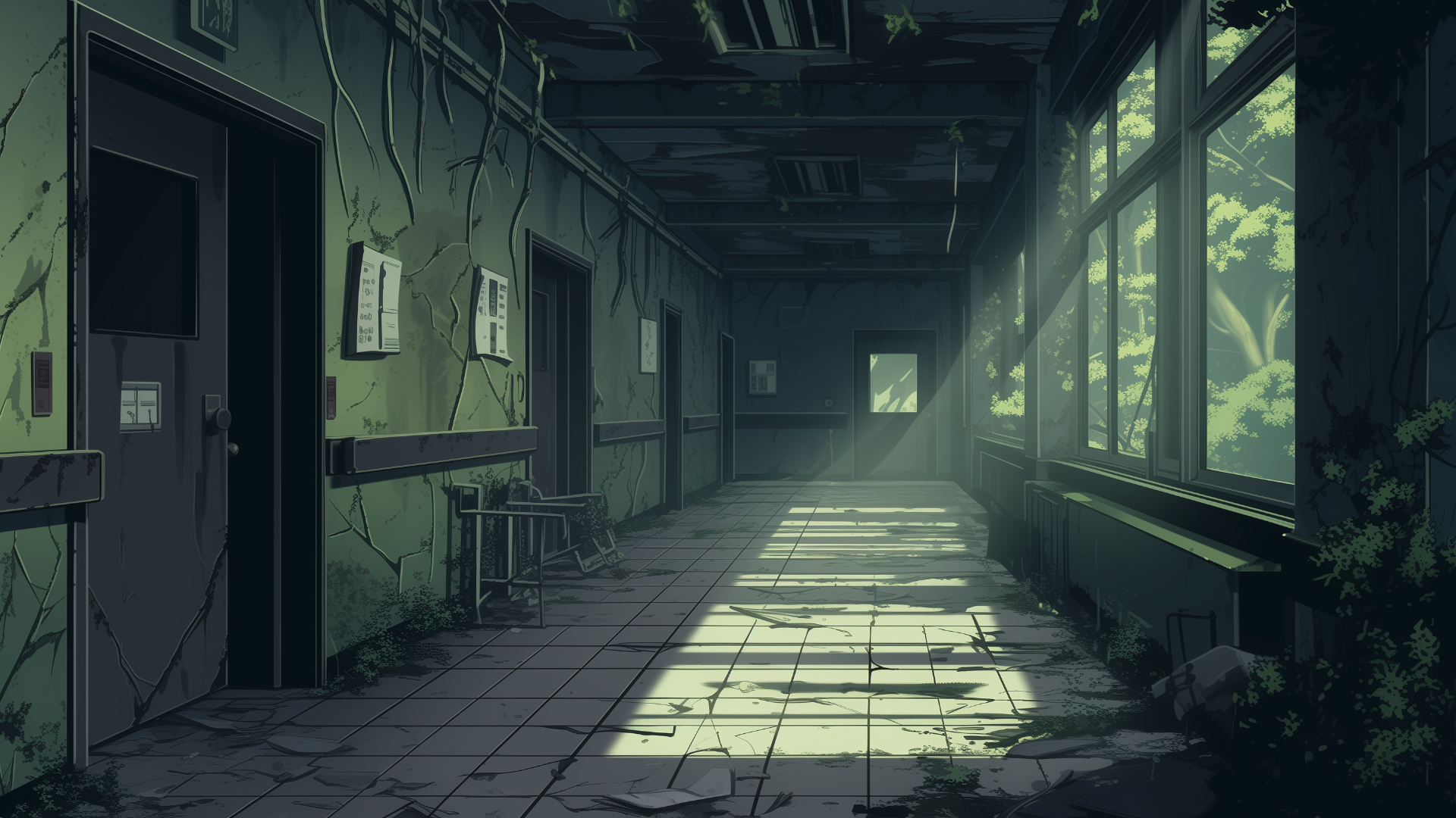 破損や汚れが目立つ、利用されなくなった病院の廊下を描いたフリー背景素材です。