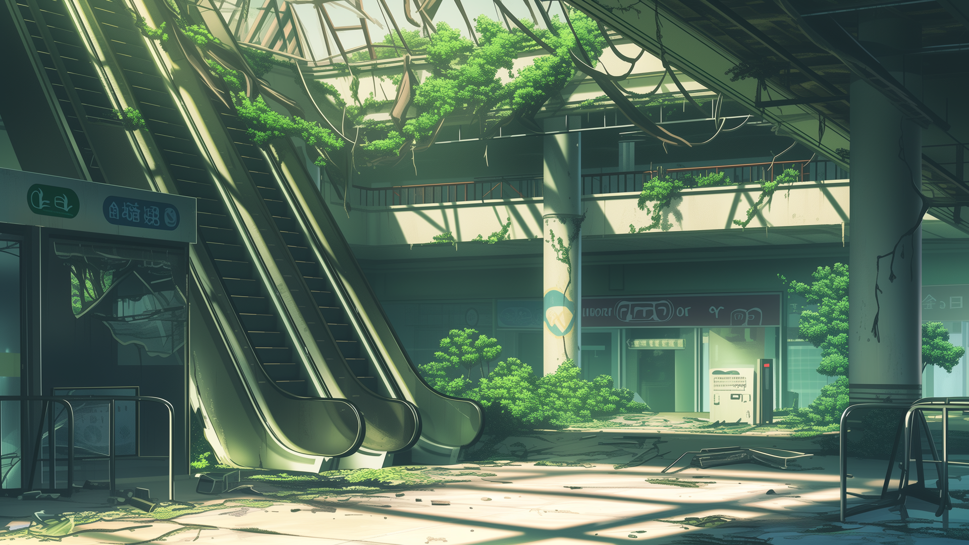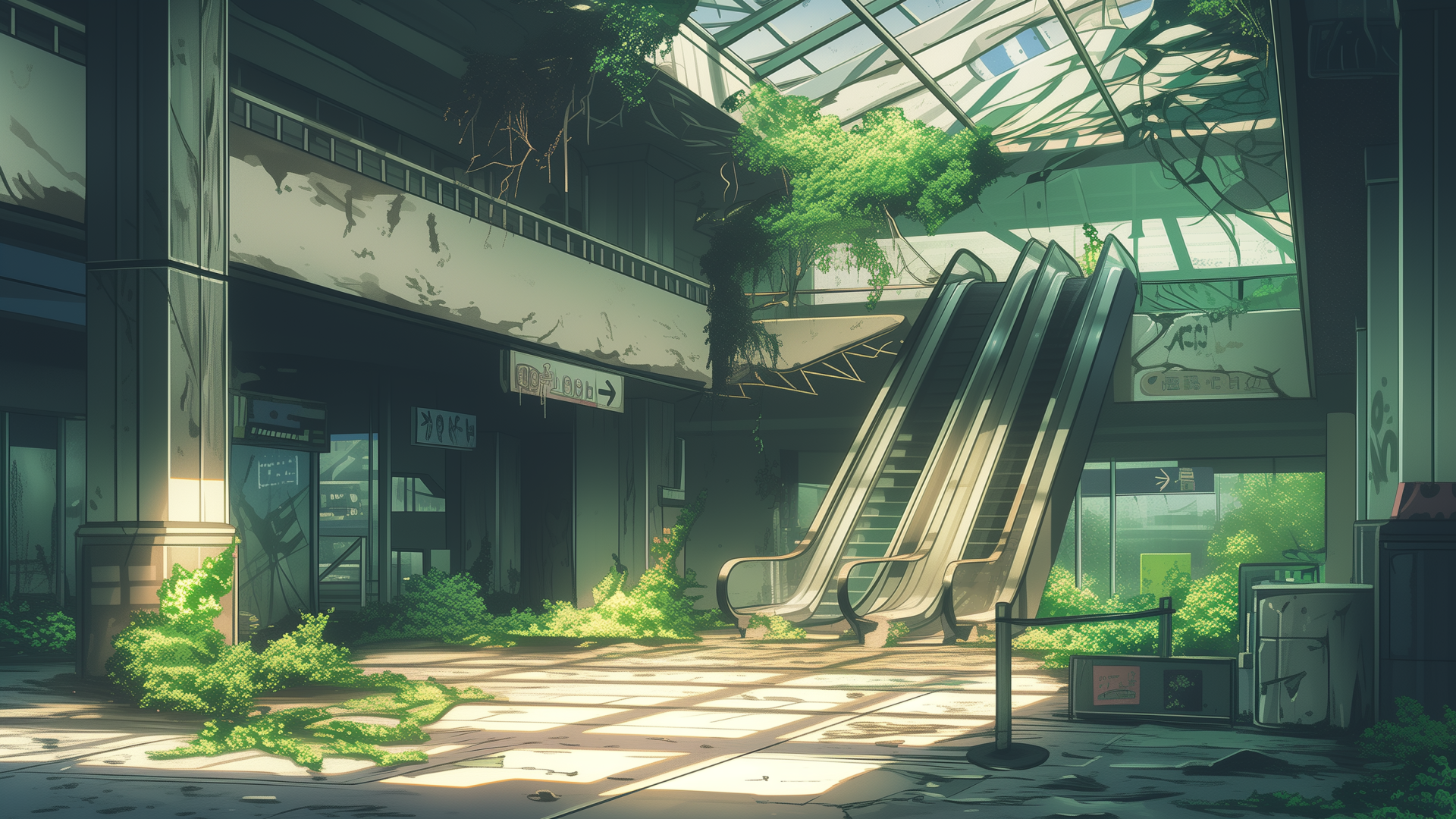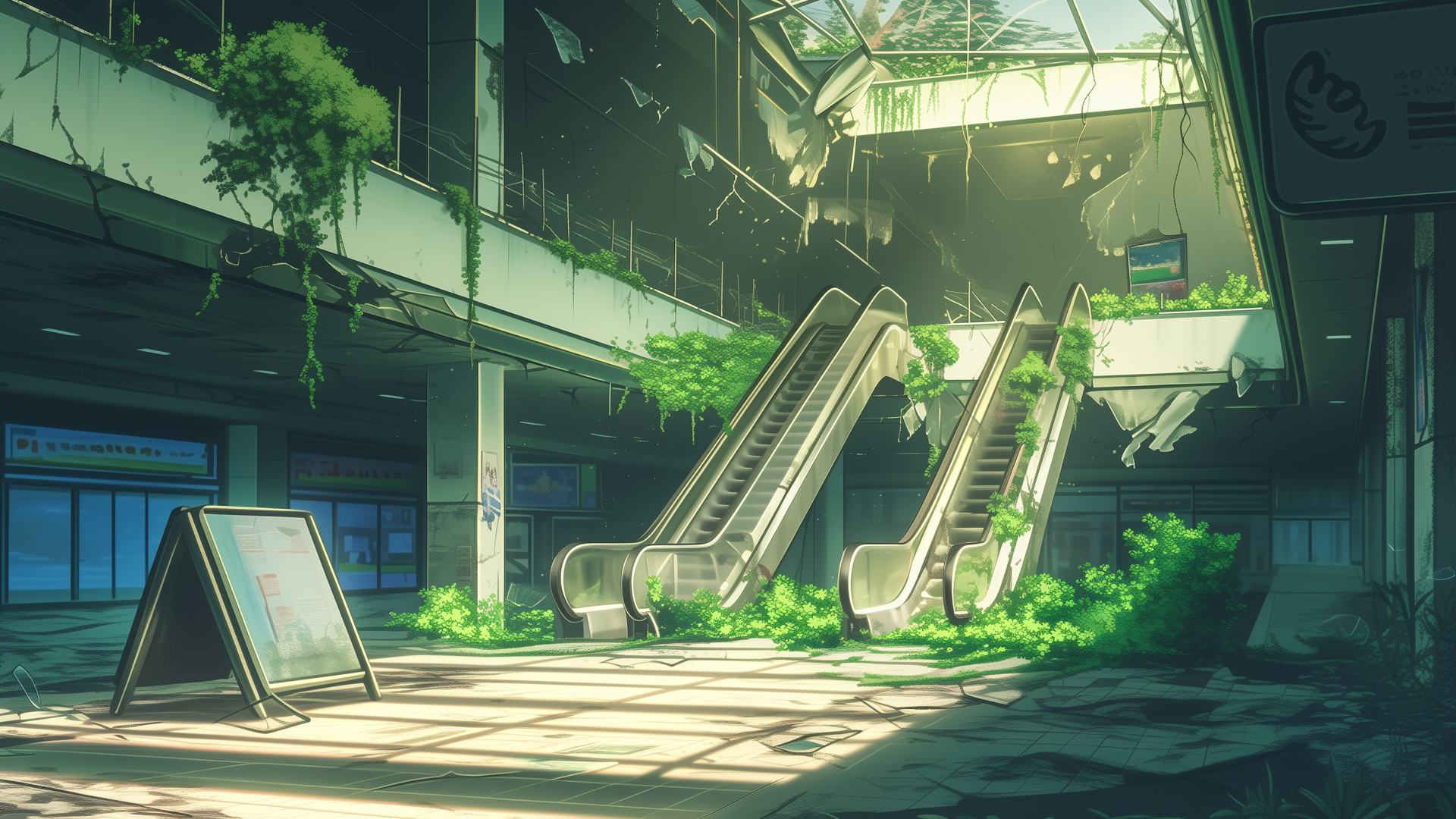 時間が止まったかのようなショッピングモールの墟。エスカレーターに絡みつく植物とひび割れた床が、文明崩壊後の世界をリアルに表現。TRPG向けのフリー背景素材。