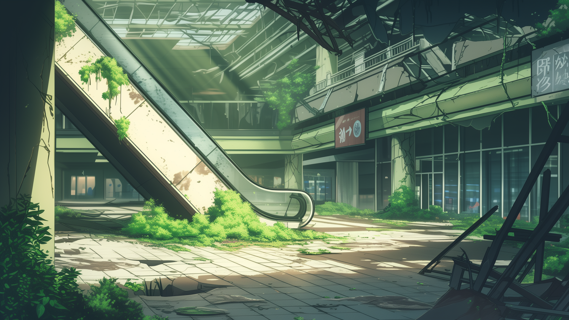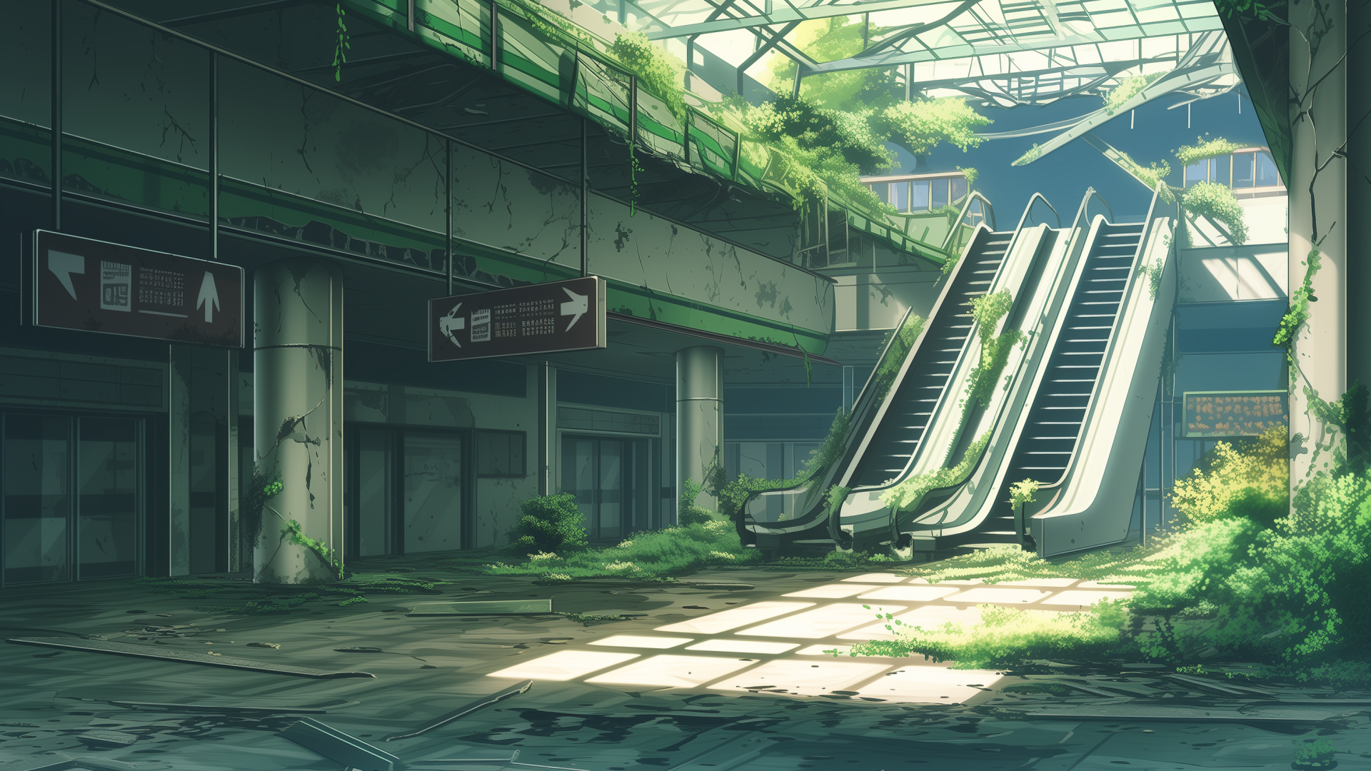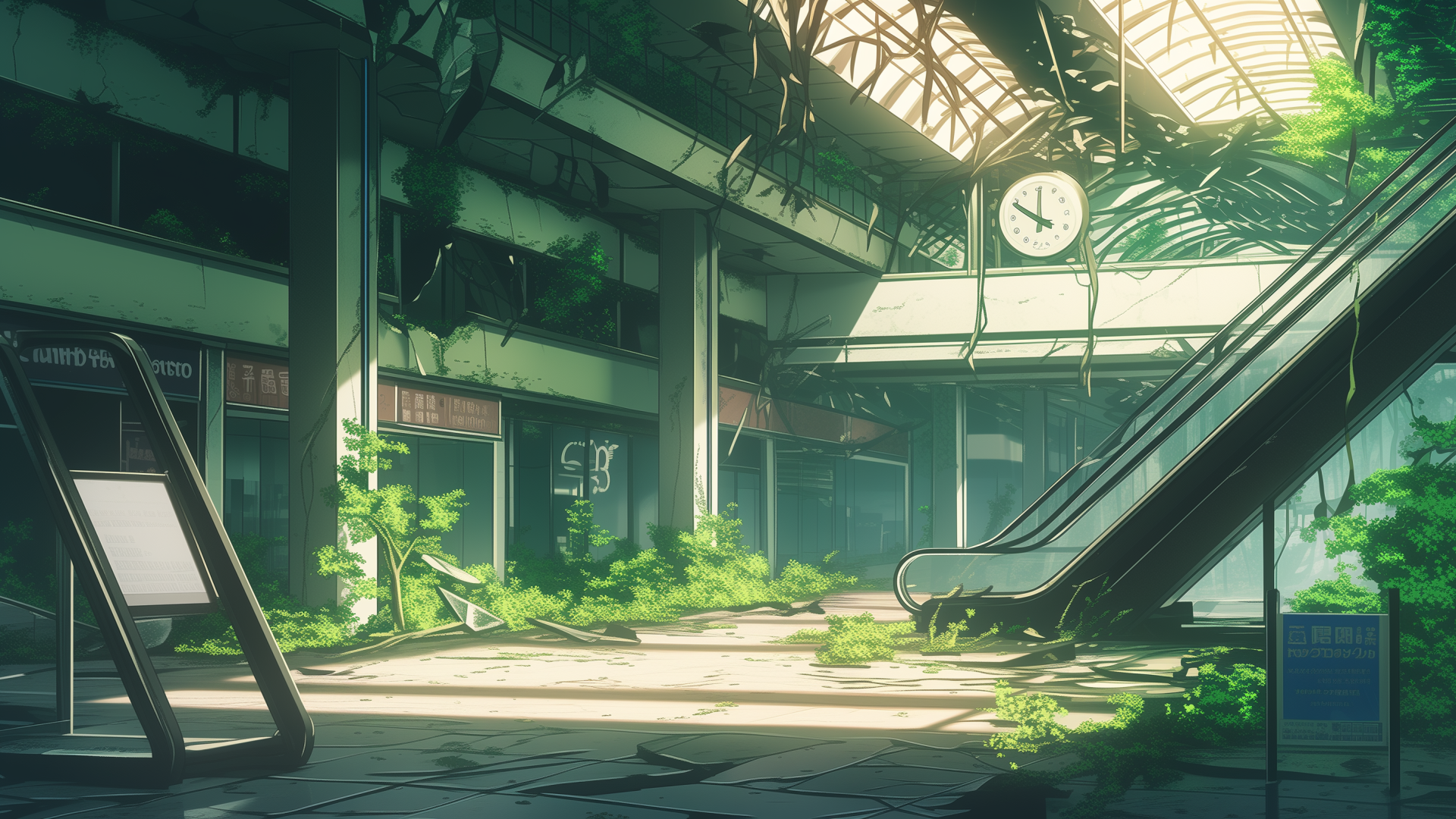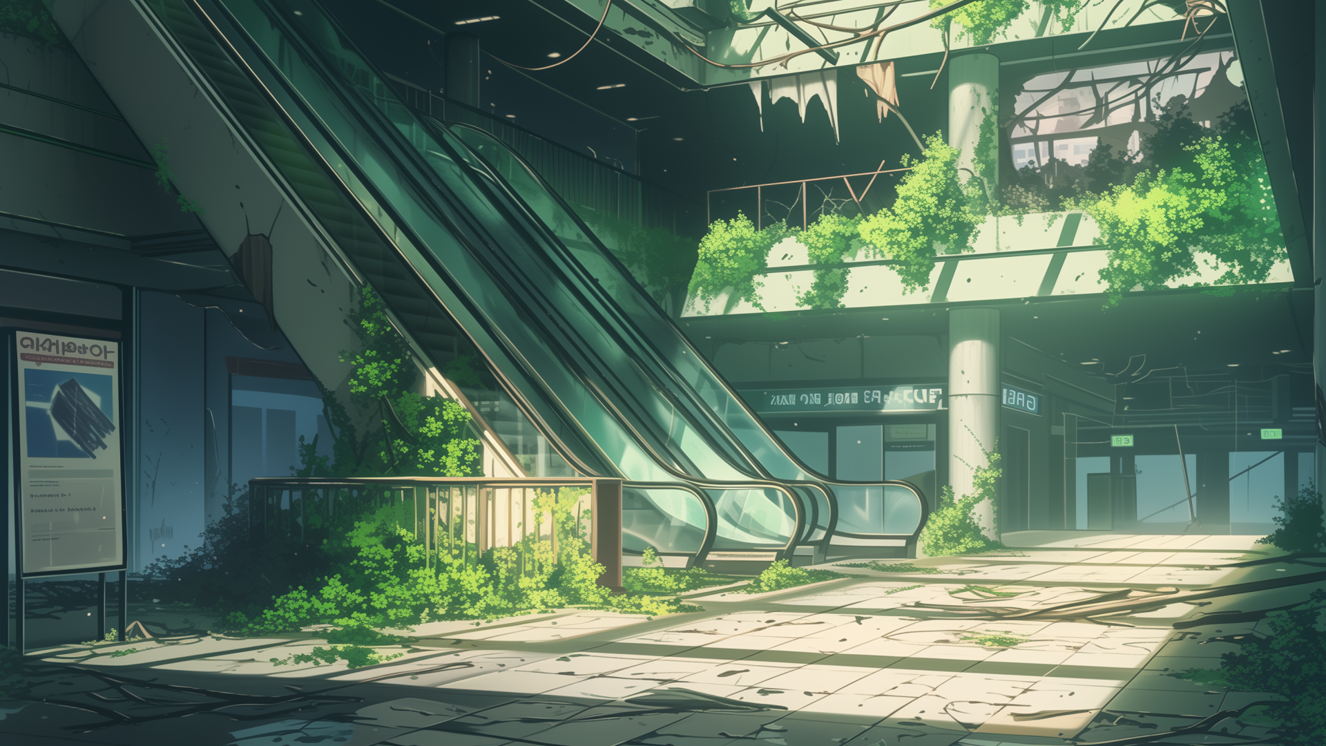 時間が止まったかのようなショッピングモールの墟。エスカレーターに絡みつく植物とひび割れた床が、文明崩壊後の世界をリアルに表現。TRPG向けのフリー背景素材。