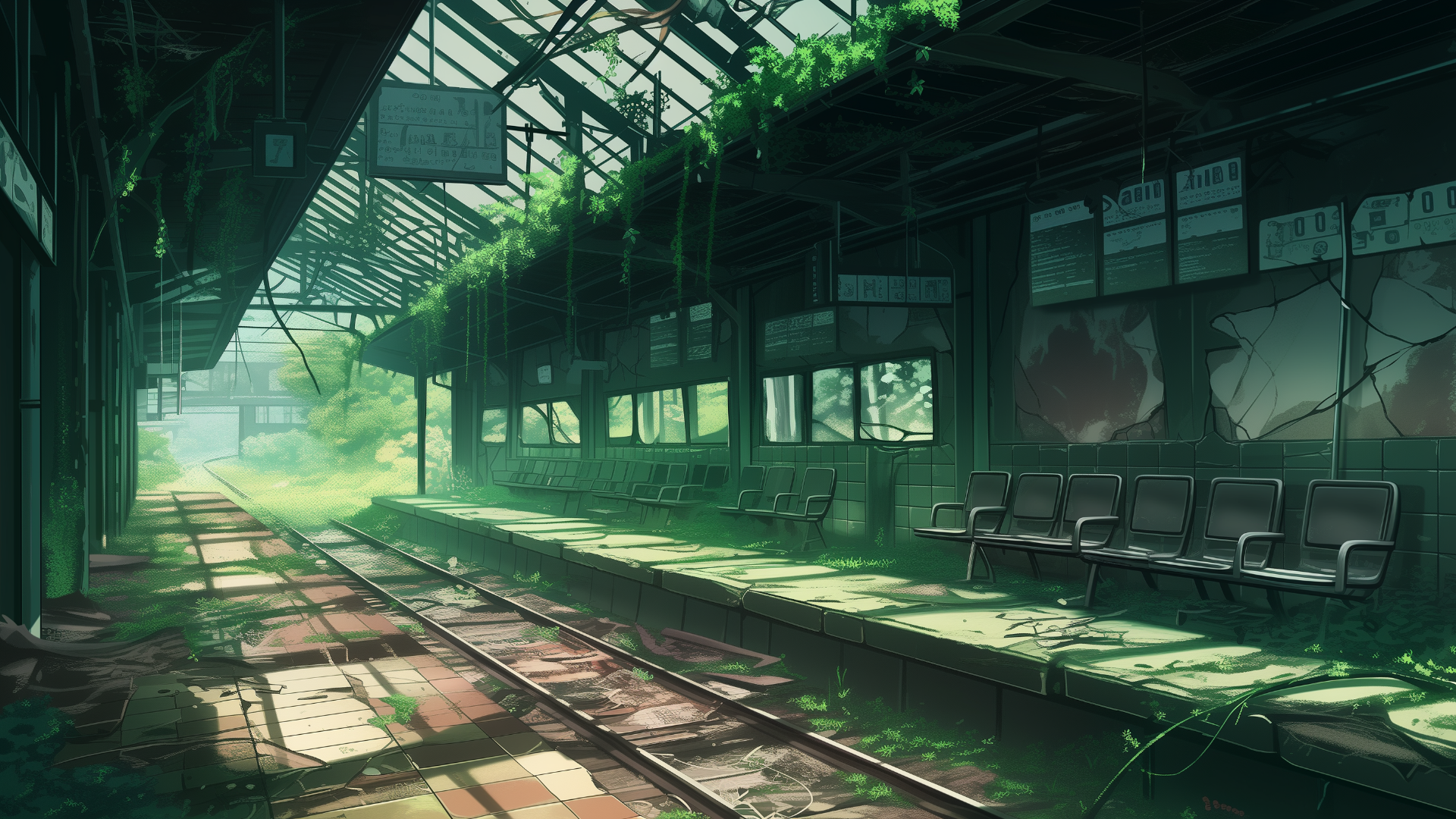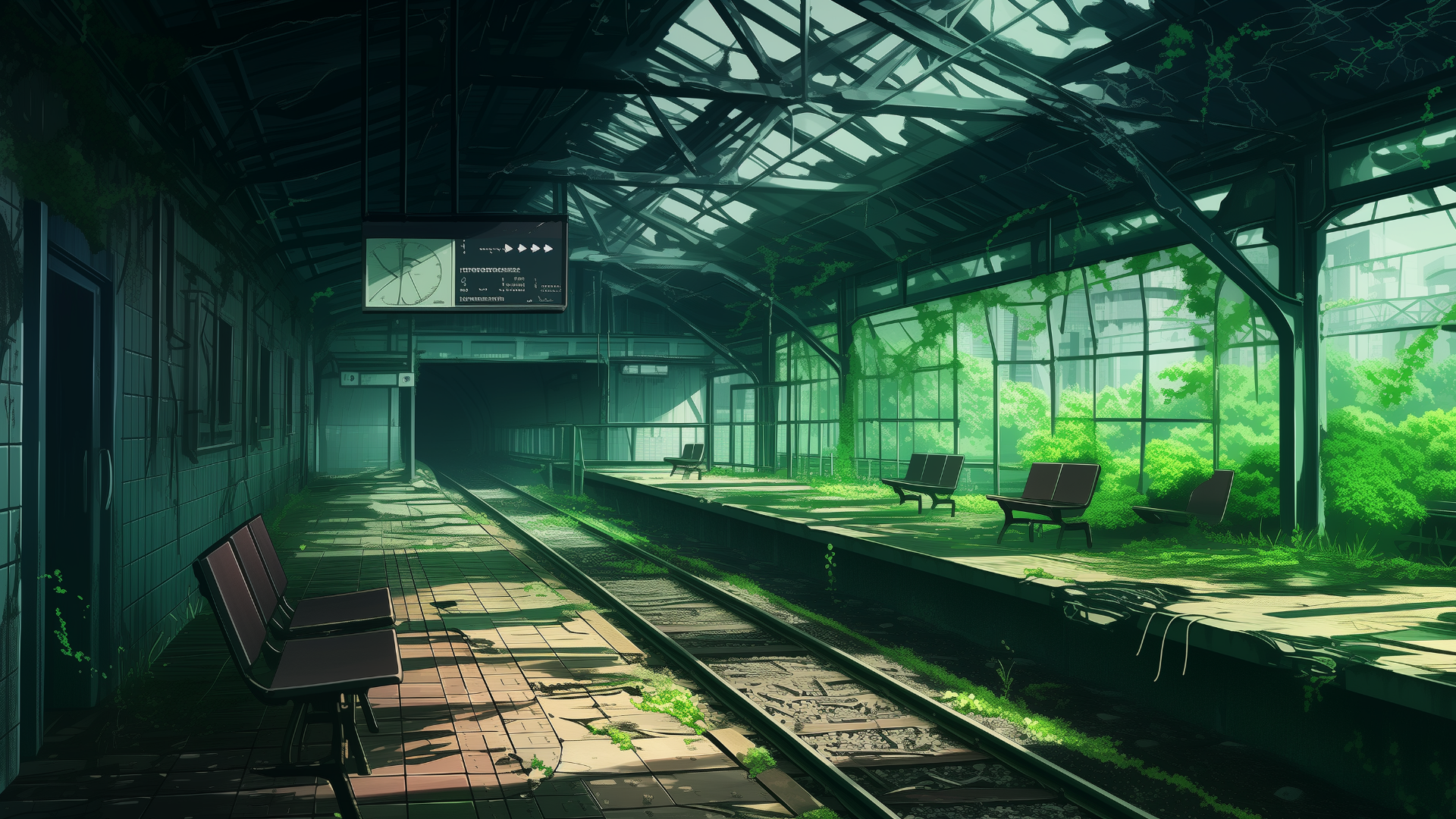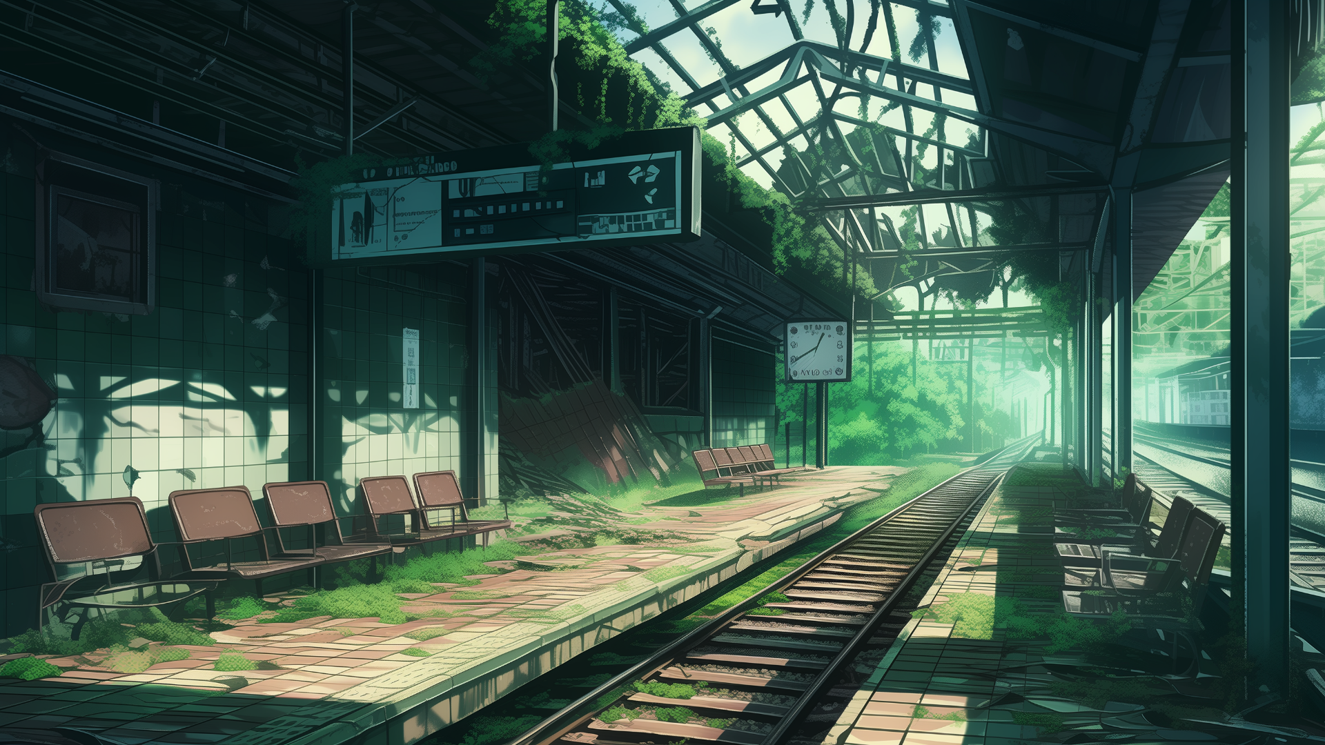 荒れ果てた駅構内。崩れた天井から差し込む光が、草木に覆われたベンチを照らしている。サバイバル系やディストピアが舞台のTRPGシナリオに適した背景画像。