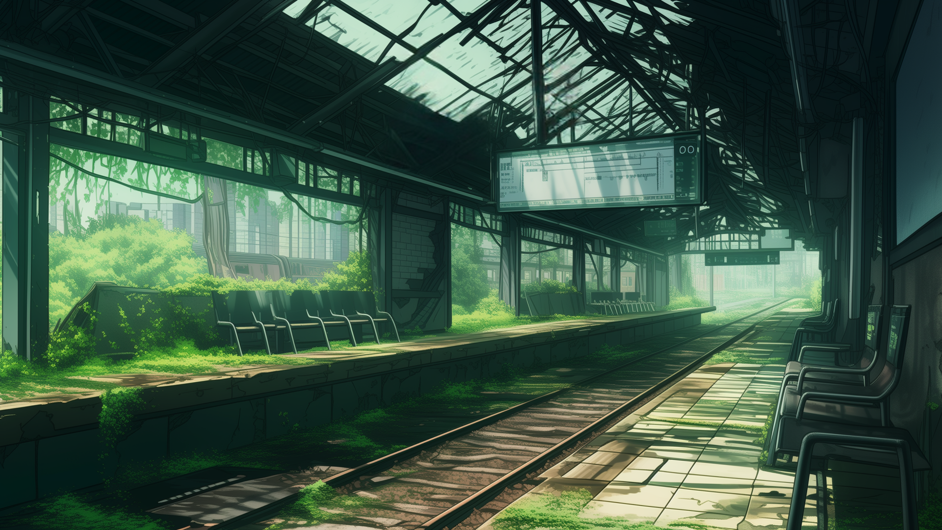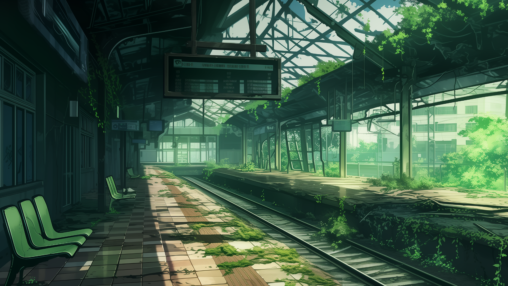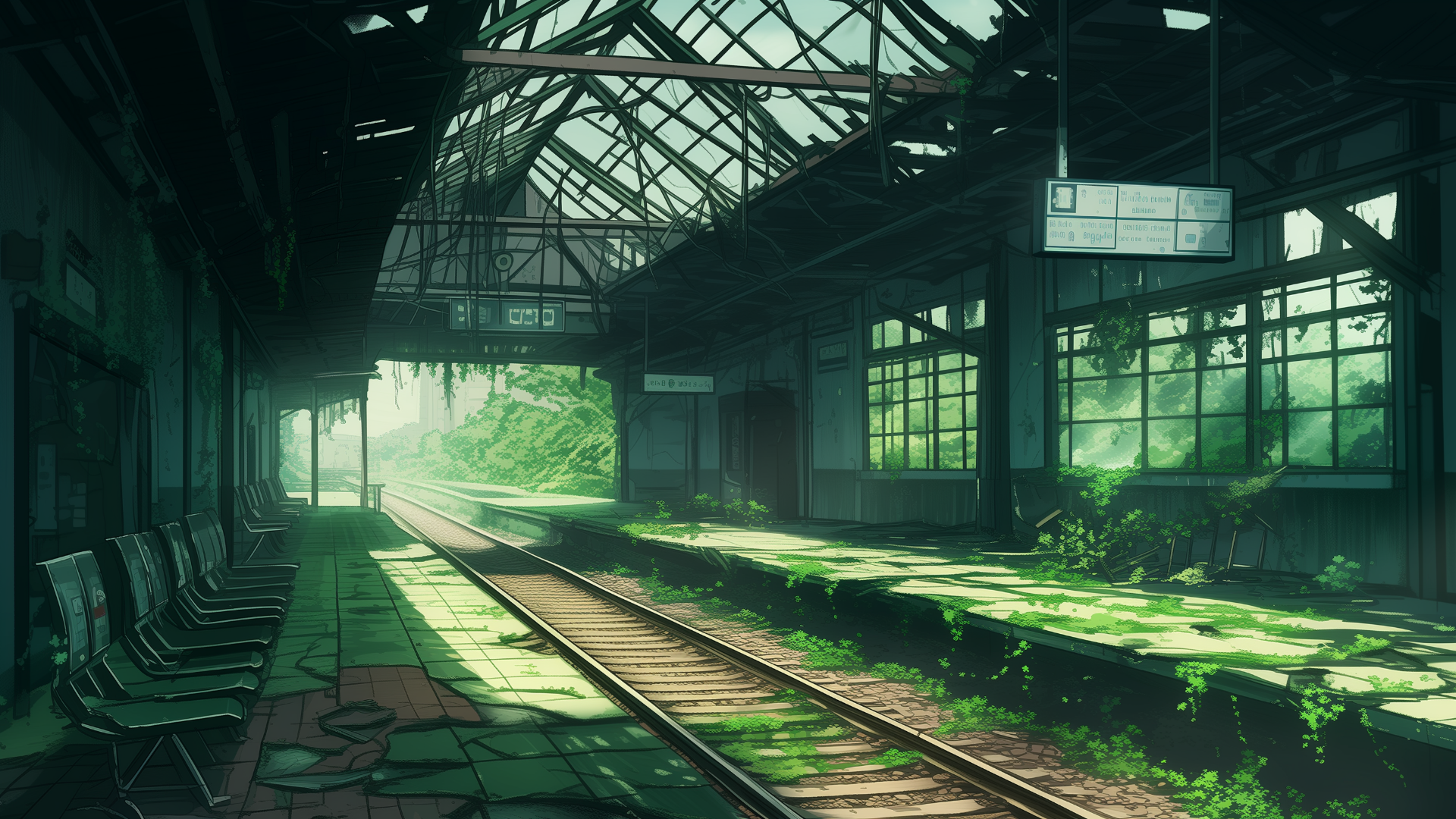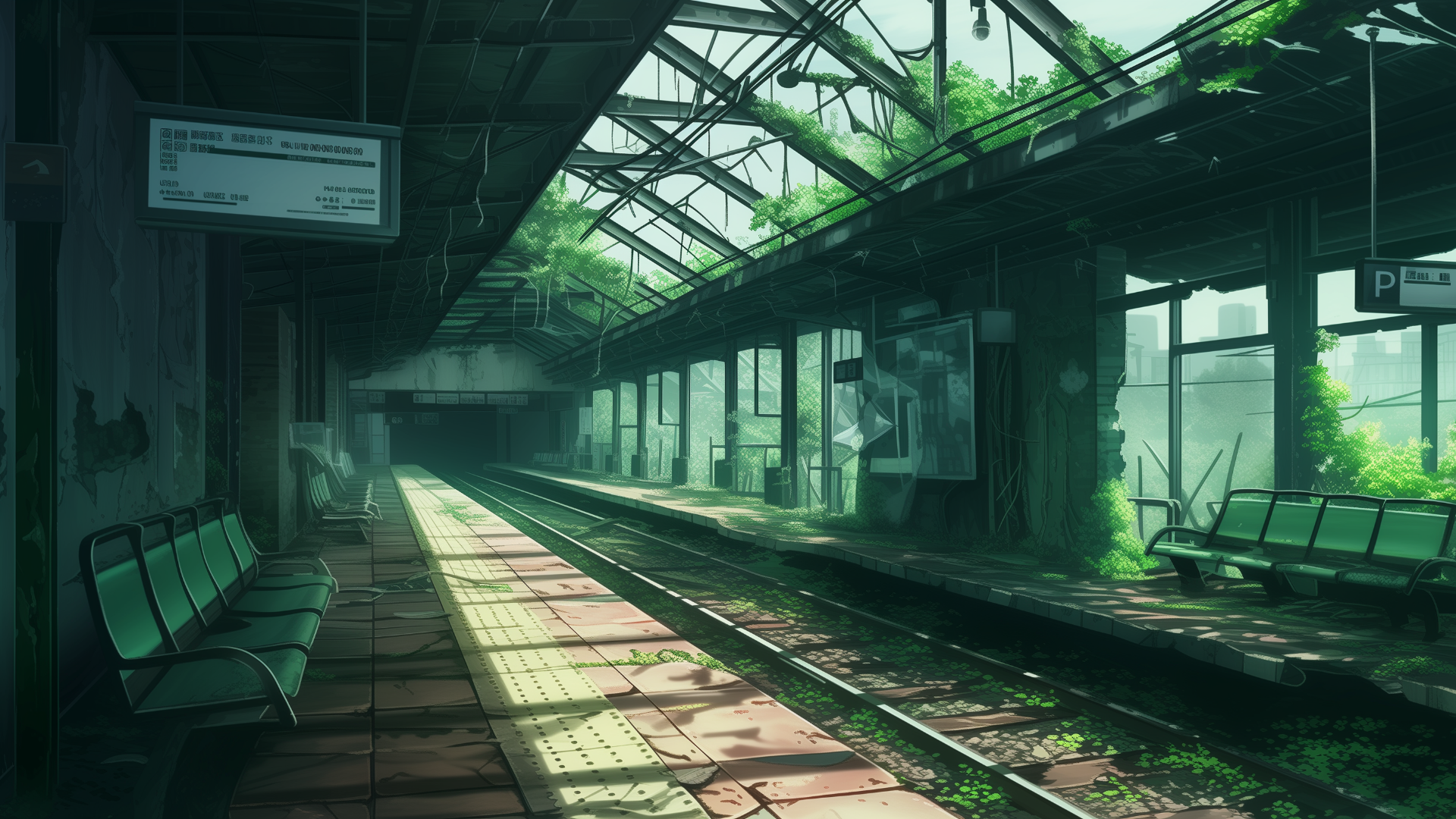 荒れ果てた駅構内。崩れた天井から差し込む光が、草木に覆われたベンチを照らしている。サバイバル系やディストピアが舞台のTRPGシナリオに適した背景画像。