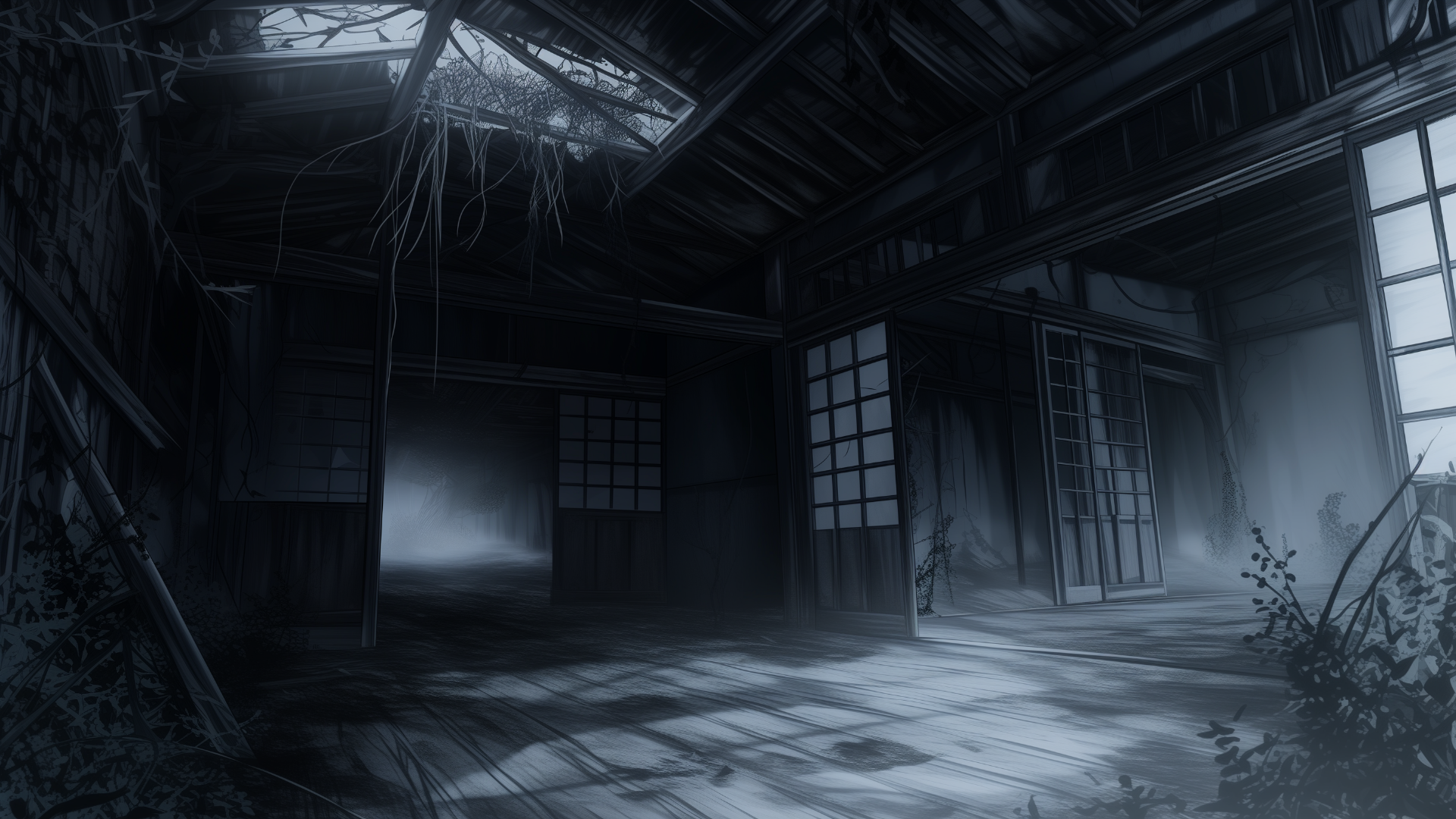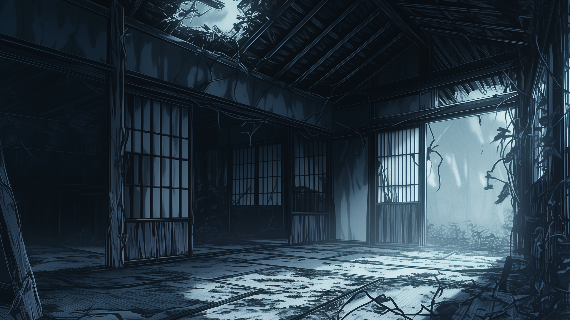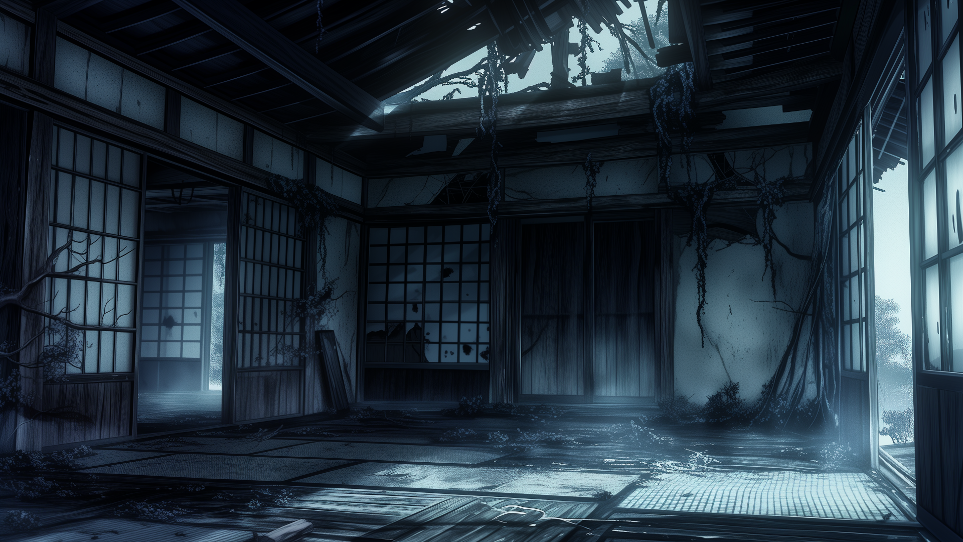 abandoned-building, japanese-room, shoji, collapsed-roof, dark