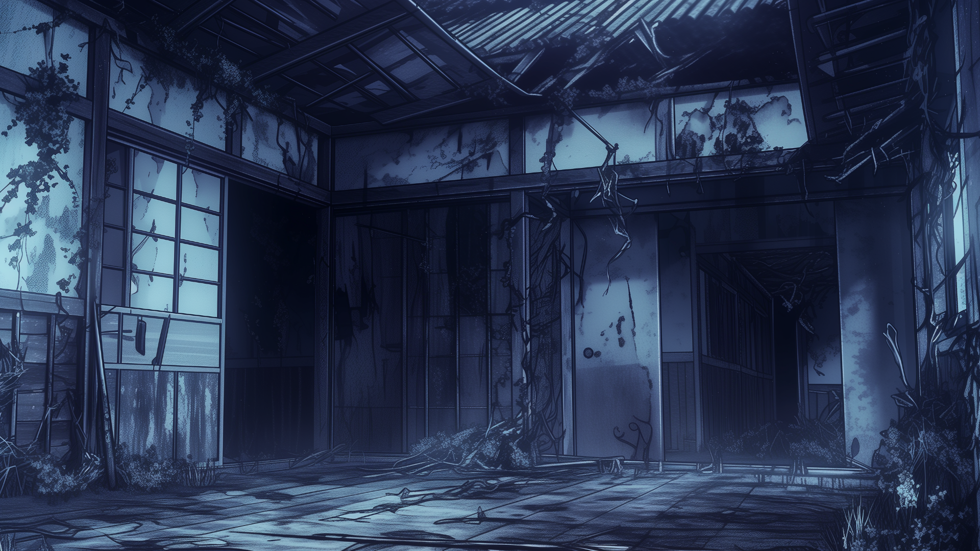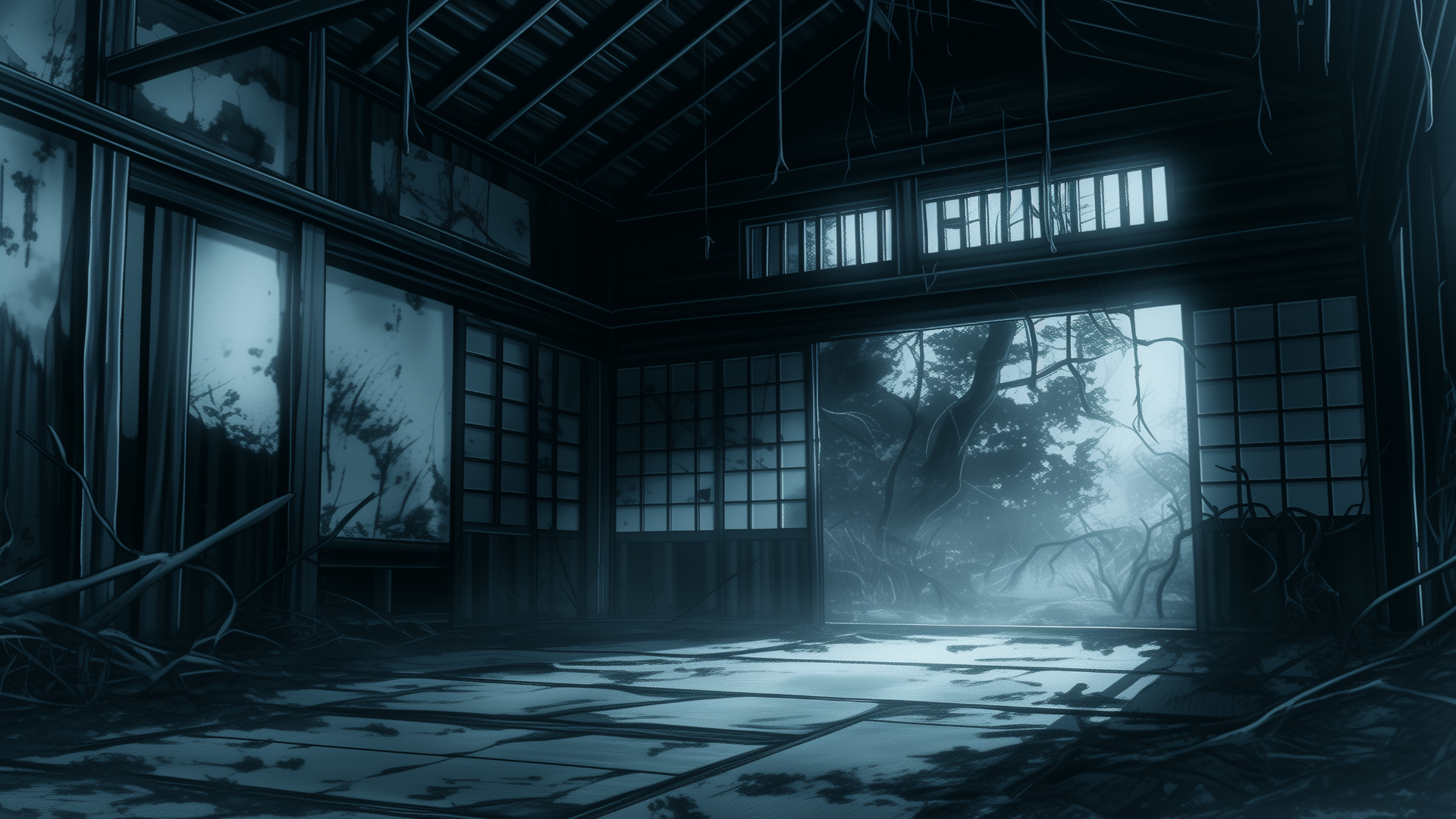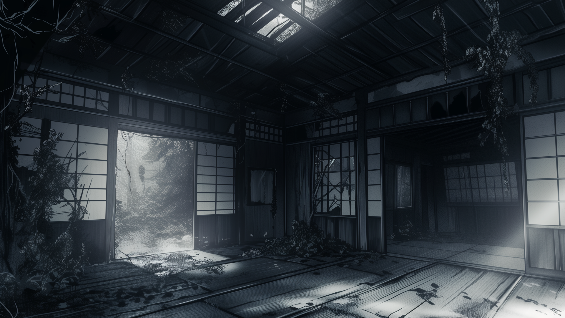 abandoned-building, japanese-room, shoji, collapsed-roof, dark