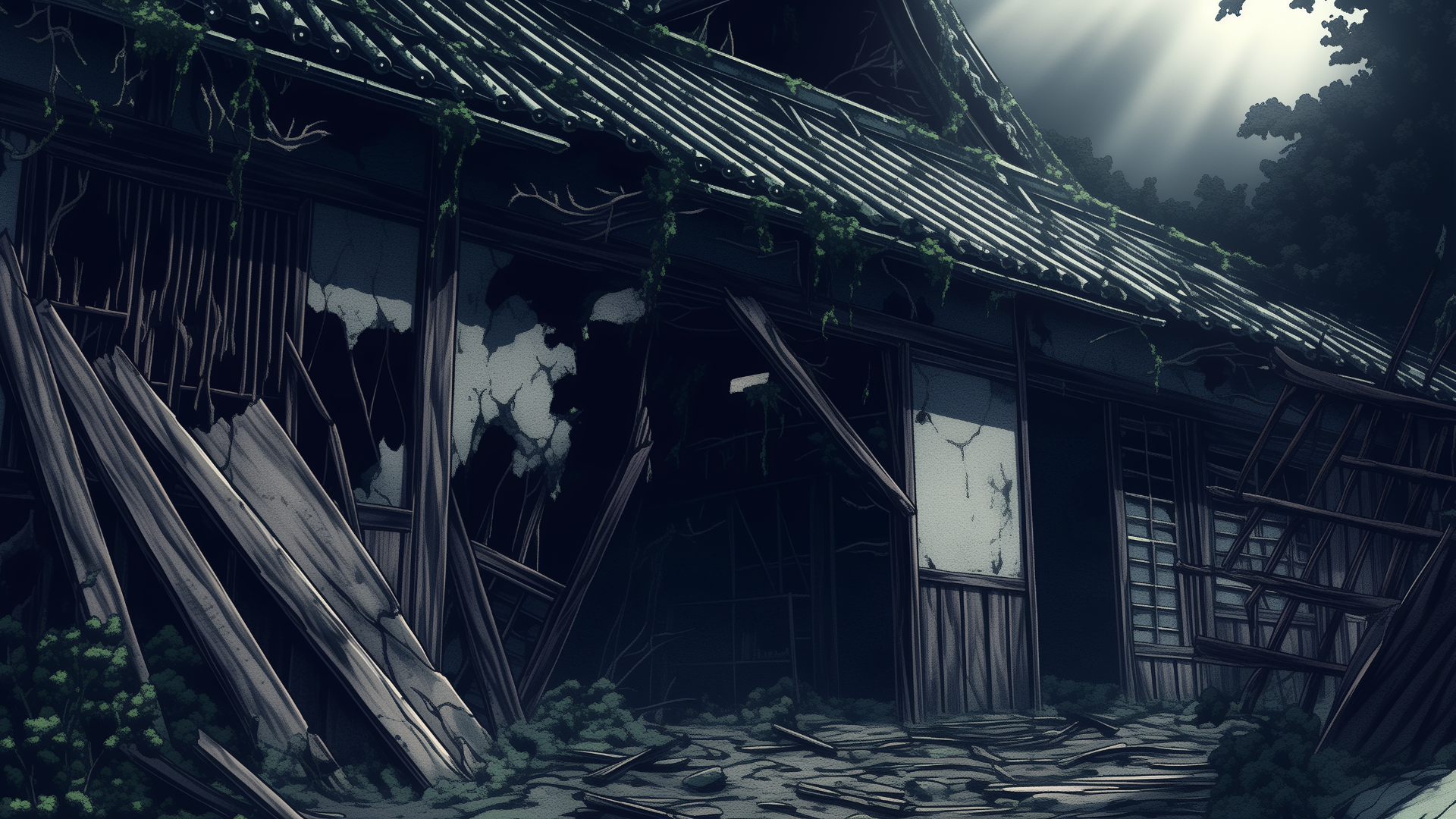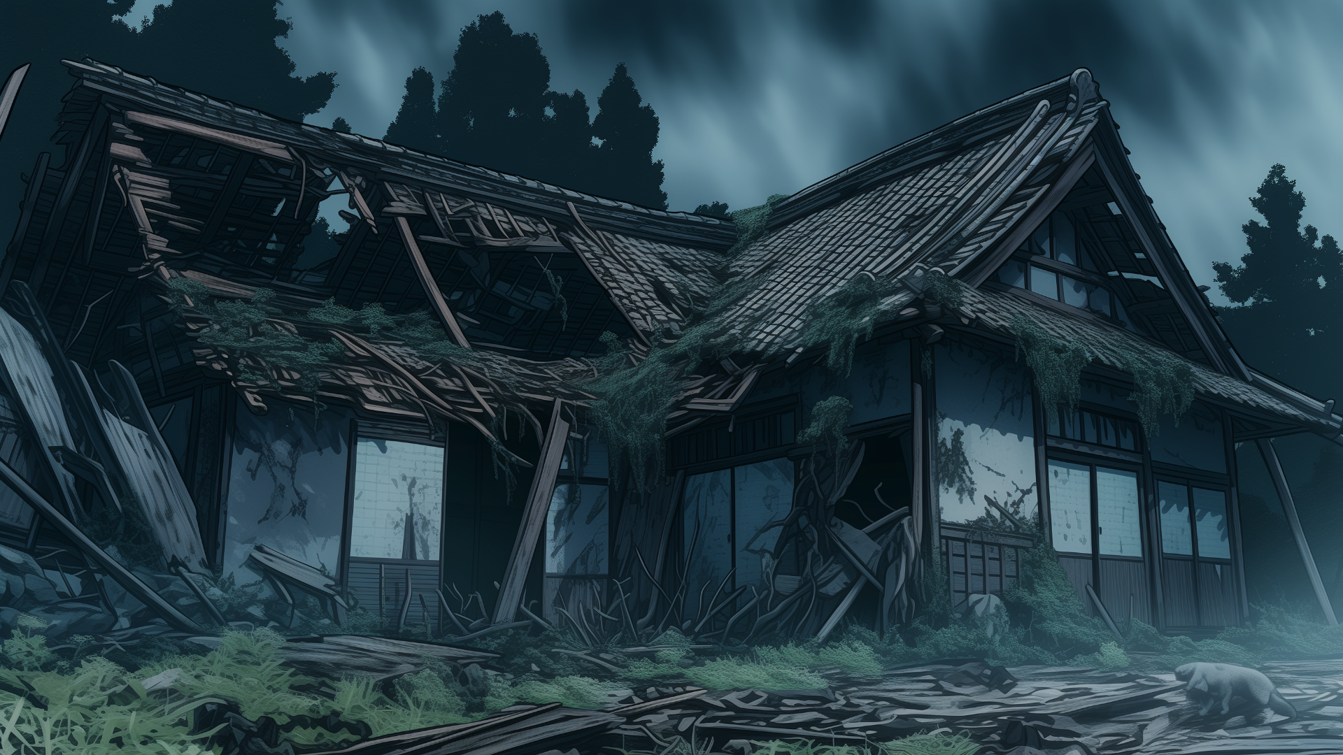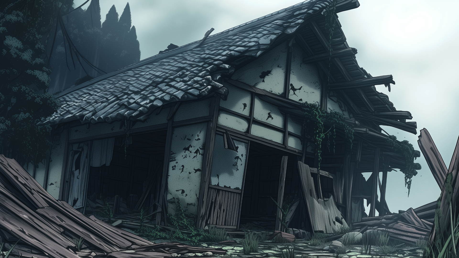 廃村にあるボロボロな蔵のフリー背景素材です。
