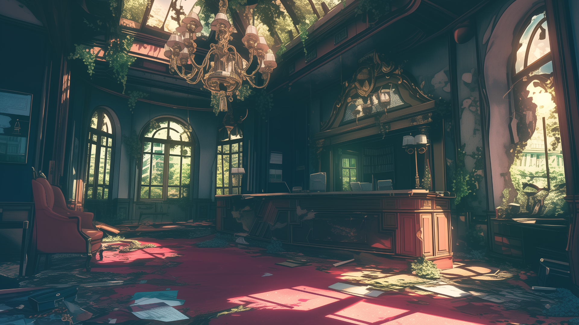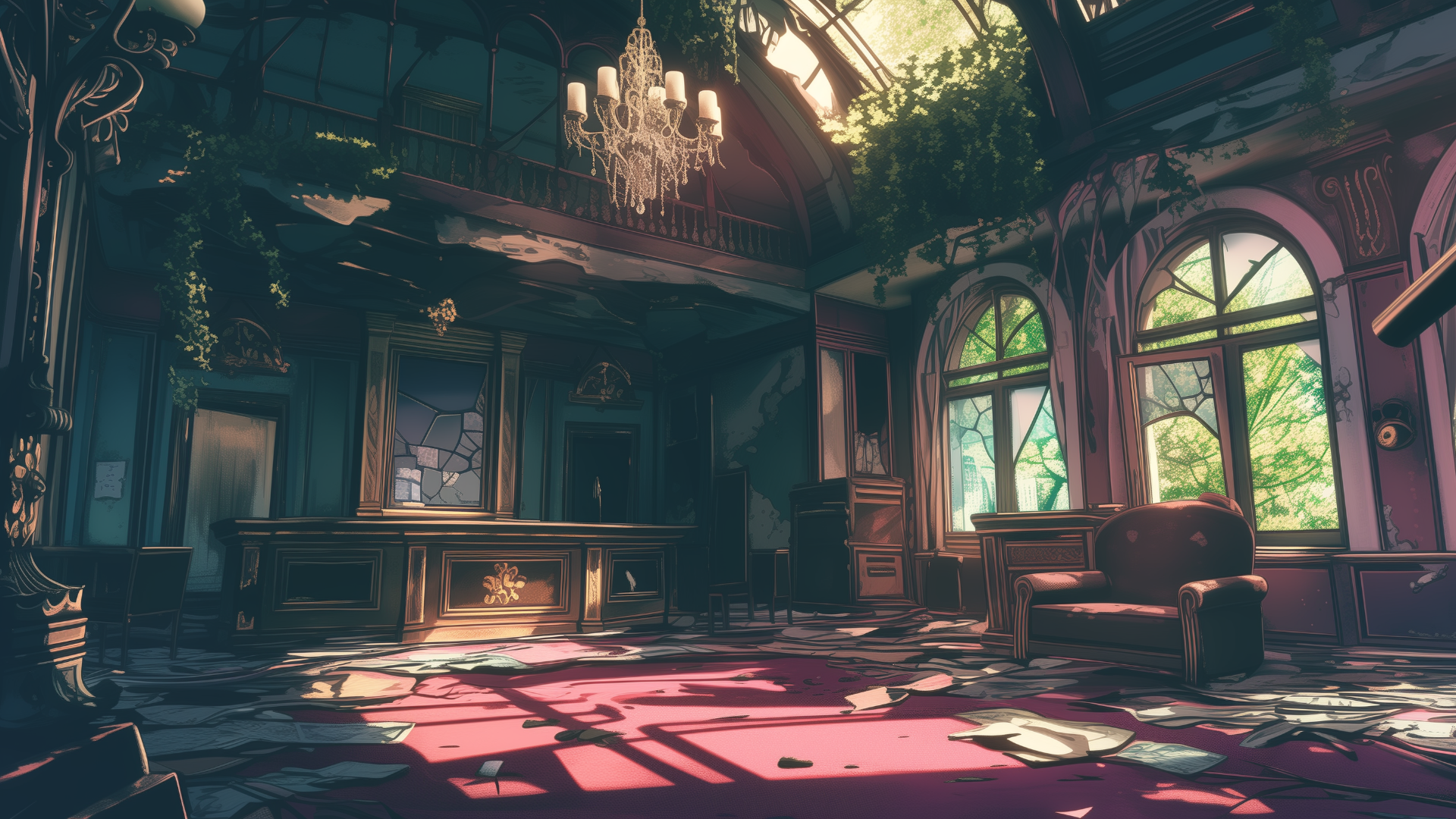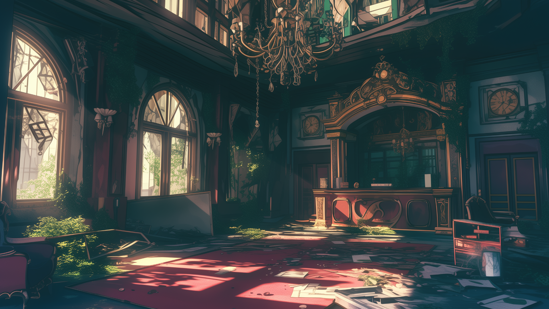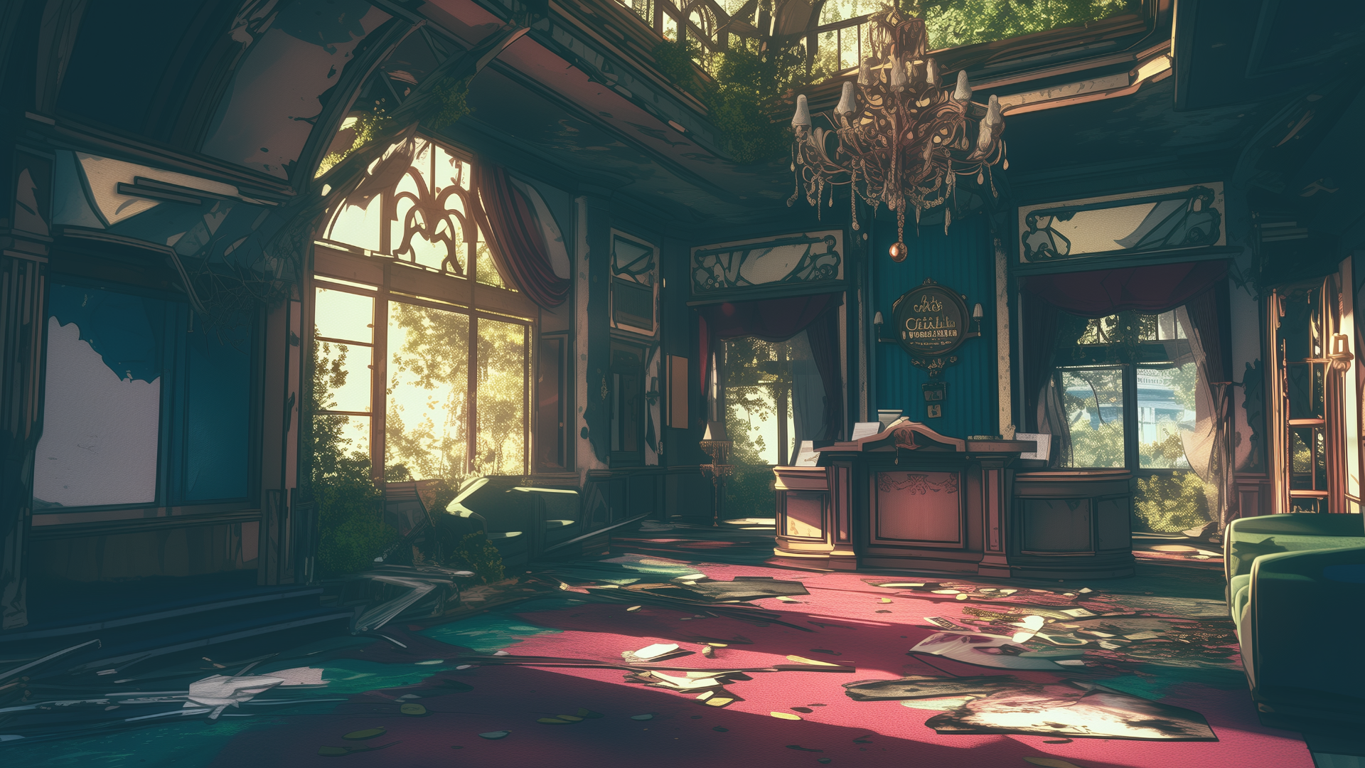 荒れた内装と装飾が残る、廃墟化したホテルのロビーを描いたフリー背景素材です。