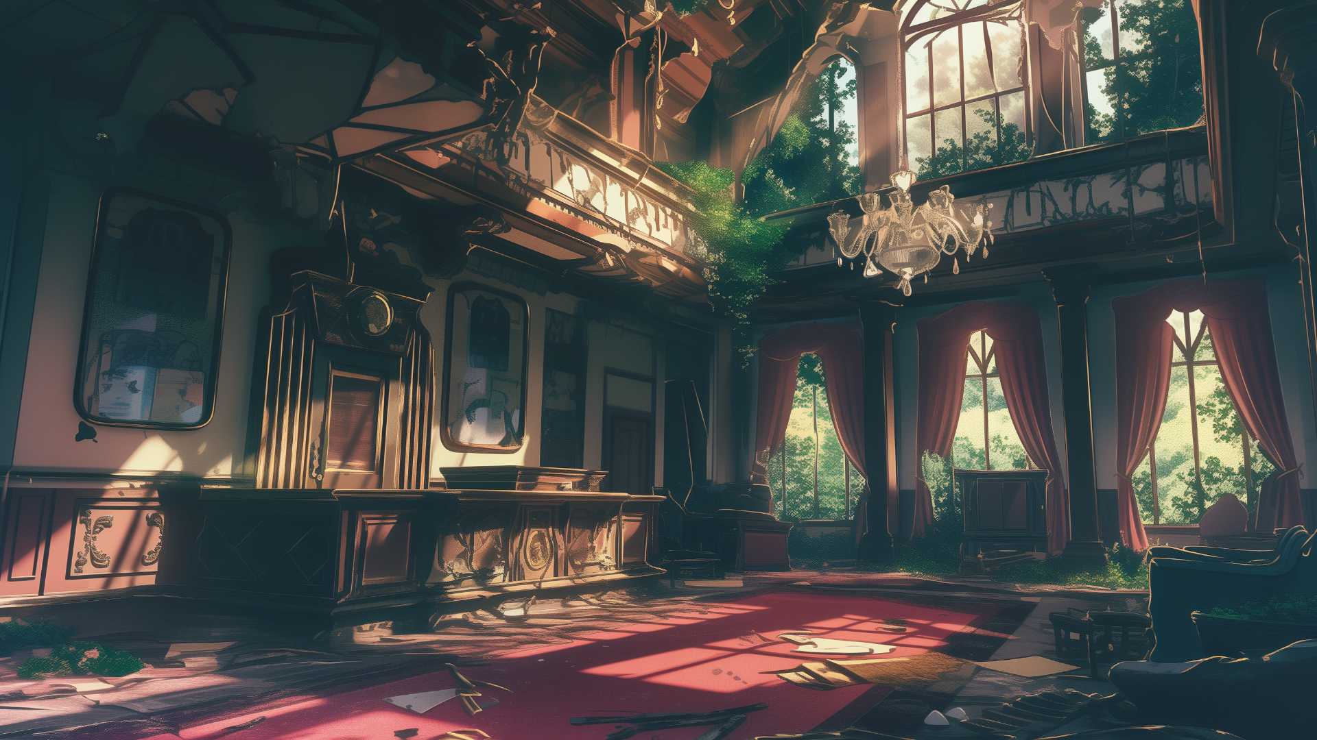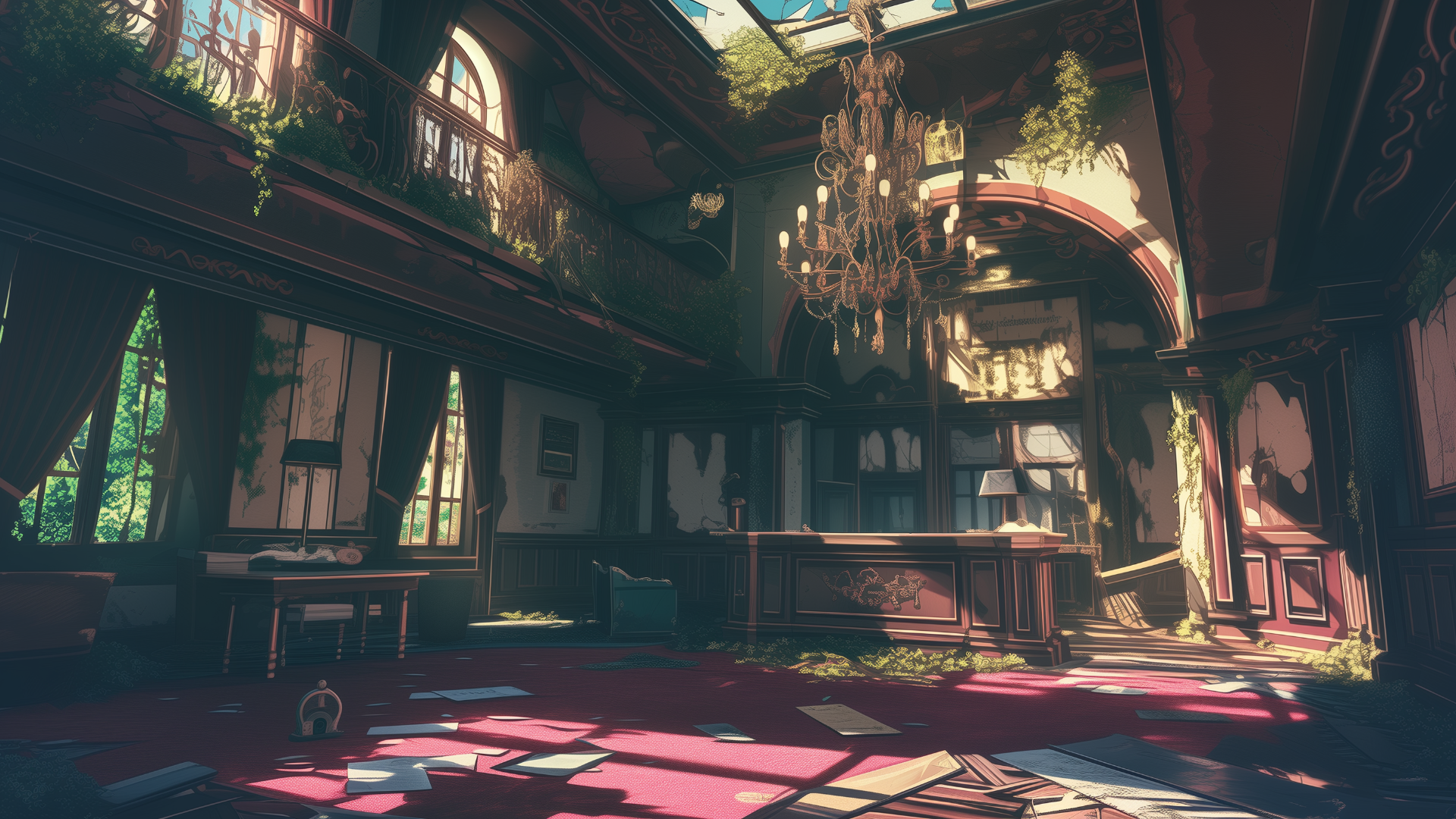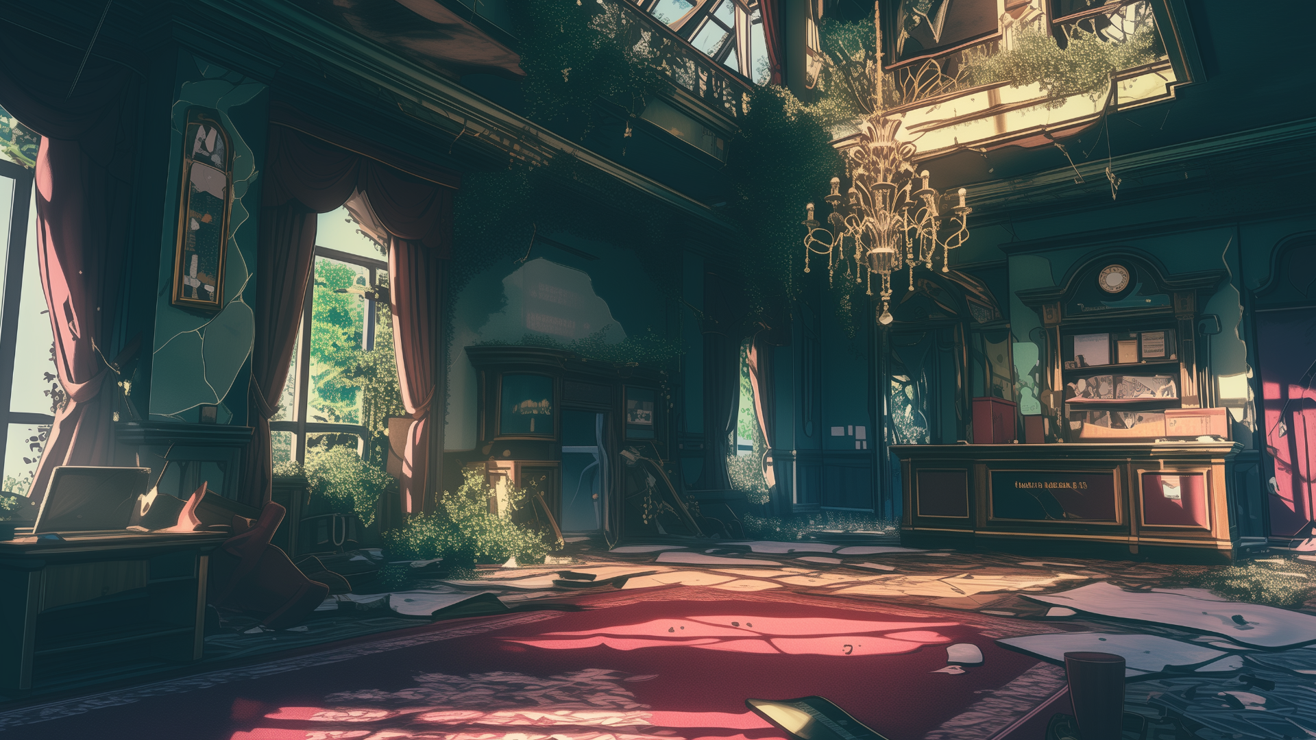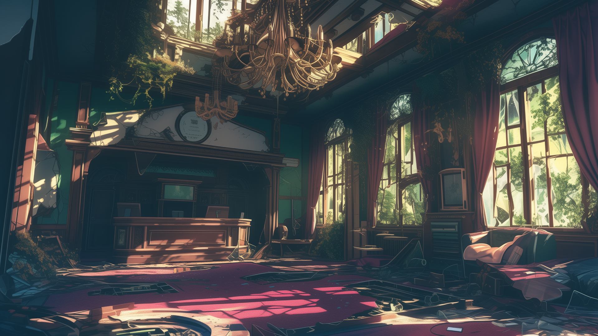 荒れた内装と装飾が残る、廃墟化したホテルのロビーを描いたフリー背景素材です。