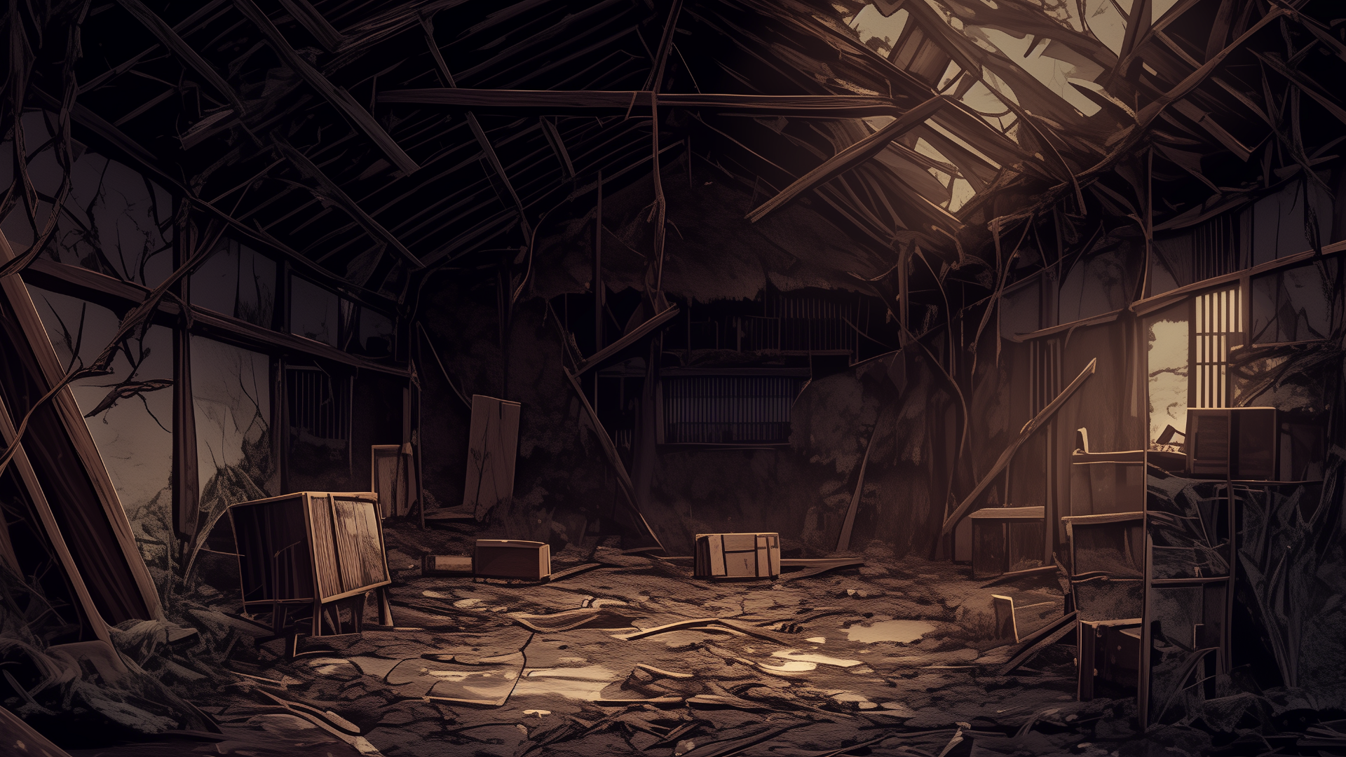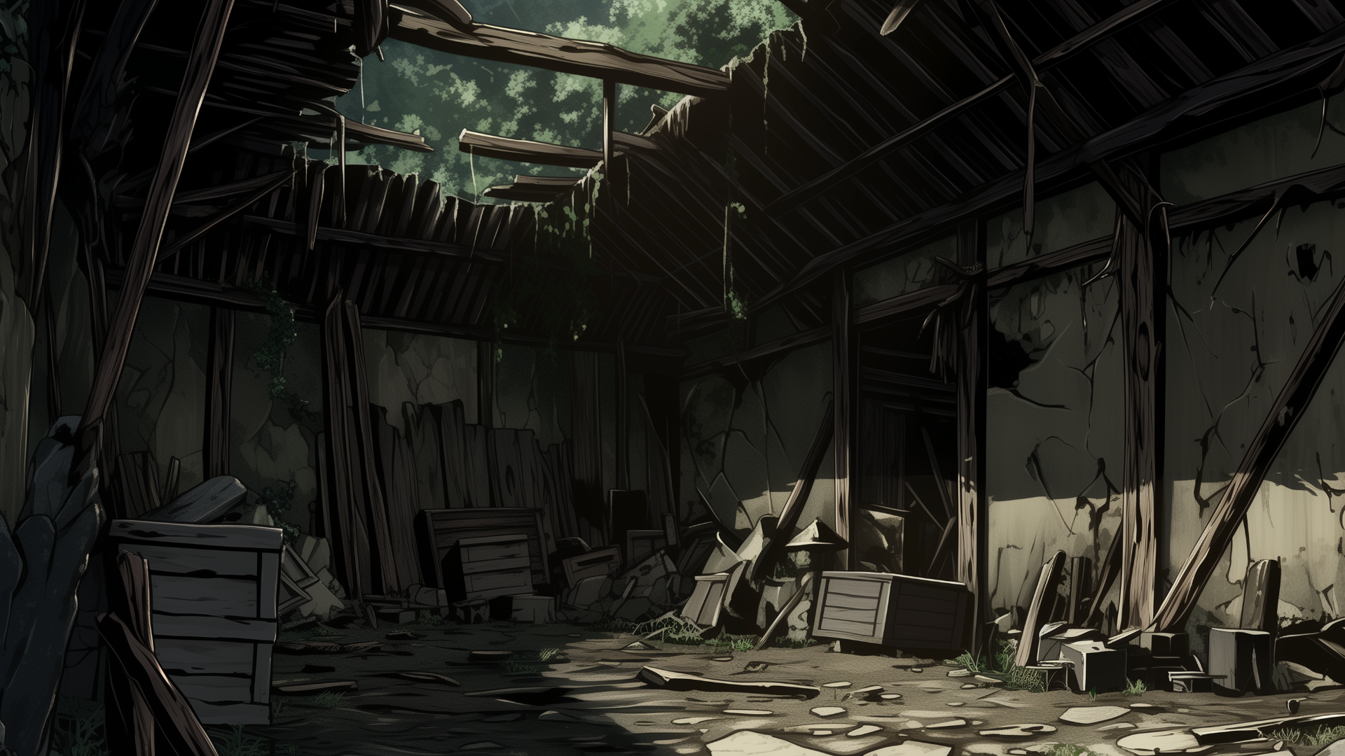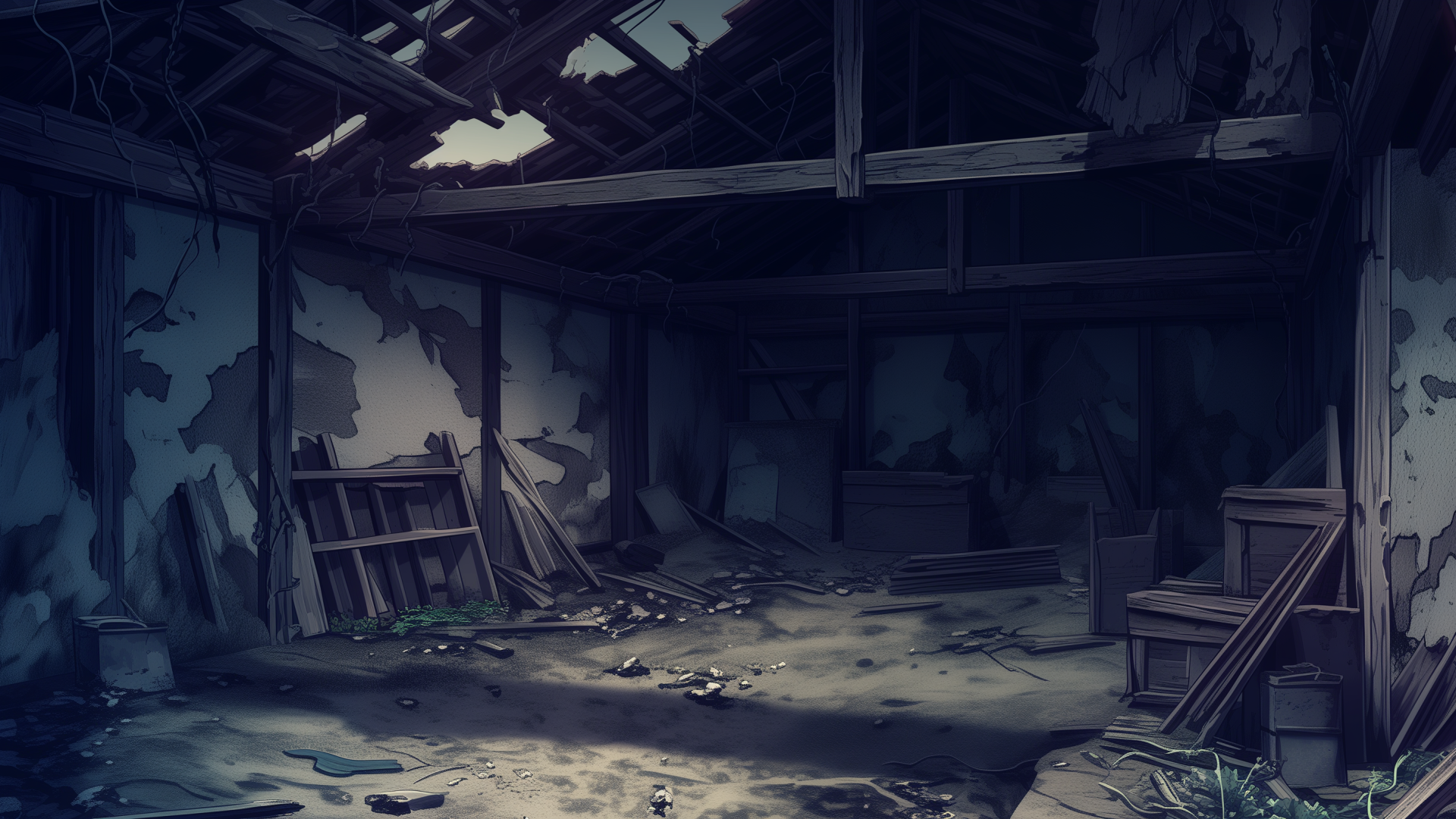abandoned-house, storehouse, collapsed-roof, scattered, neglected