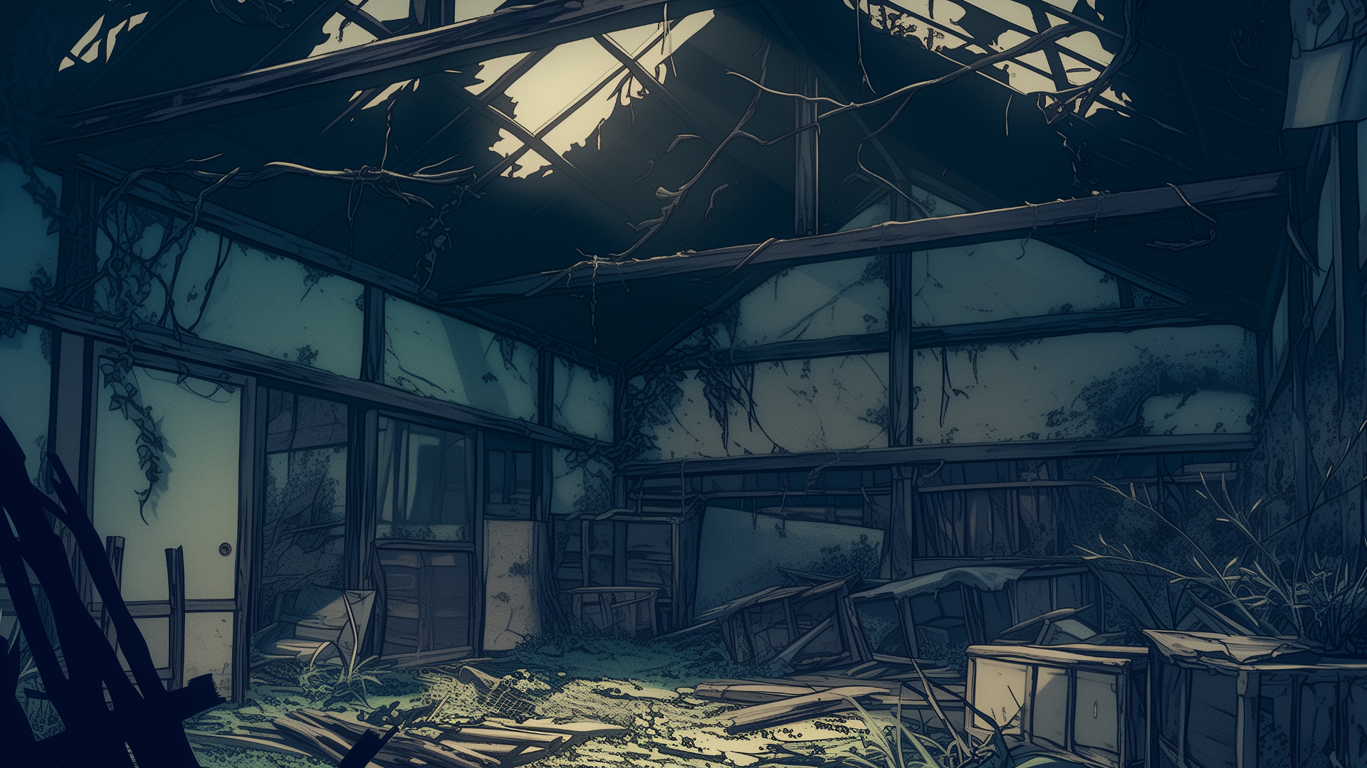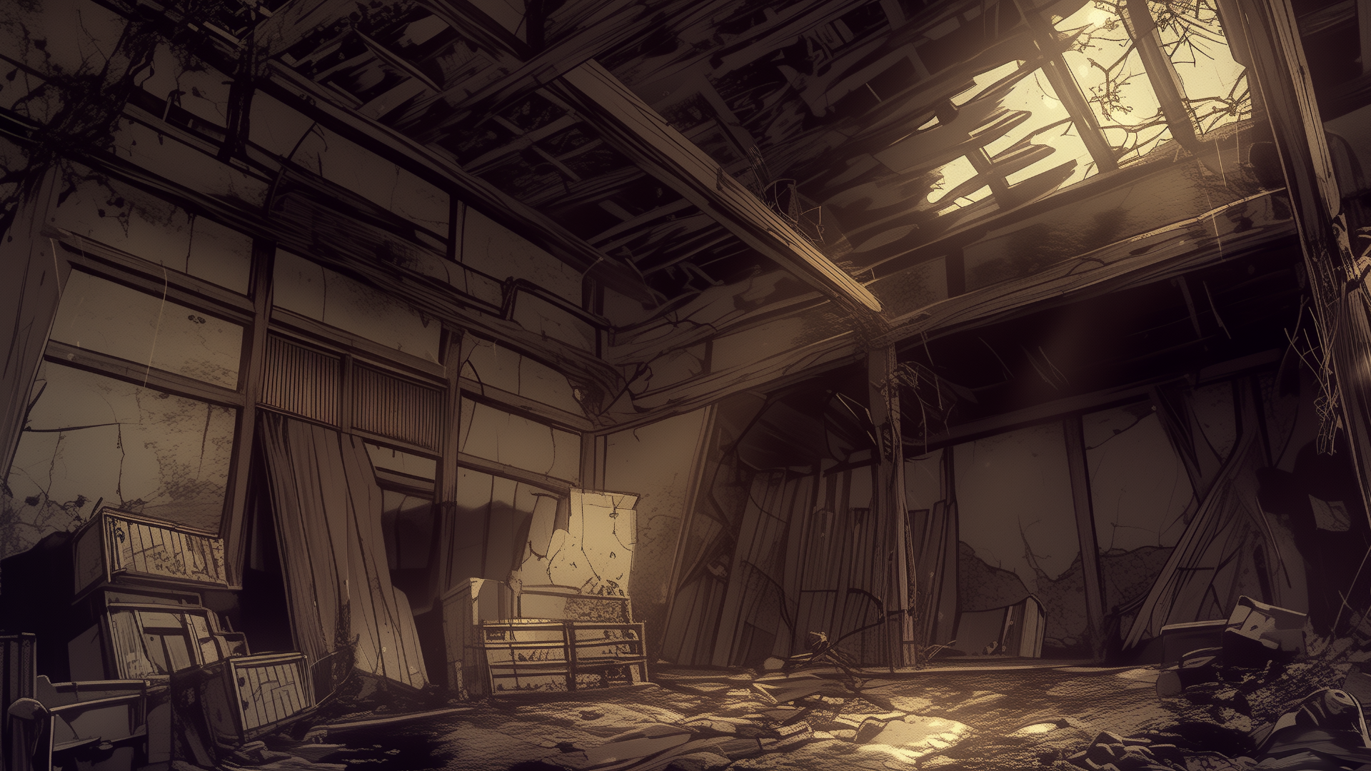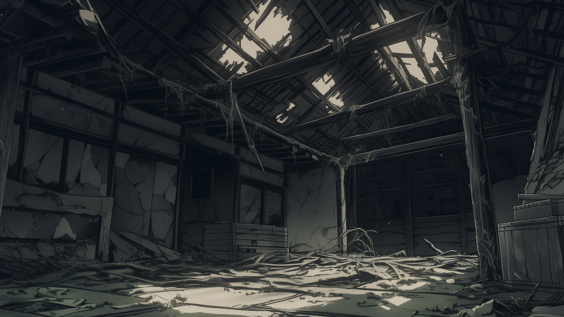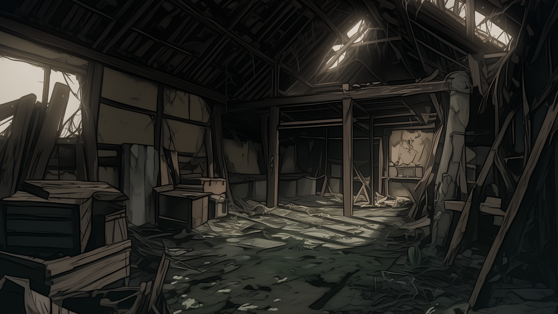 abandoned-house, storehouse, collapsed-roof, scattered, neglected