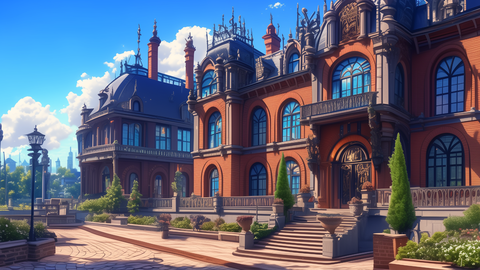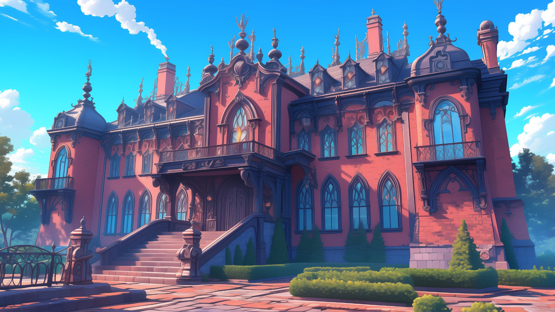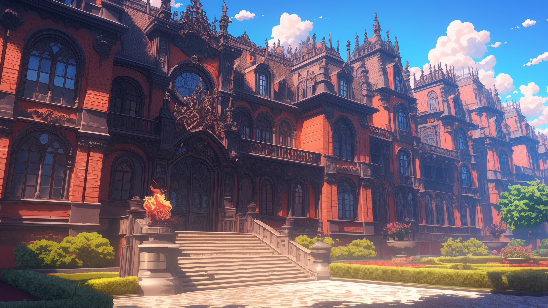 魔法学校の寮(炎属性・夕方)、外観のフリー背景素材です。 当サイトの背景素材はAIで生成したイラストです。 まとめてダウンロードしたい方は↓のボタンからどうぞ! 一…
