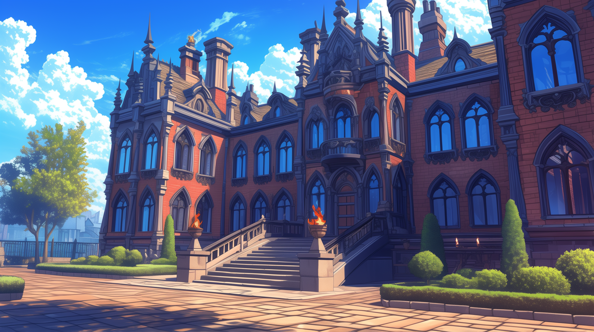 魔法学校の寮(炎属性・夜)、外観のフリー背景素材です。 当サイトの背景素材はAIで生成したイラストです。 まとめてダウンロードしたい方は↓のボタンからどうぞ! 一括…
