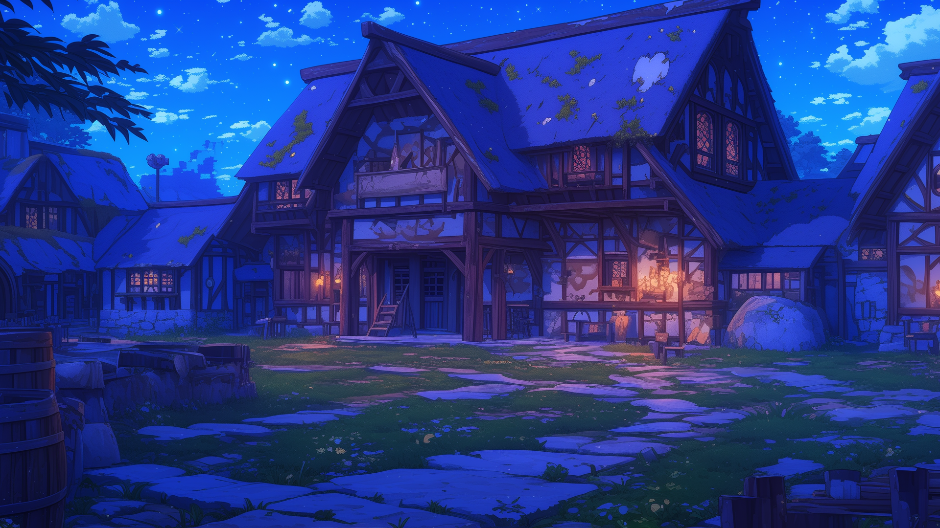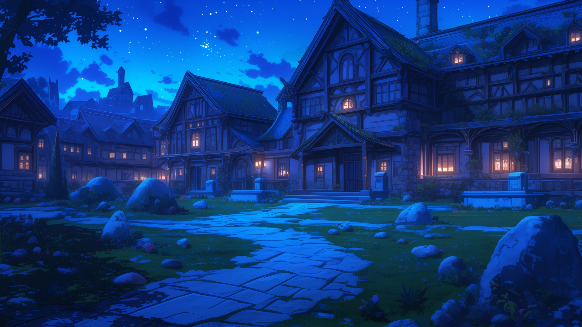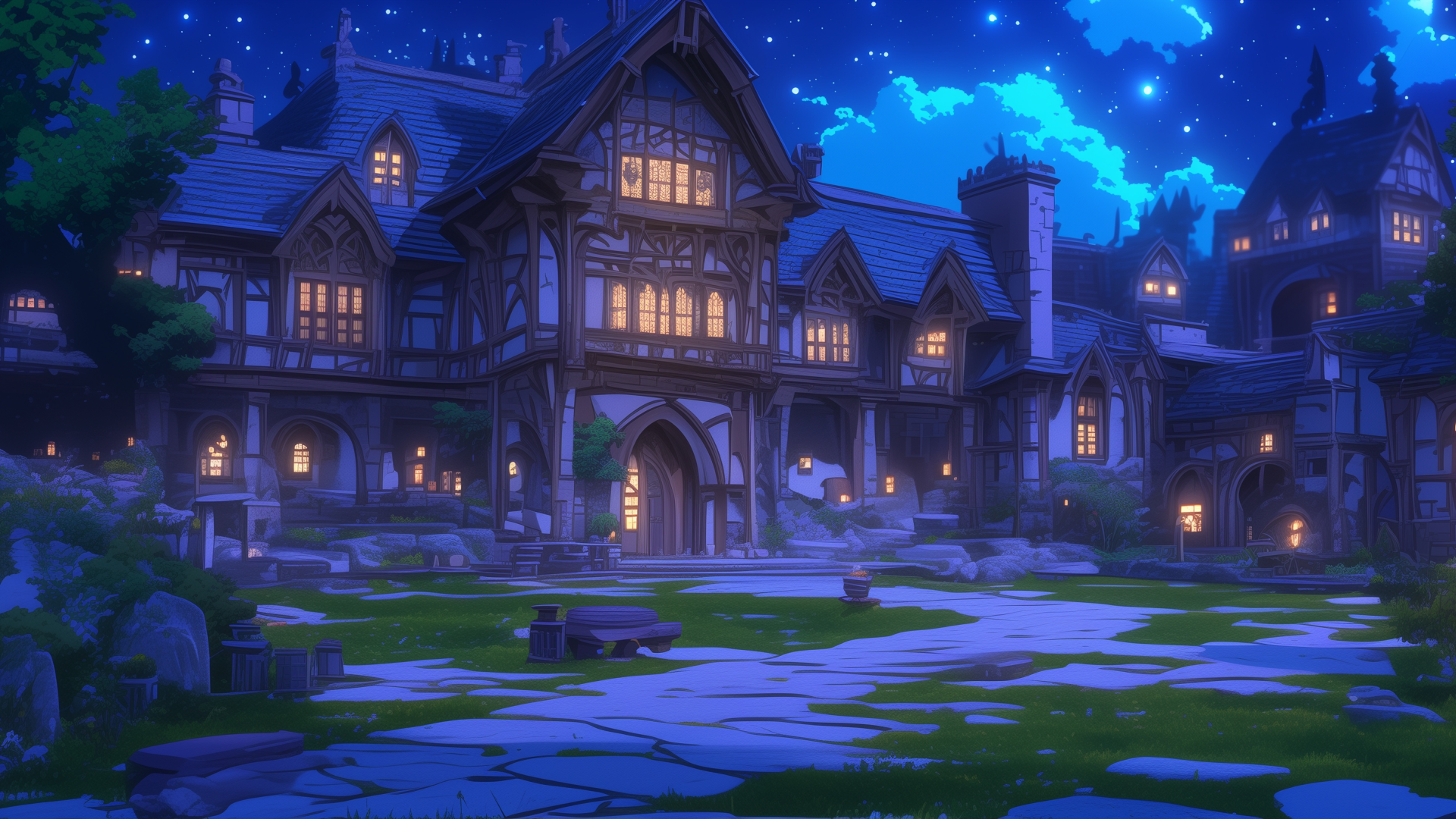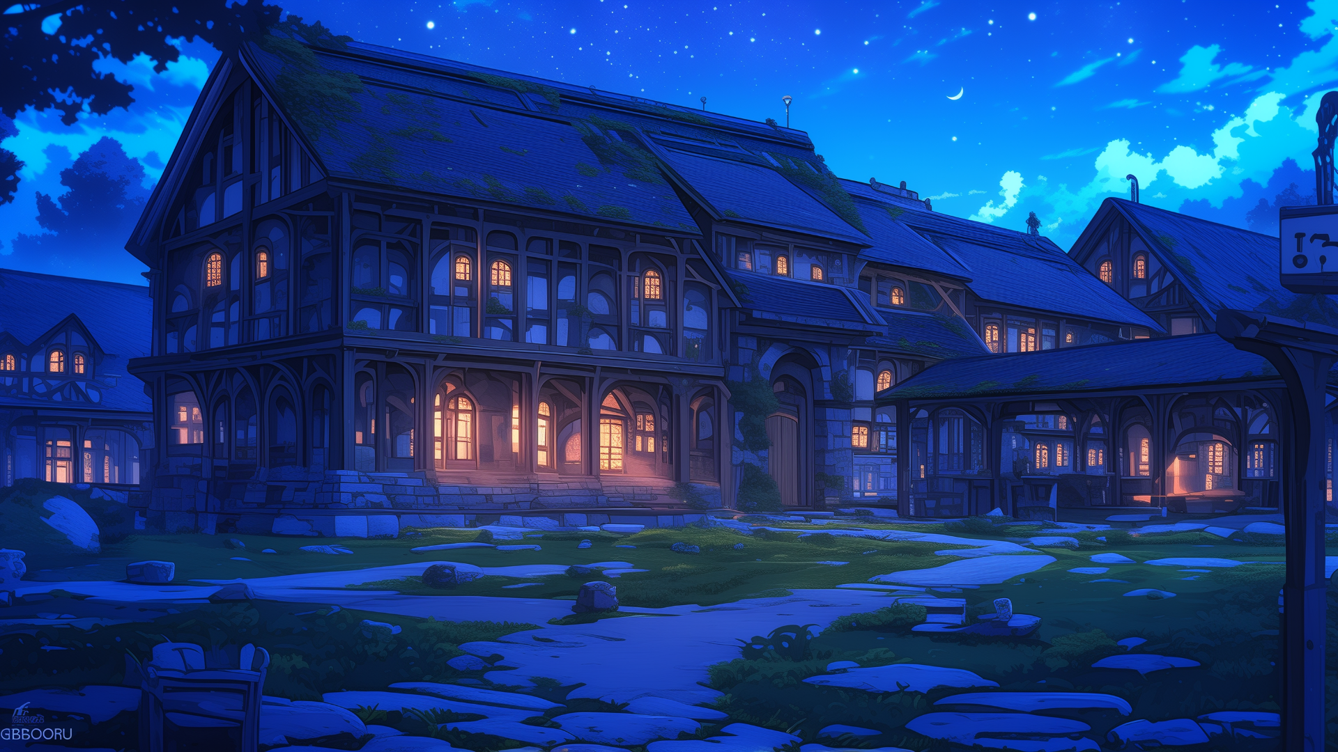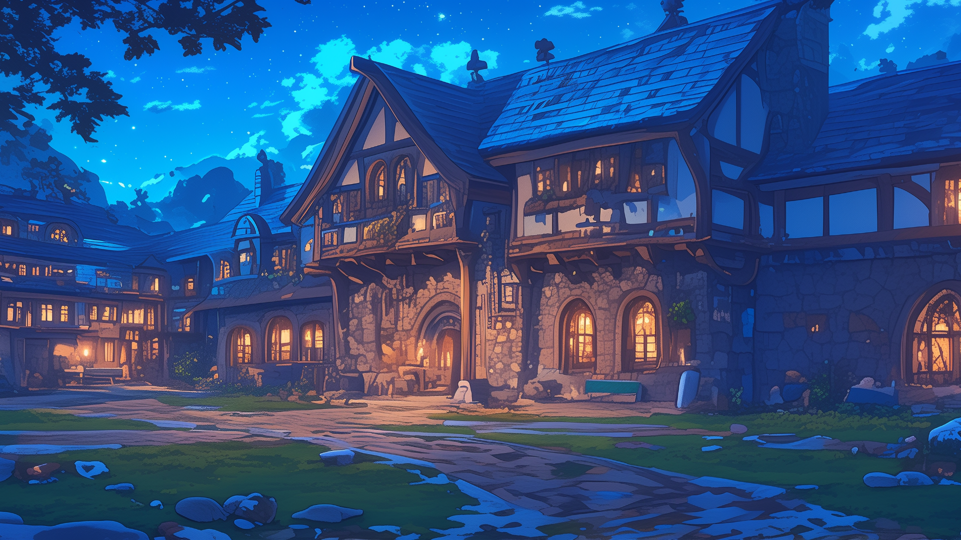 木製の梁と石壁が特徴の建物が、中庭に面して佇む夜の風景。地面には岩が点在し、建物の窓からはあたたかい光が漏れている。田舎の寄宿舎や魔法世界の学生寮として活用できる背景素材です。