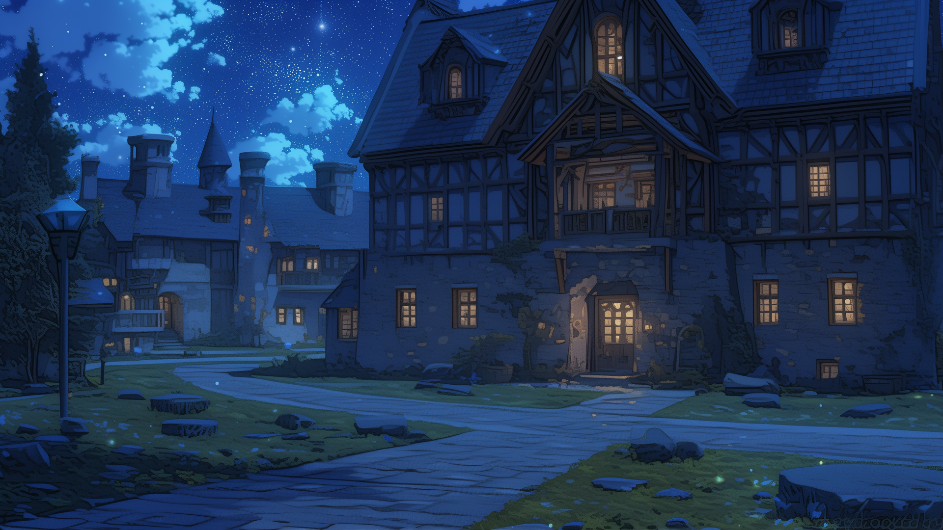 魔法学校の寮(地属性・夜)、外観のフリー背景素材です。