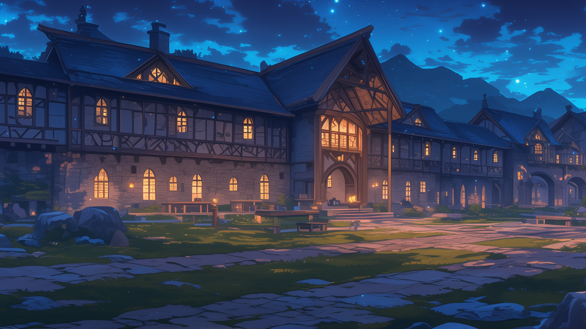 夜空の下、山間に建てられた大きな木造建築が静かに佇んでいる。石畳の中庭にはベンチや灯火が点在し、幻想的な雰囲気を演出している。地属性の魔法寮や古代の学舎を表現するTRPG向けの背景画像です。