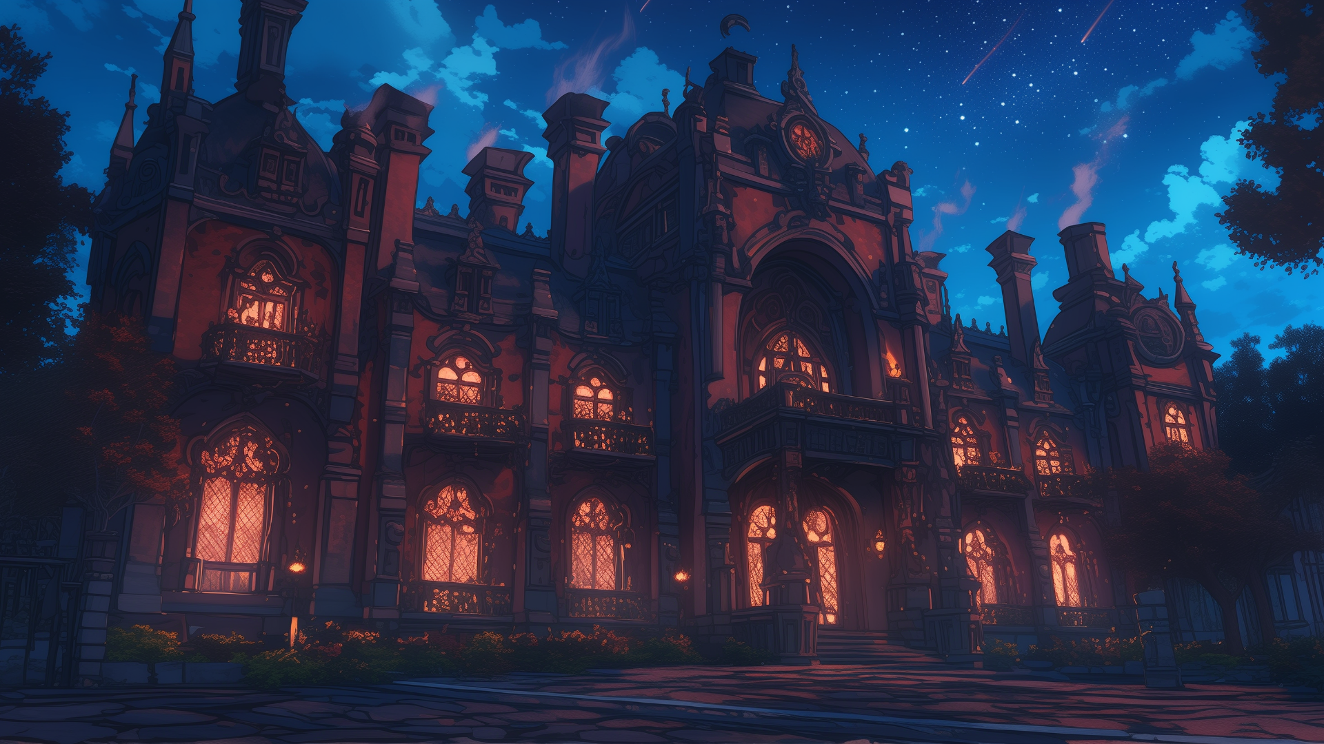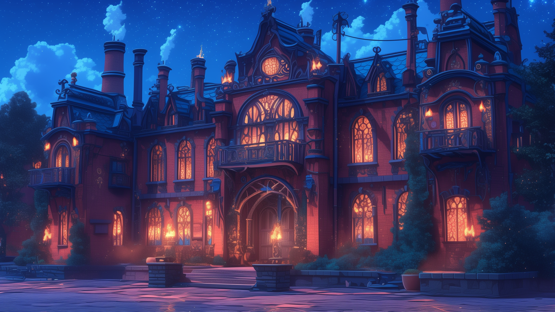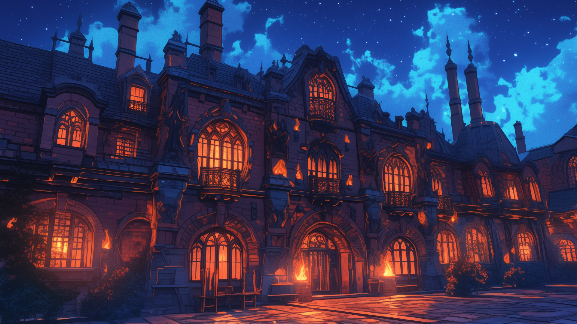 魔法学校の寮(炎属性・夜)、外観のフリー背景素材です。