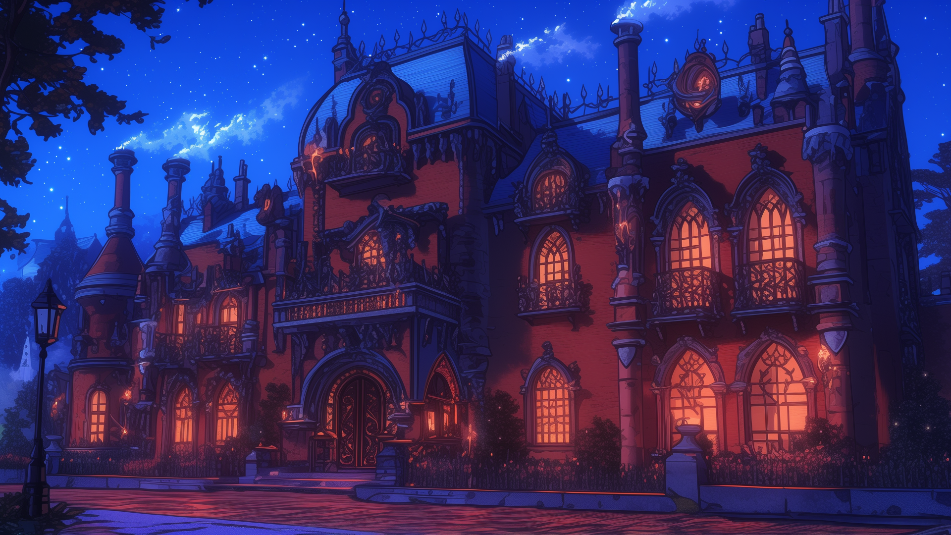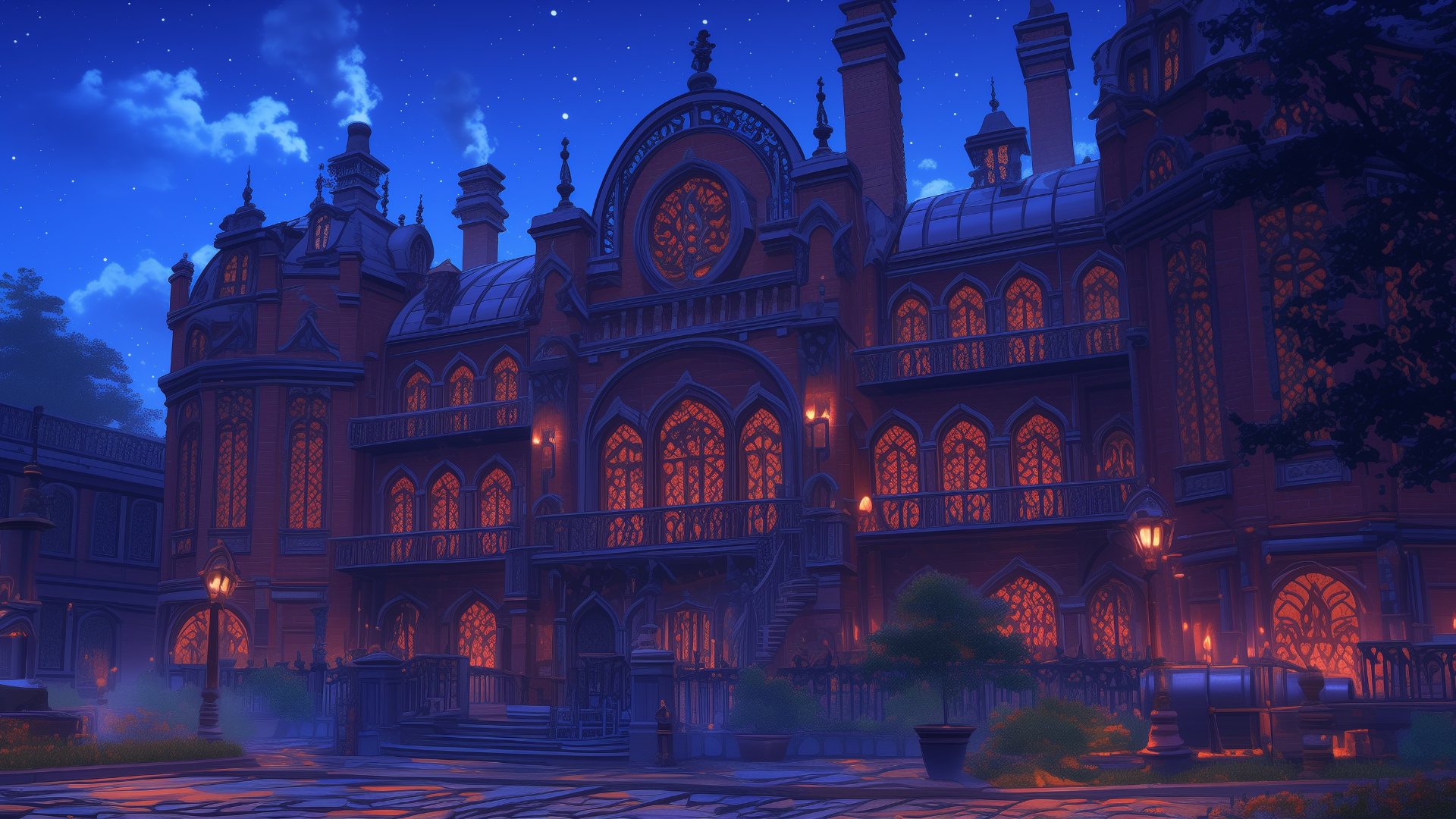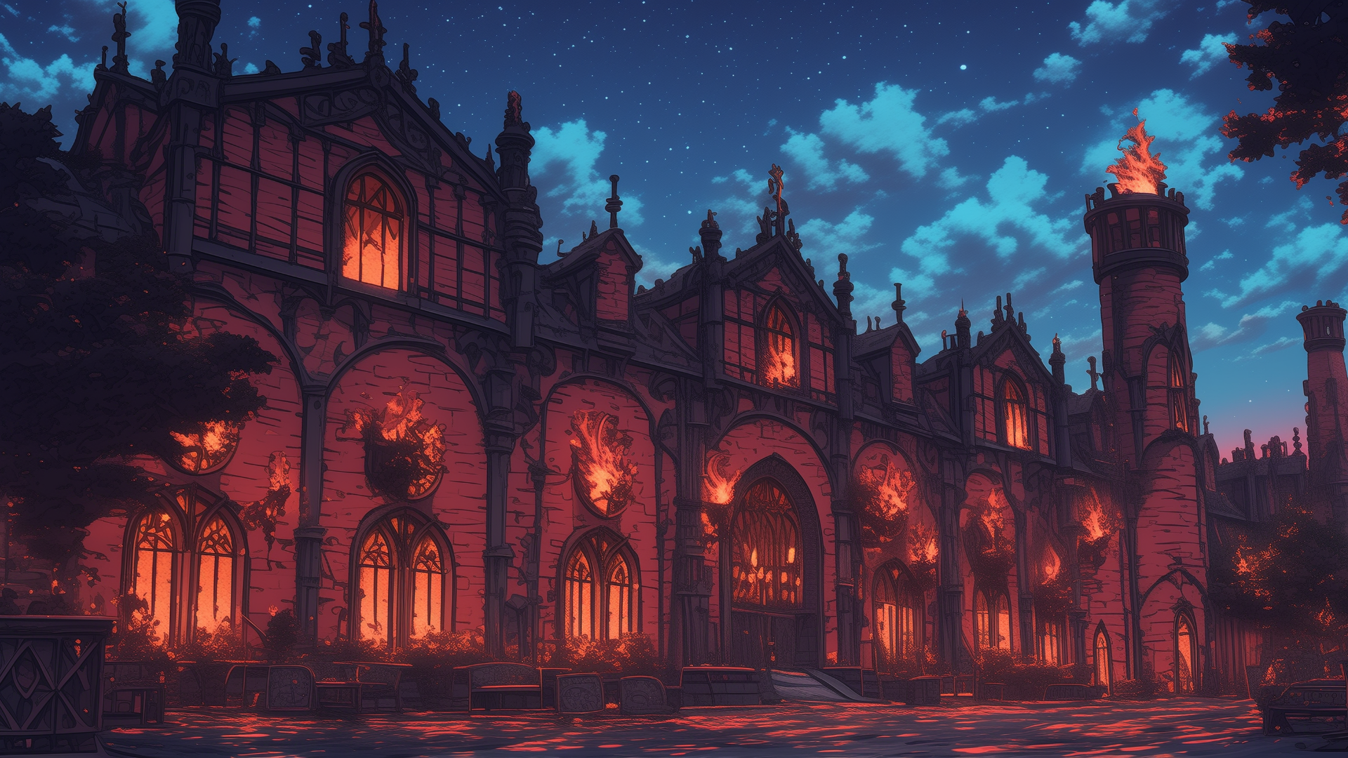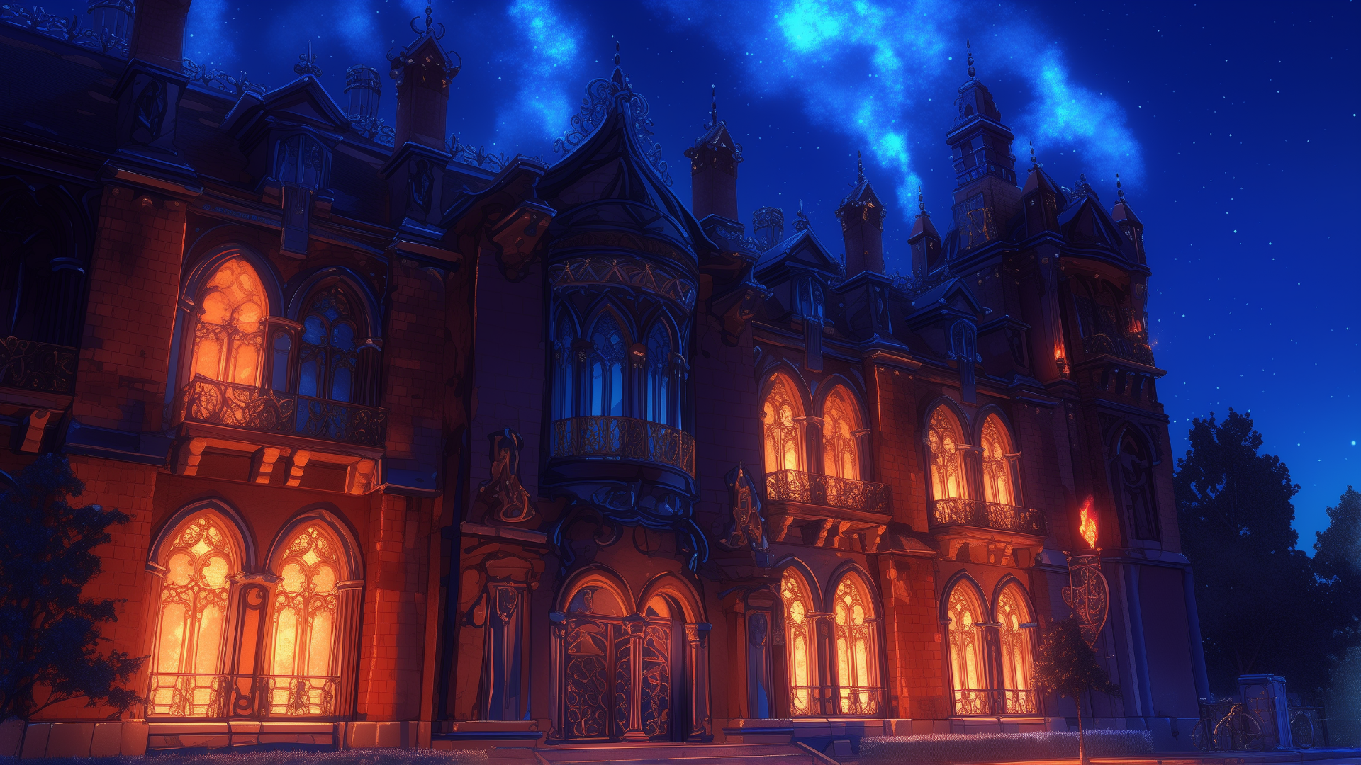 魔法学校の寮(炎属性・夜)、外観のフリー背景素材です。