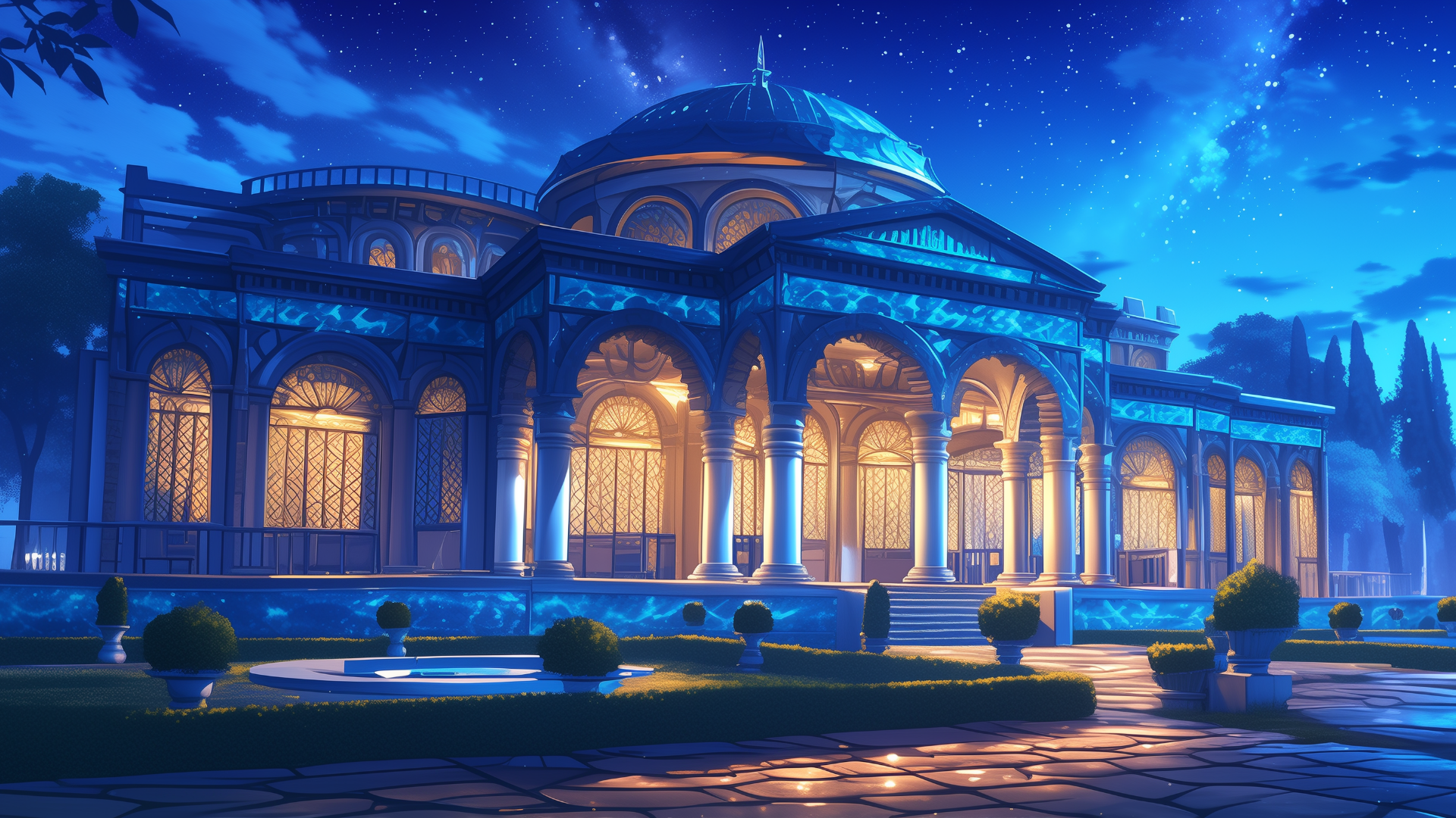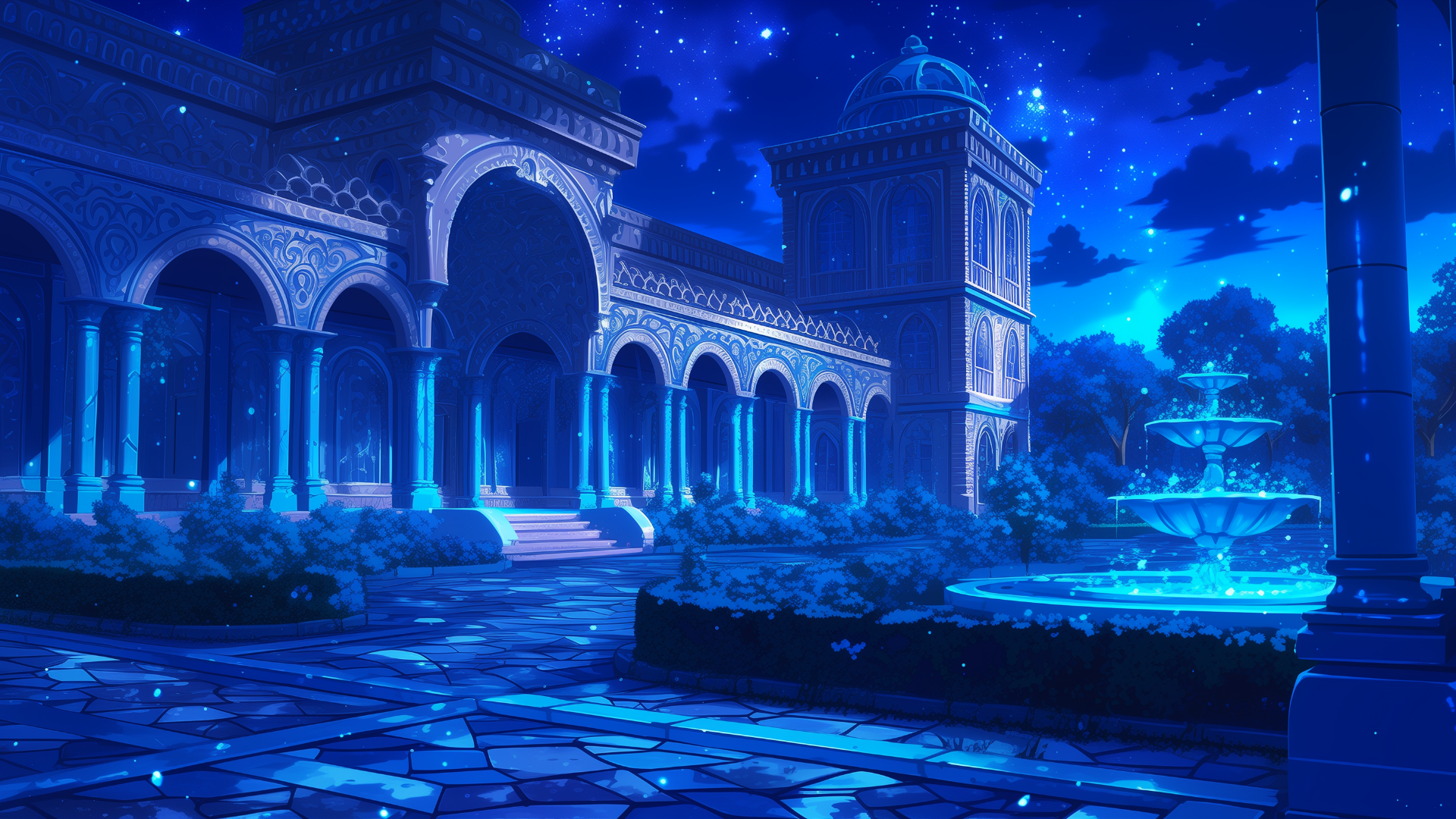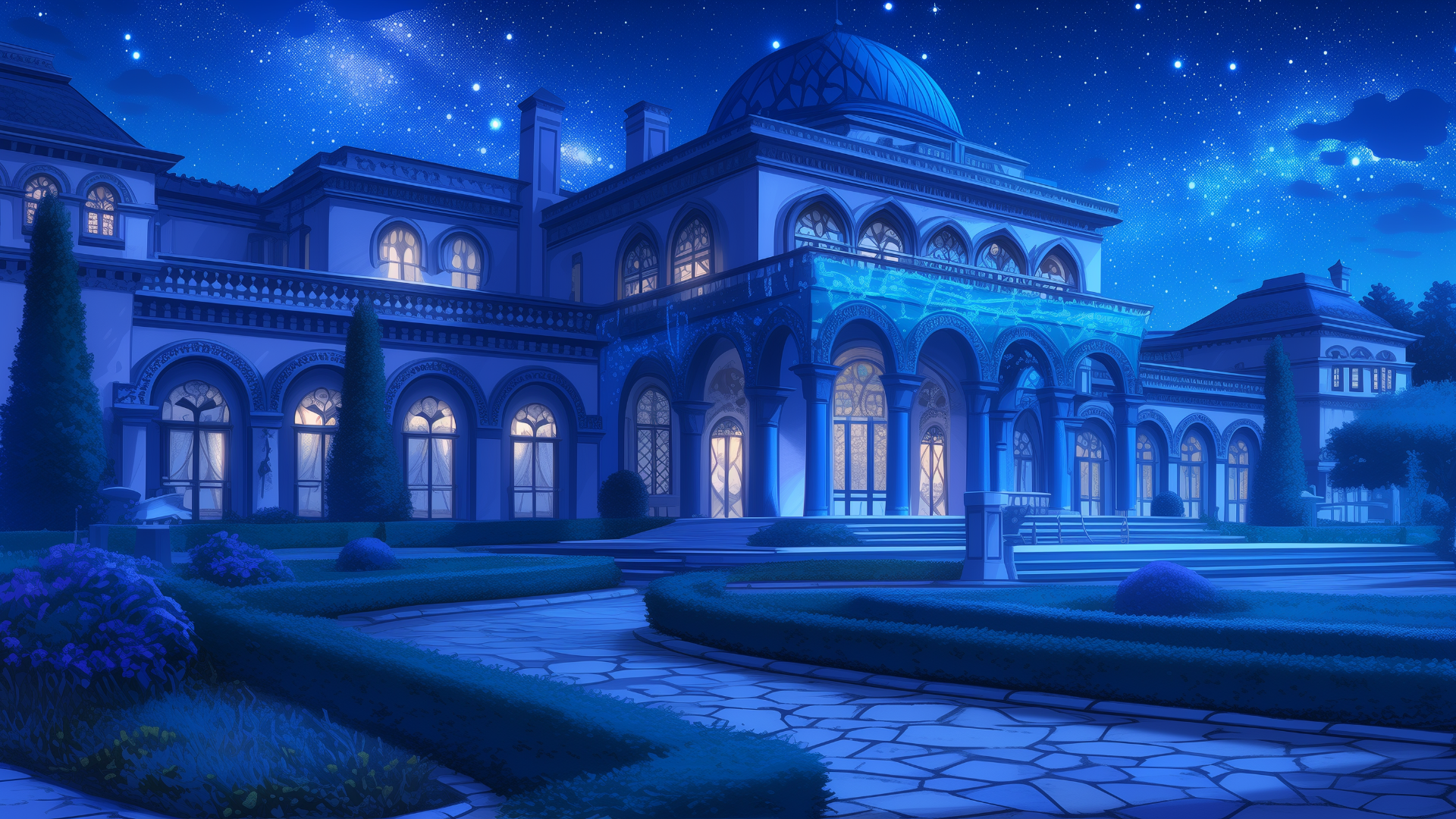 魔法学校の寮(水属性・夜)、外観のフリー背景素材です。