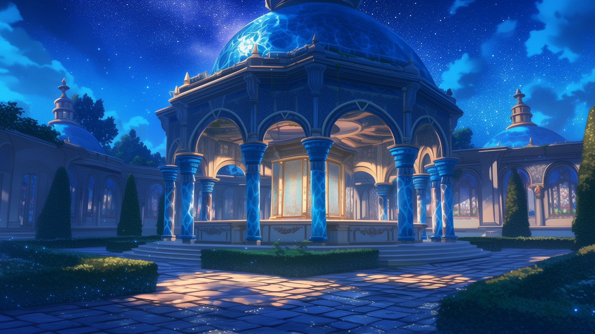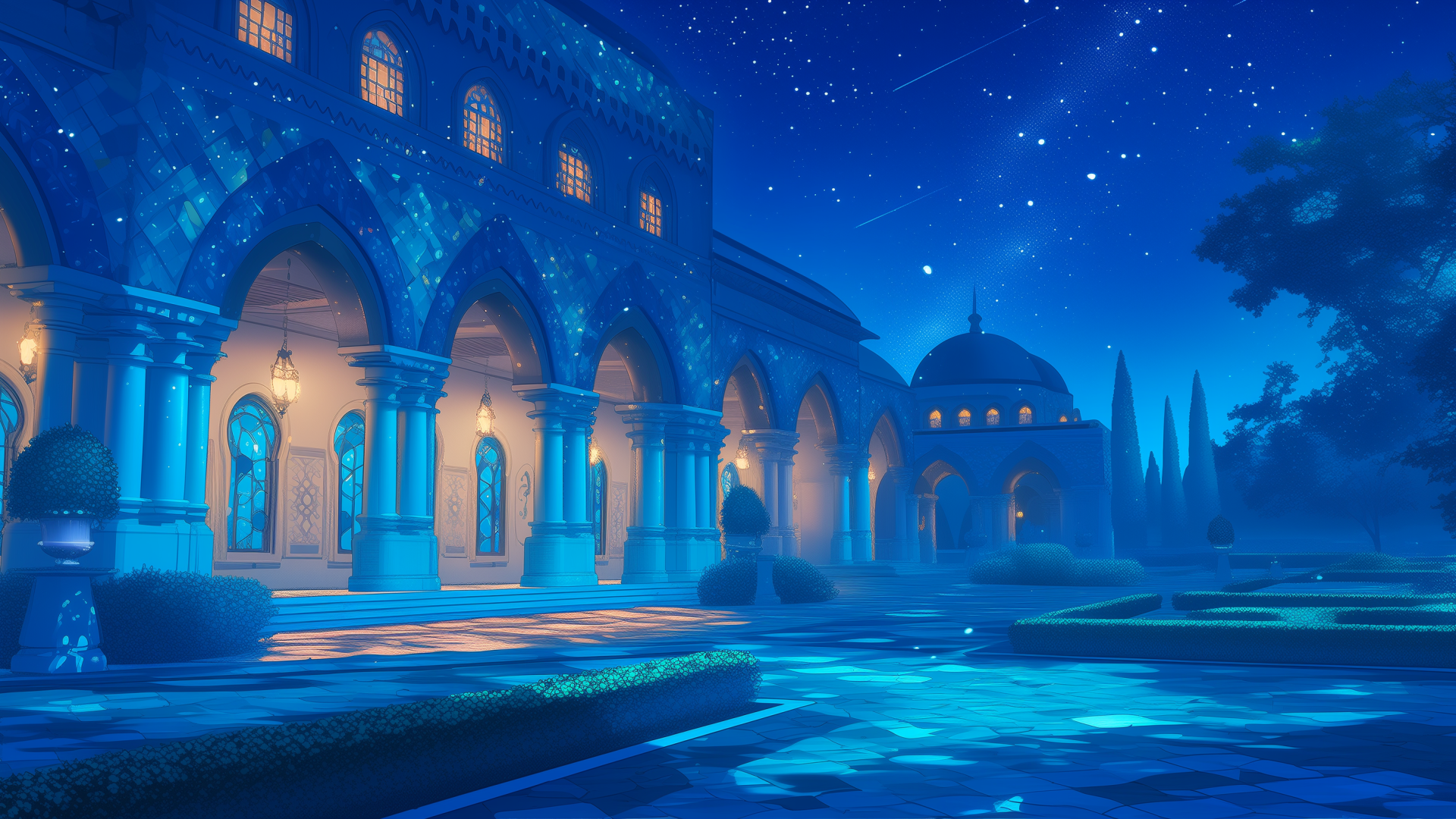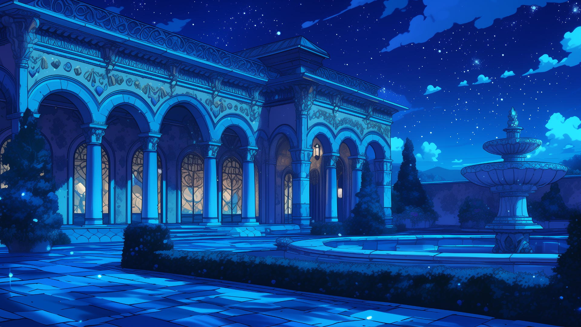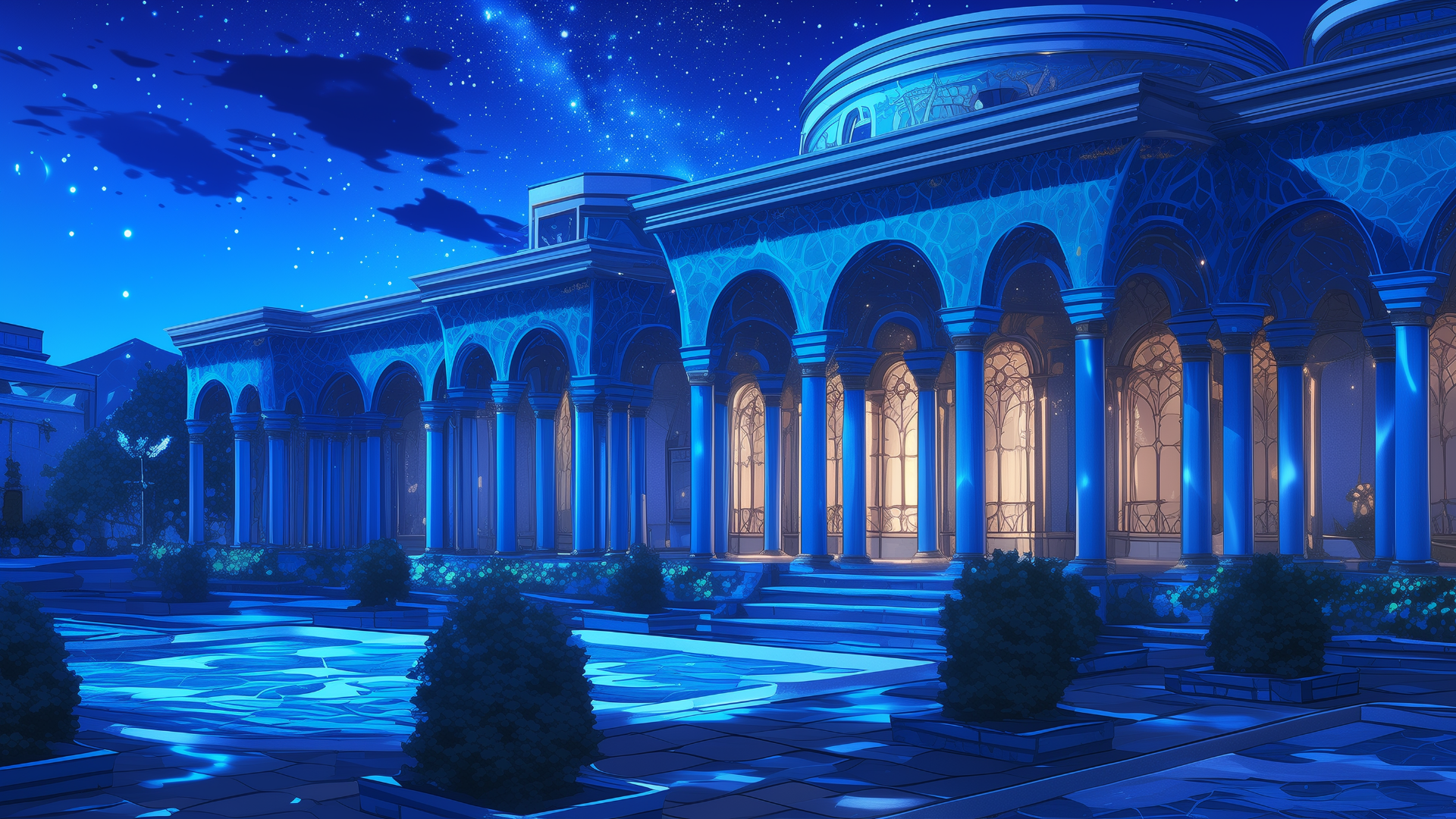 魔法学校の寮(水属性・夜)、外観のフリー背景素材です。