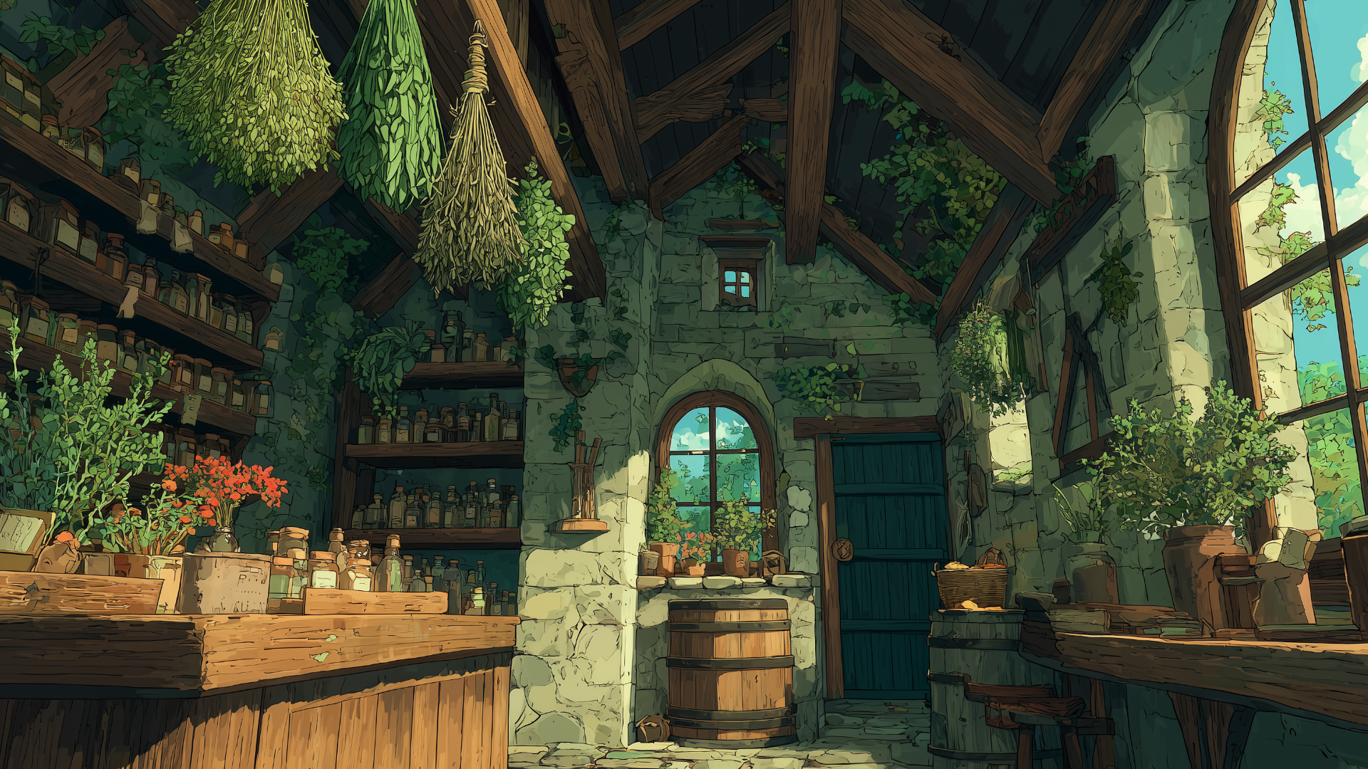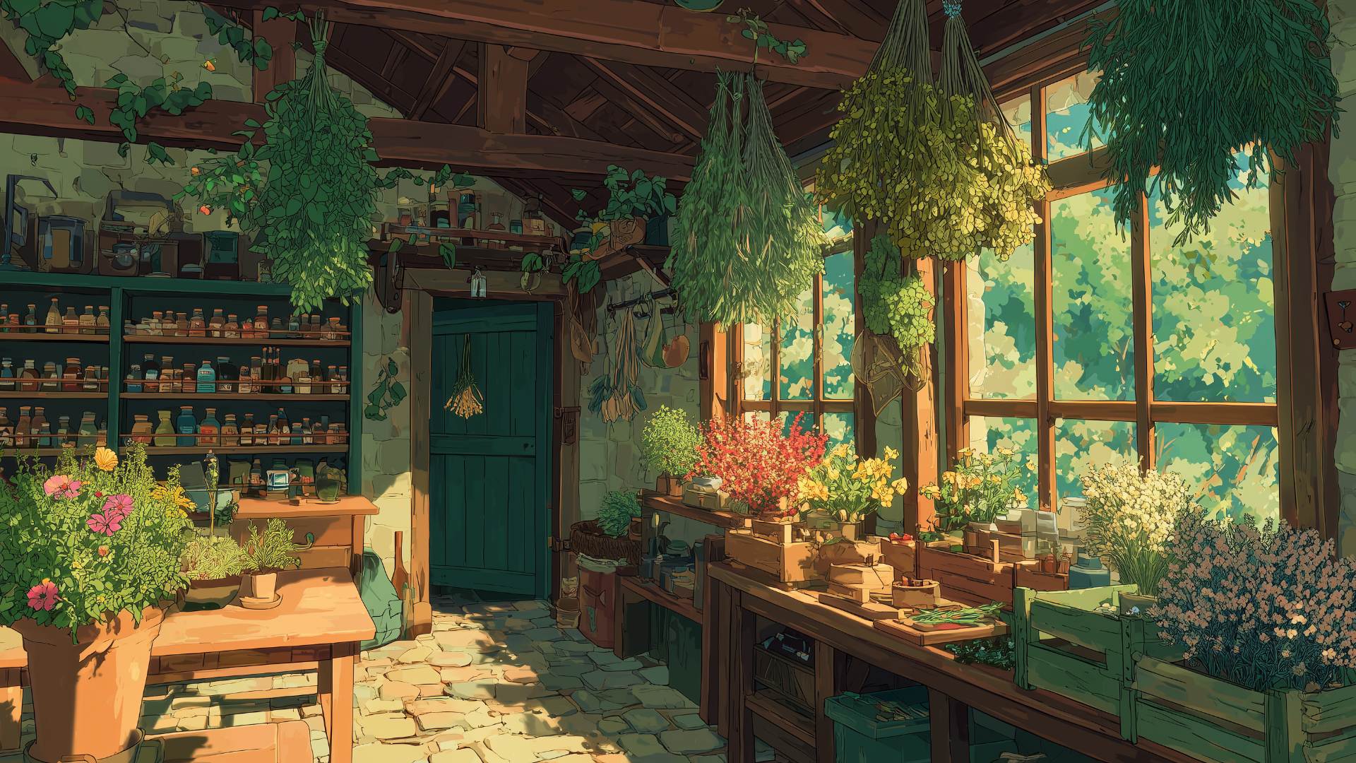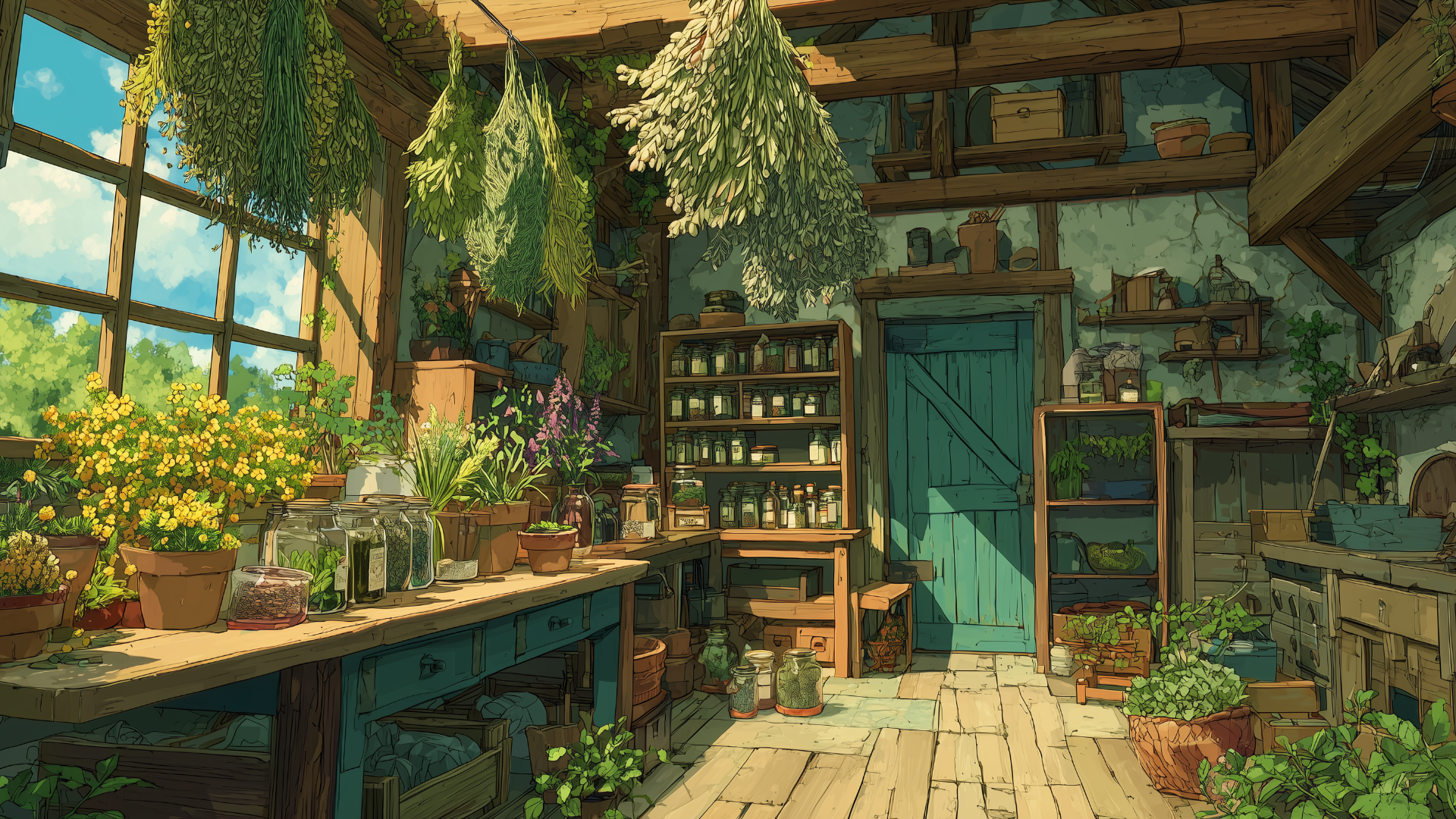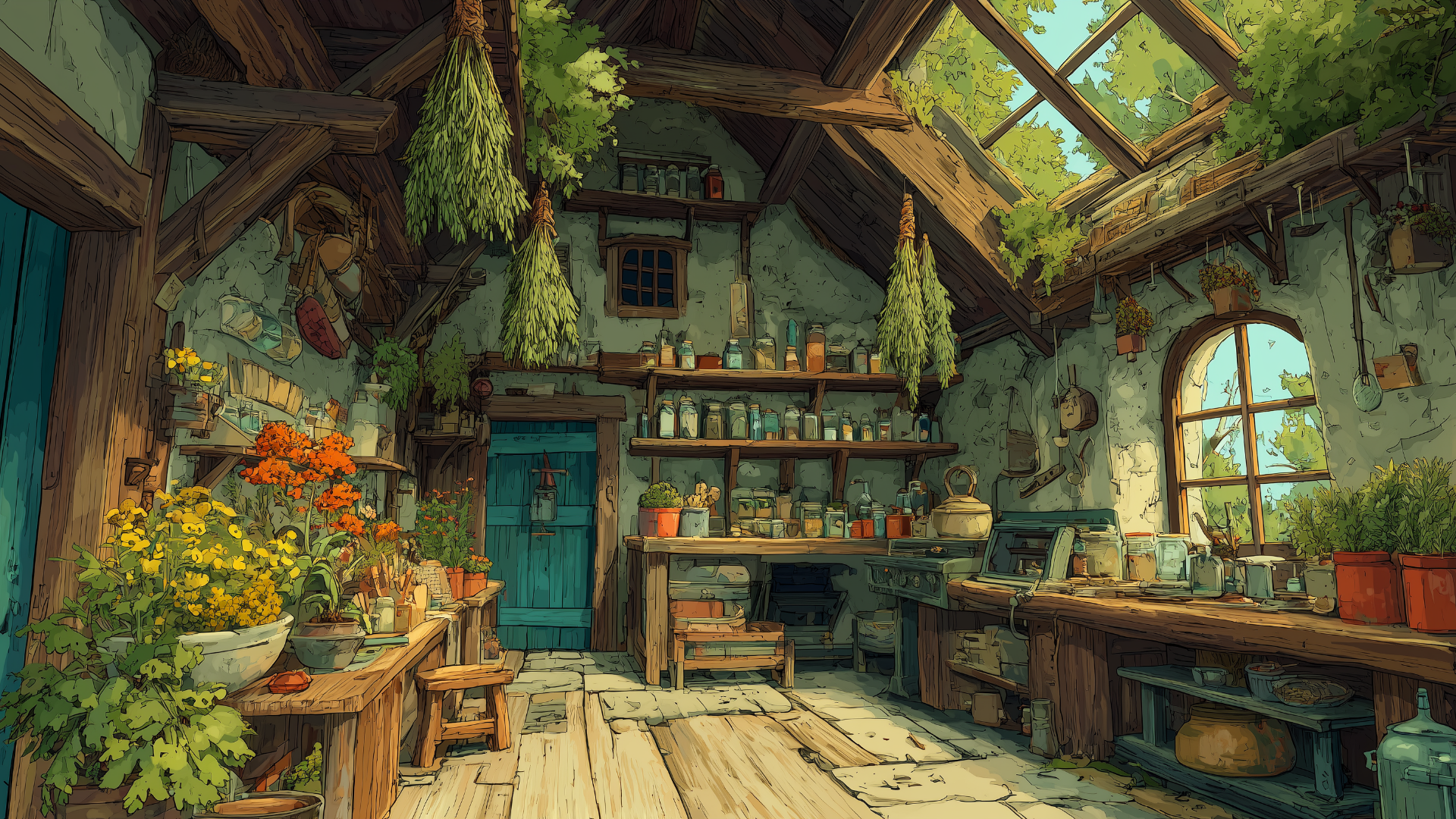 木の温もりと植物の生命力に満ちた調合部屋。窓辺や棚に所狭しと並ぶ薬草や花々、吊るされたハーブが生活感を演出している。薬師や魔法使いの暮らしを表現する背景イラストに最適。