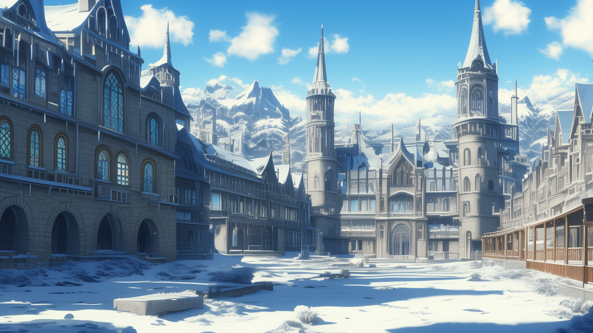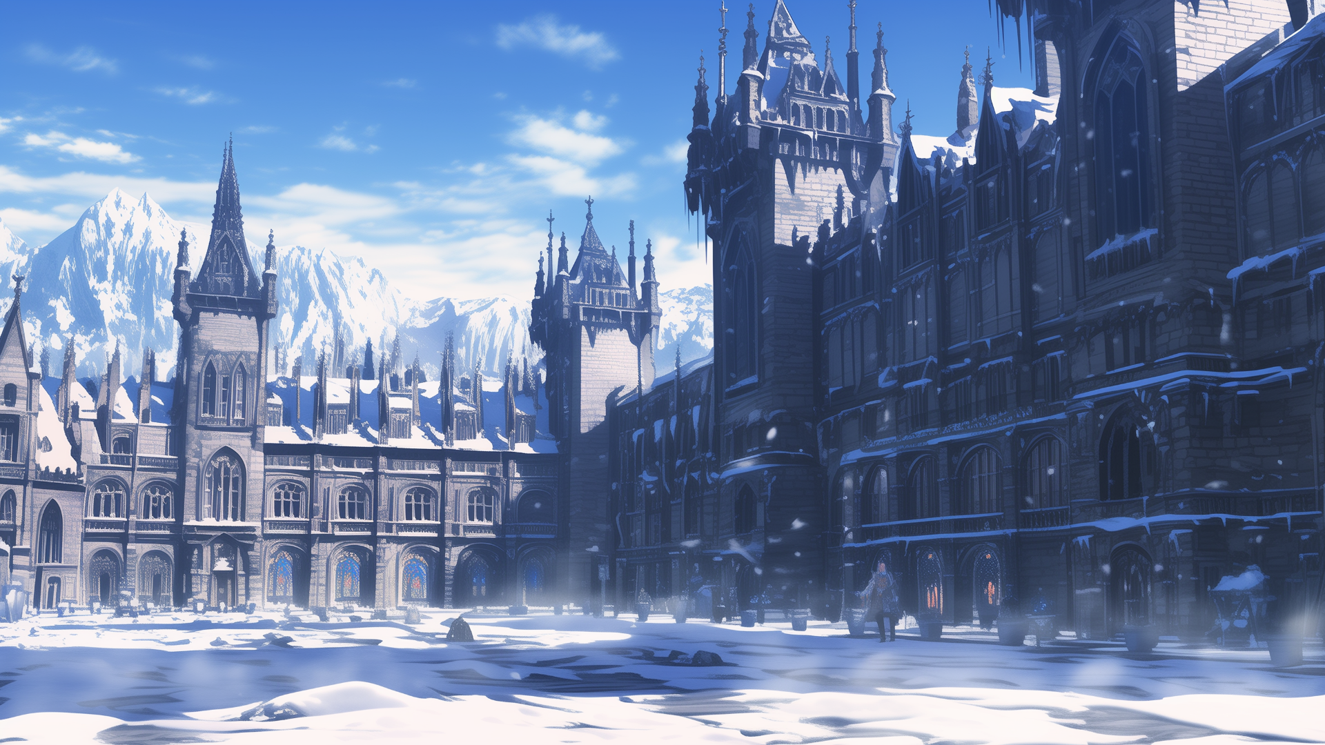 雪深い街並みに囲まれた魔法学院。凍てついた石畳の広場と荘厳な校舎が静寂に包まれ、幻想的な冬の風景を描く。異世界冒険や魔法学園シナリオ向けのフリー背景画像。