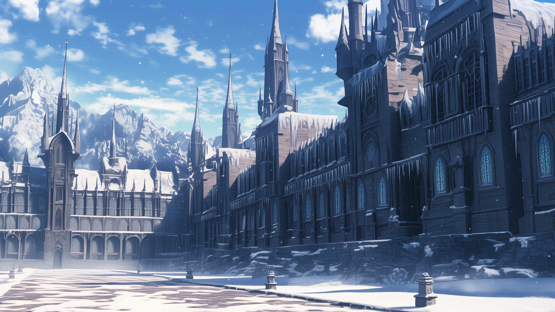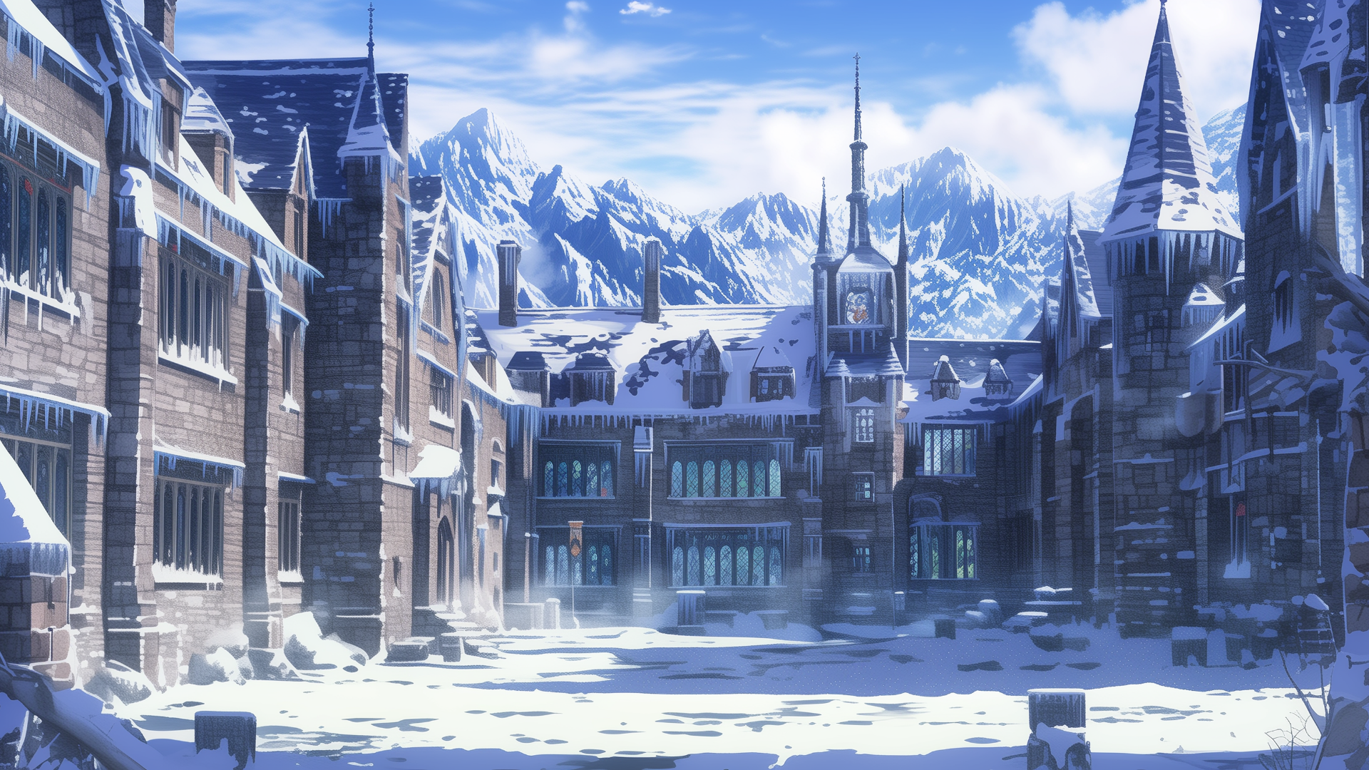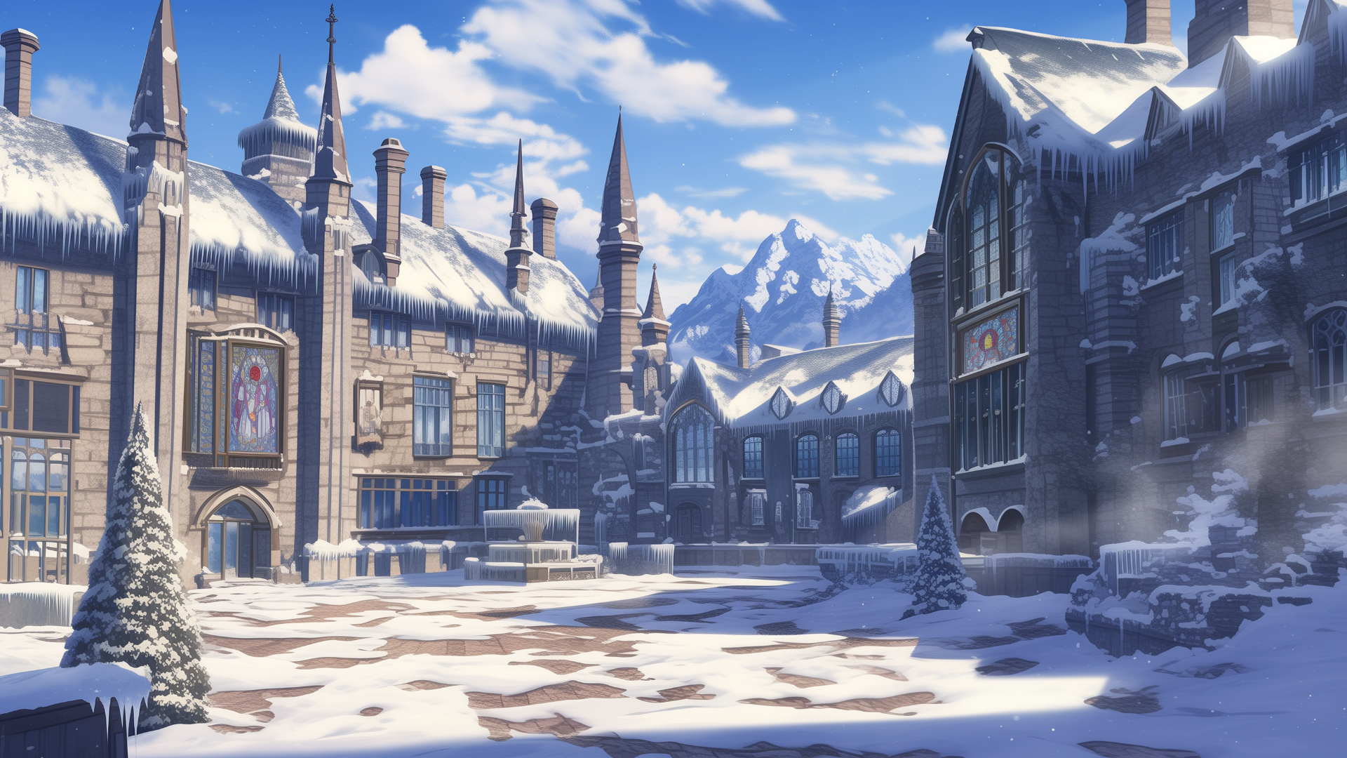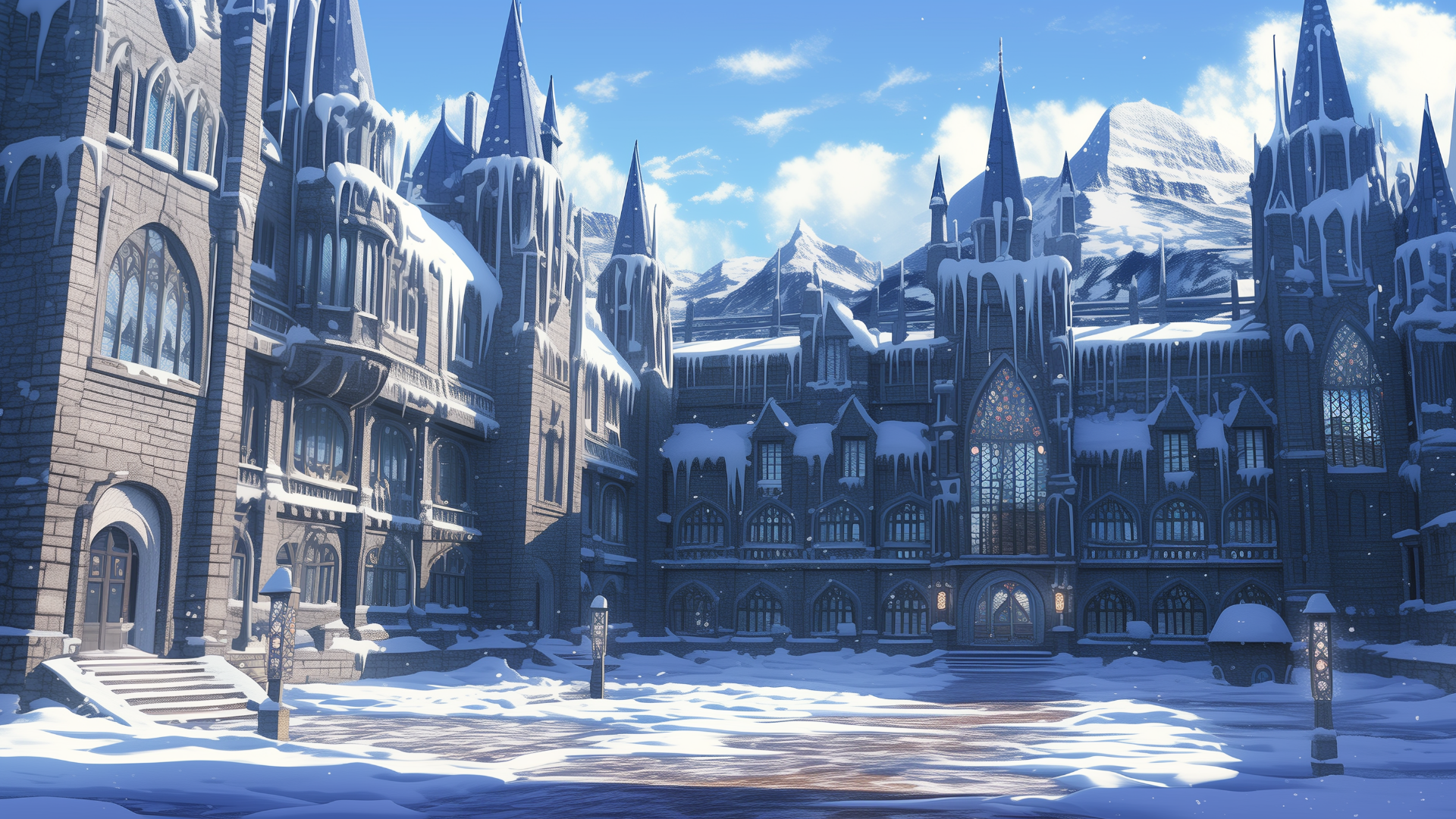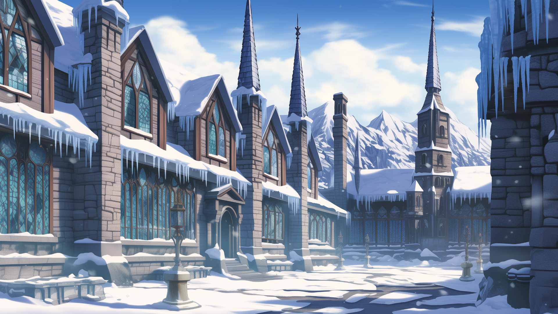 氷点下の冷気に包まれた魔法学校。校舎の尖塔には雪が積もり、凍てついたステンドグラスが幻想的な輝きを放つ。異世界の魔法学園や冒険シナリオ向けのフリー背景素材。