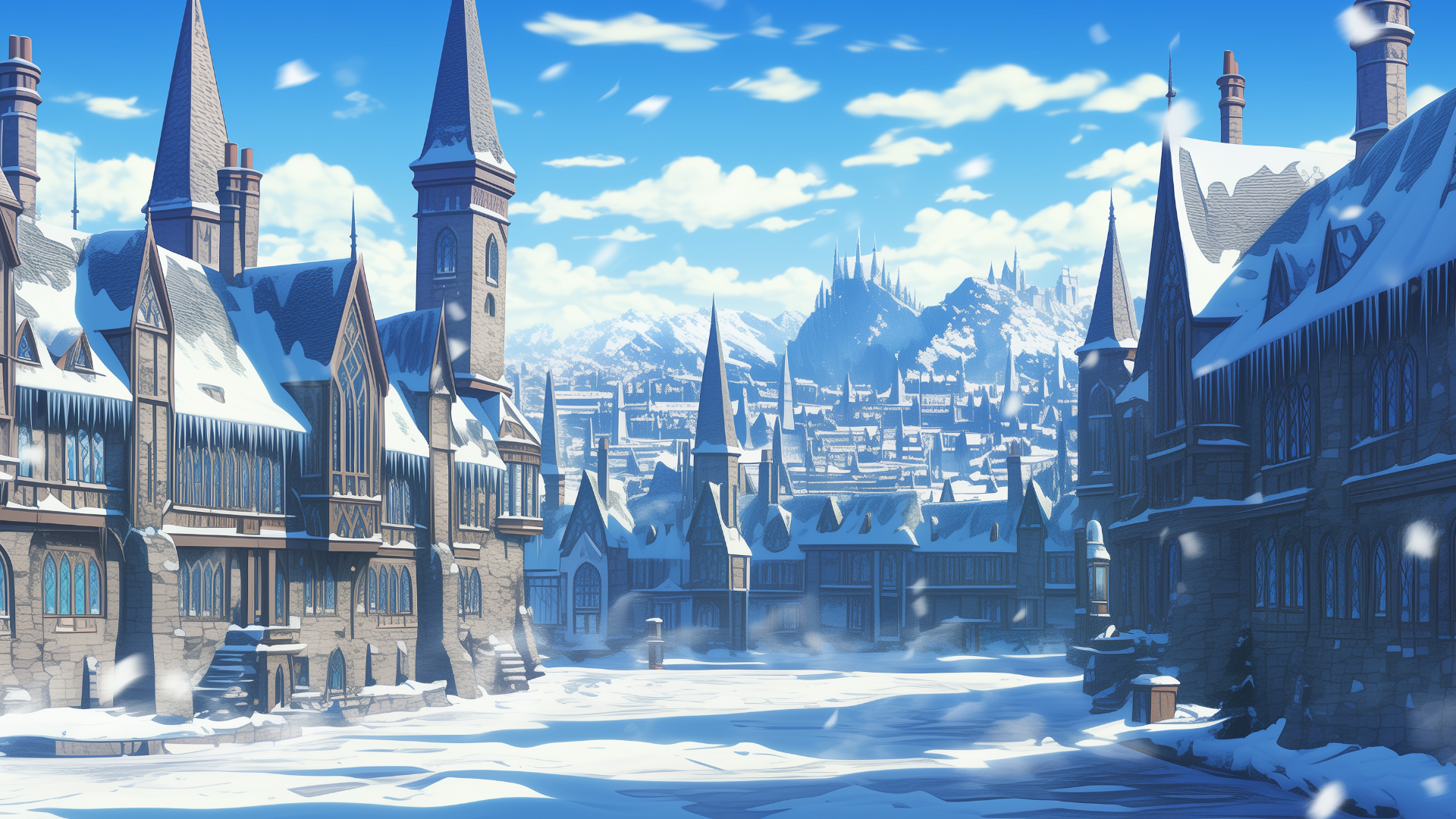 雪に覆われた魔法都市の一角。ゴシック建築の建物が並び、石造りの道には雪が積もる。氷と魔法が交錯する幻想的な世界観を演出するフリー背景画像。