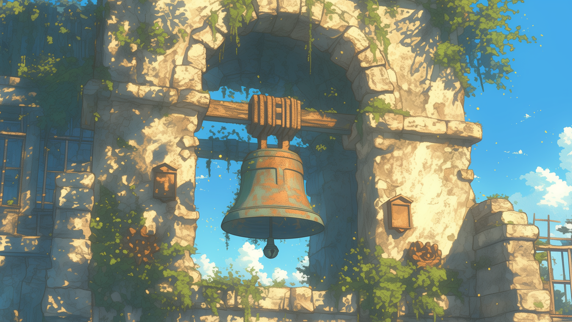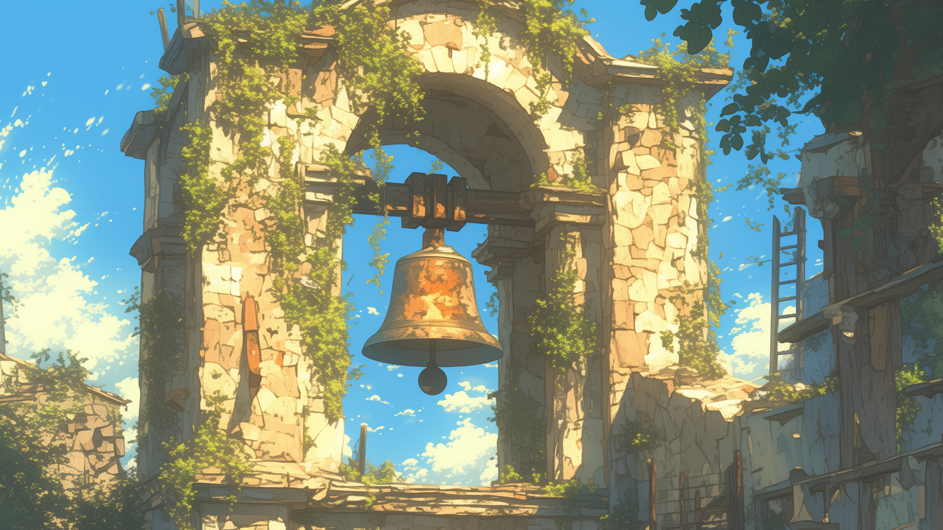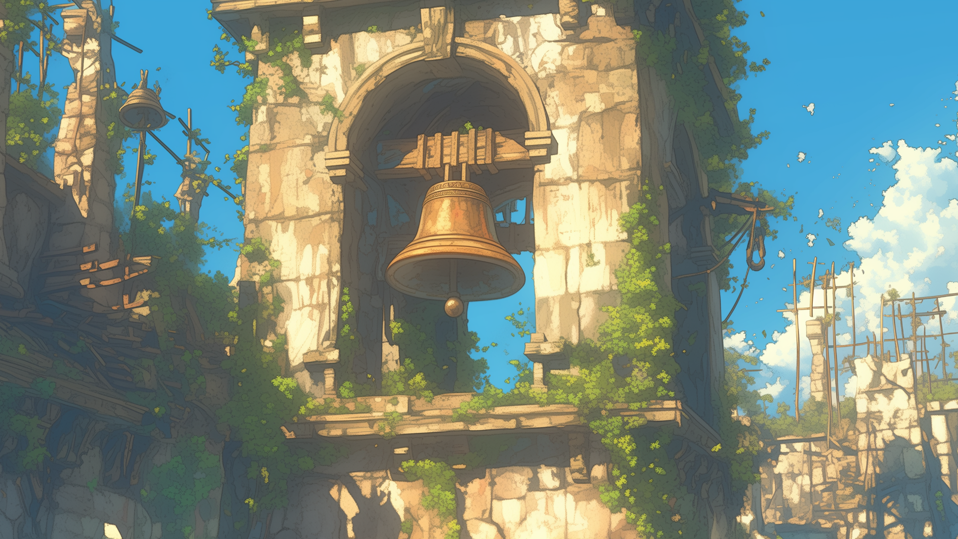 遺跡の中に残っている塔に植物が絡まっている、古びた鐘のフリー背景素材です。