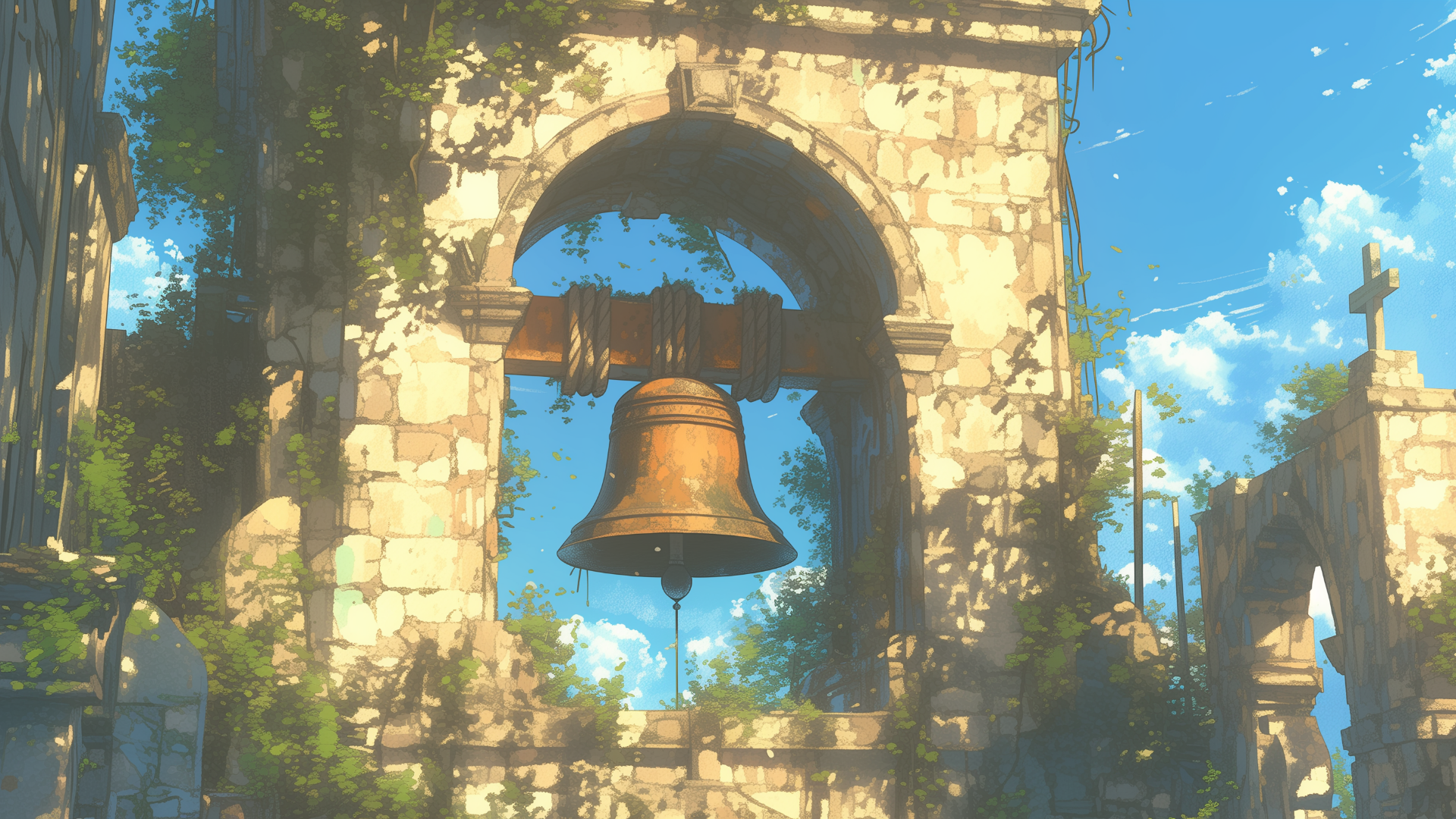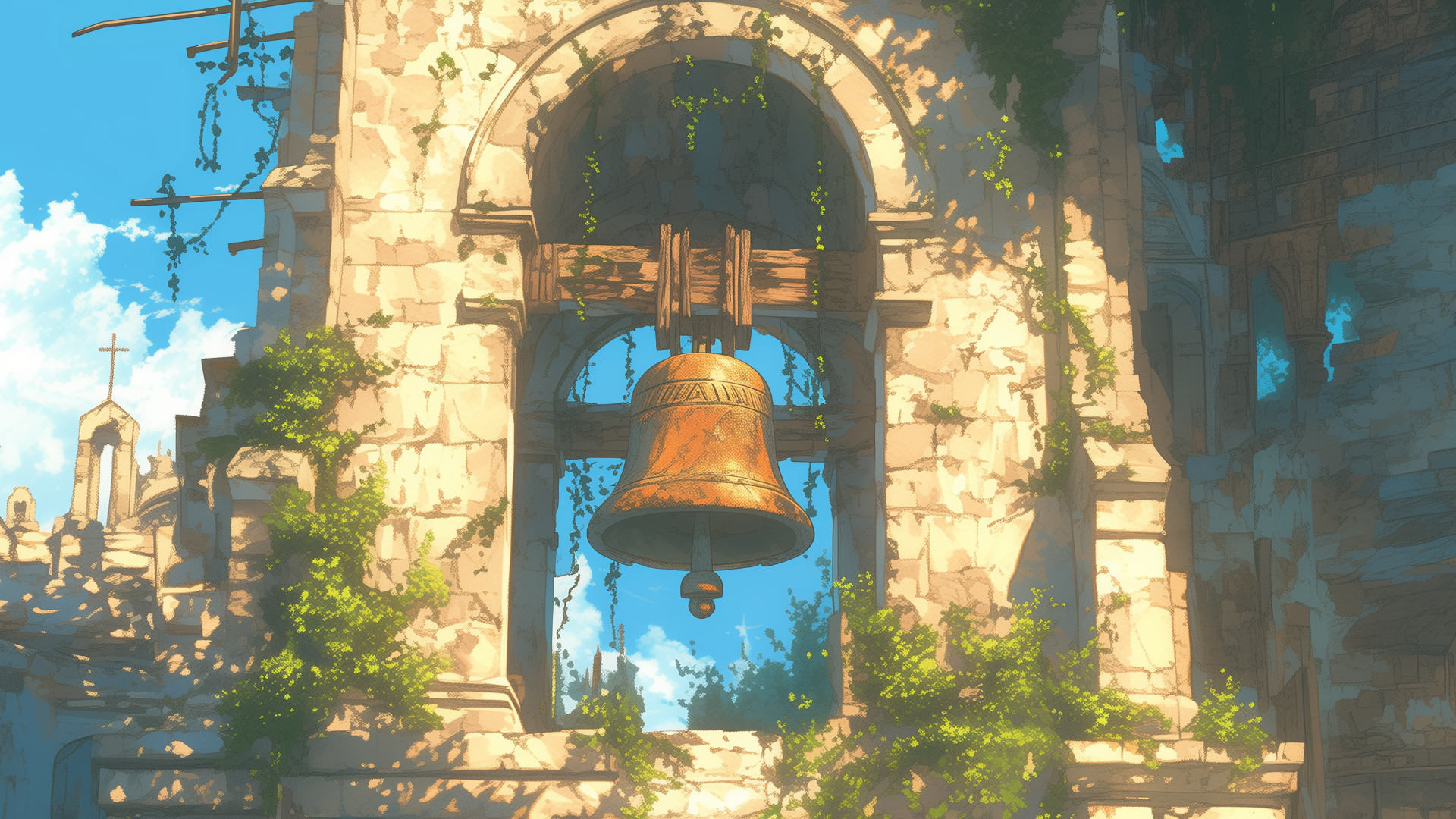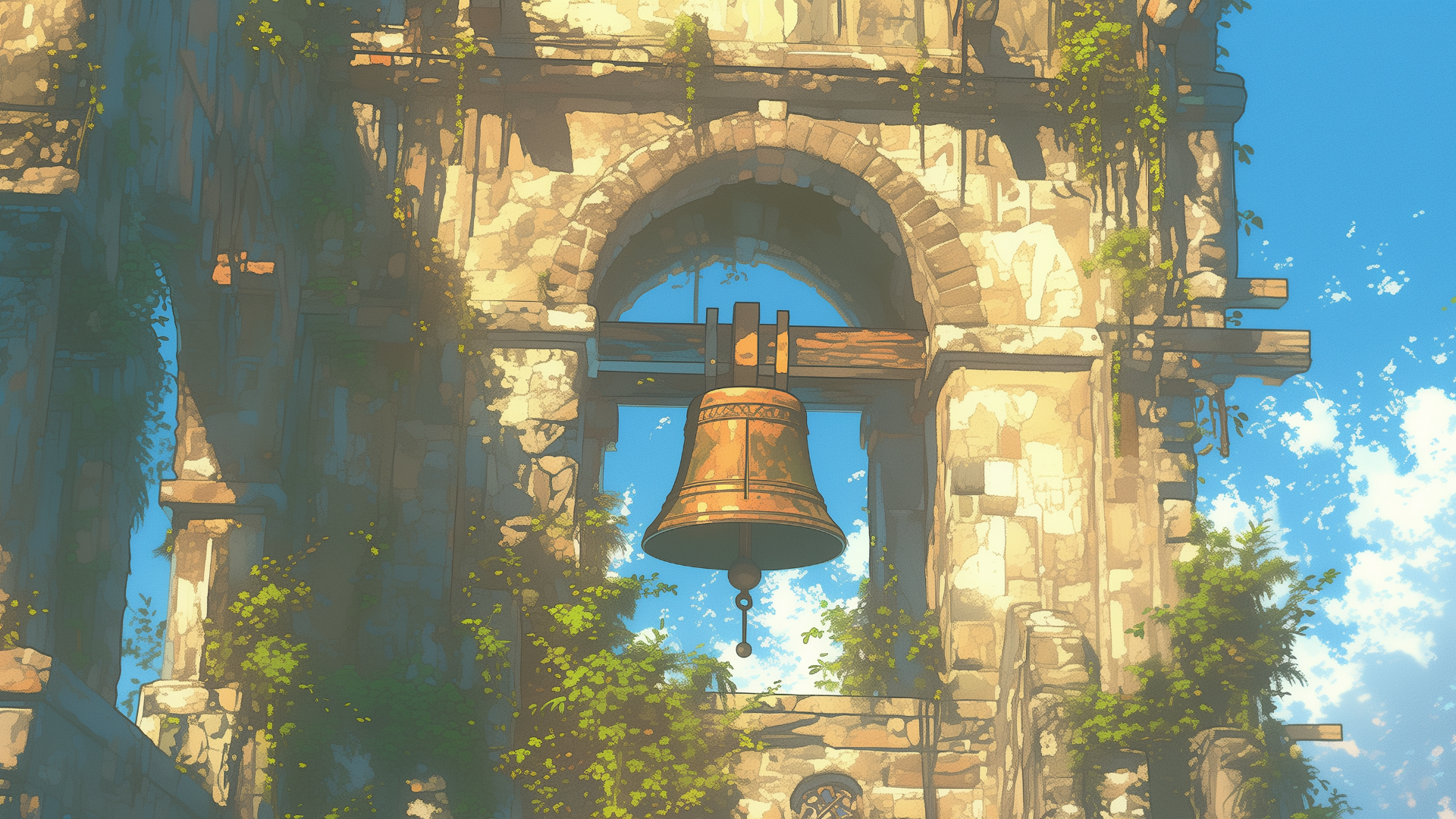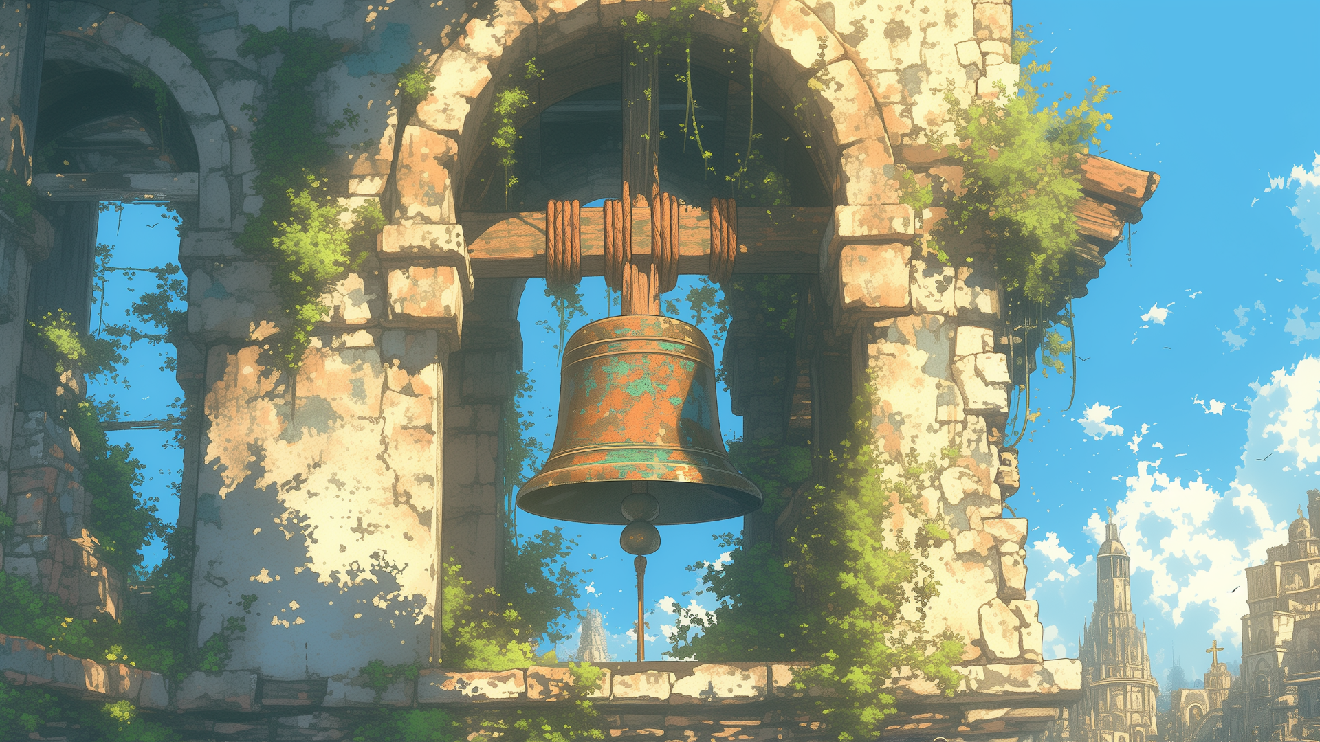 遺跡の中に残っている塔に植物が絡まっている、古びた鐘のフリー背景素材です。