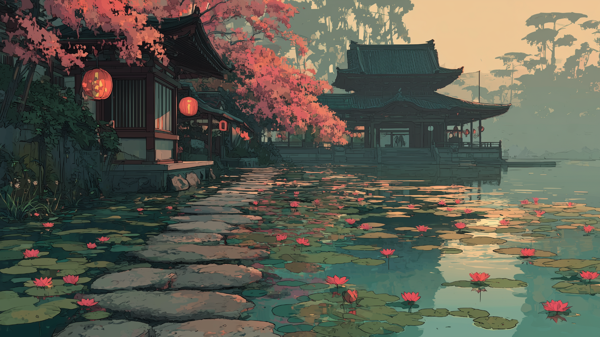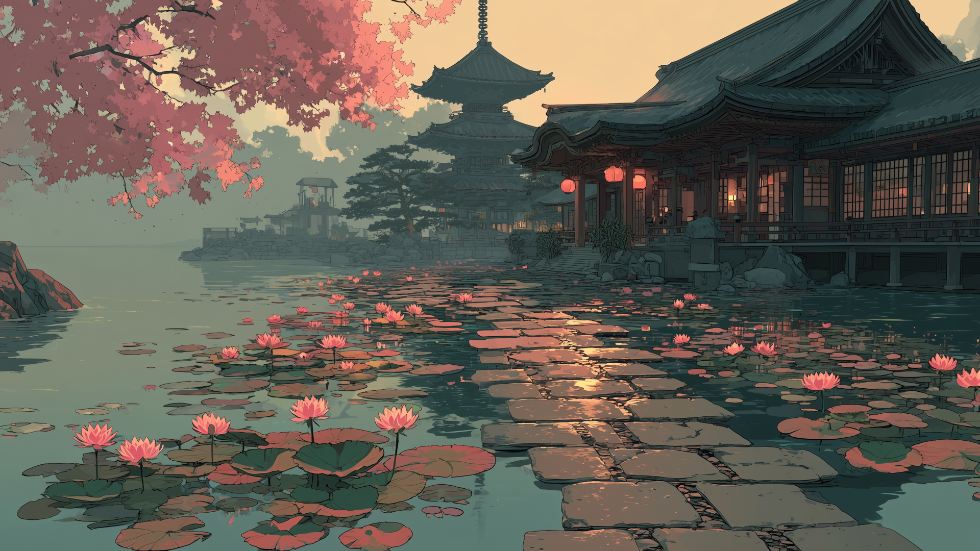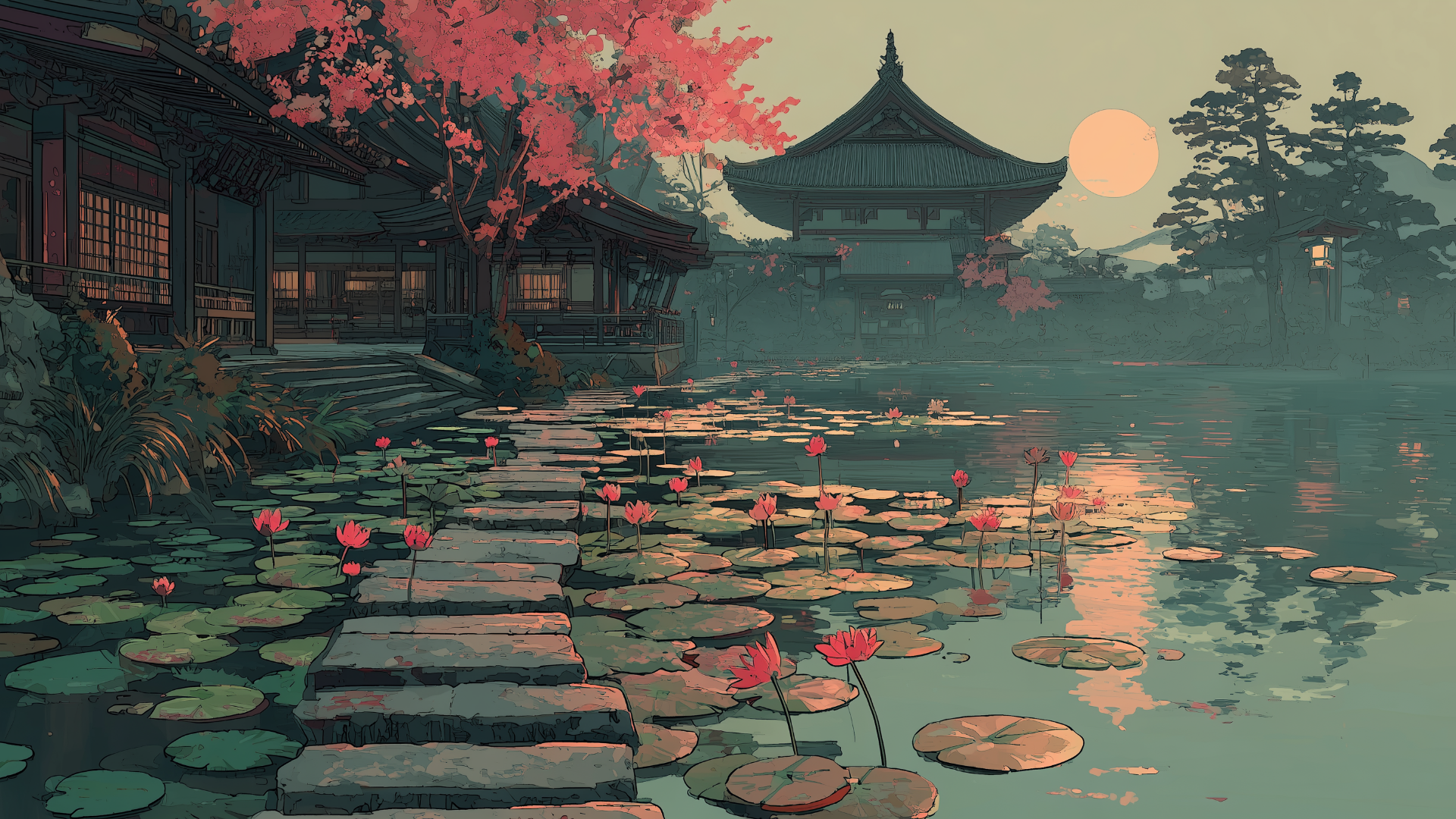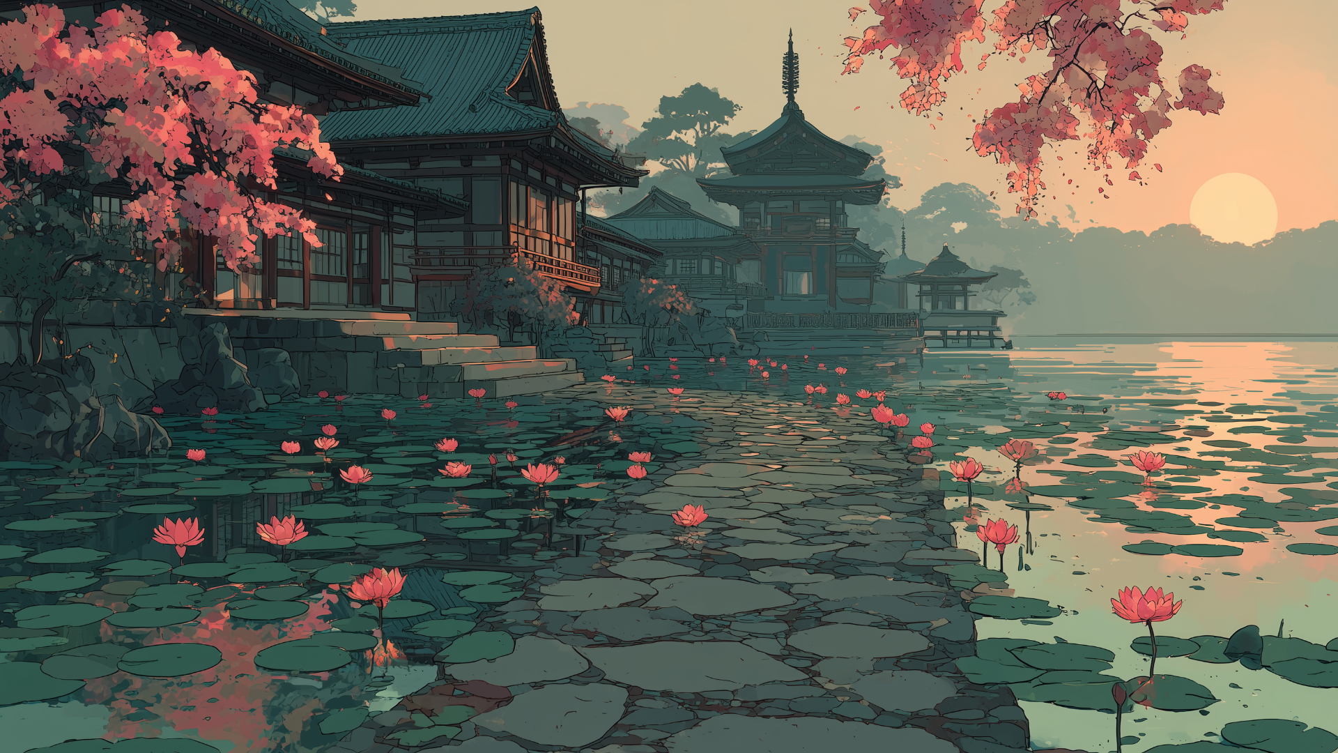 沈む夕陽に照らされた寺院と水面に揺れる蓮が、穏やかで幻想的な時間を切り取っています。石畳の道が水辺を渡り、奥の伽藍へと自然に視線を導きます。和風伝奇や情緒的なTRPGシナリオに映える背景素材です。