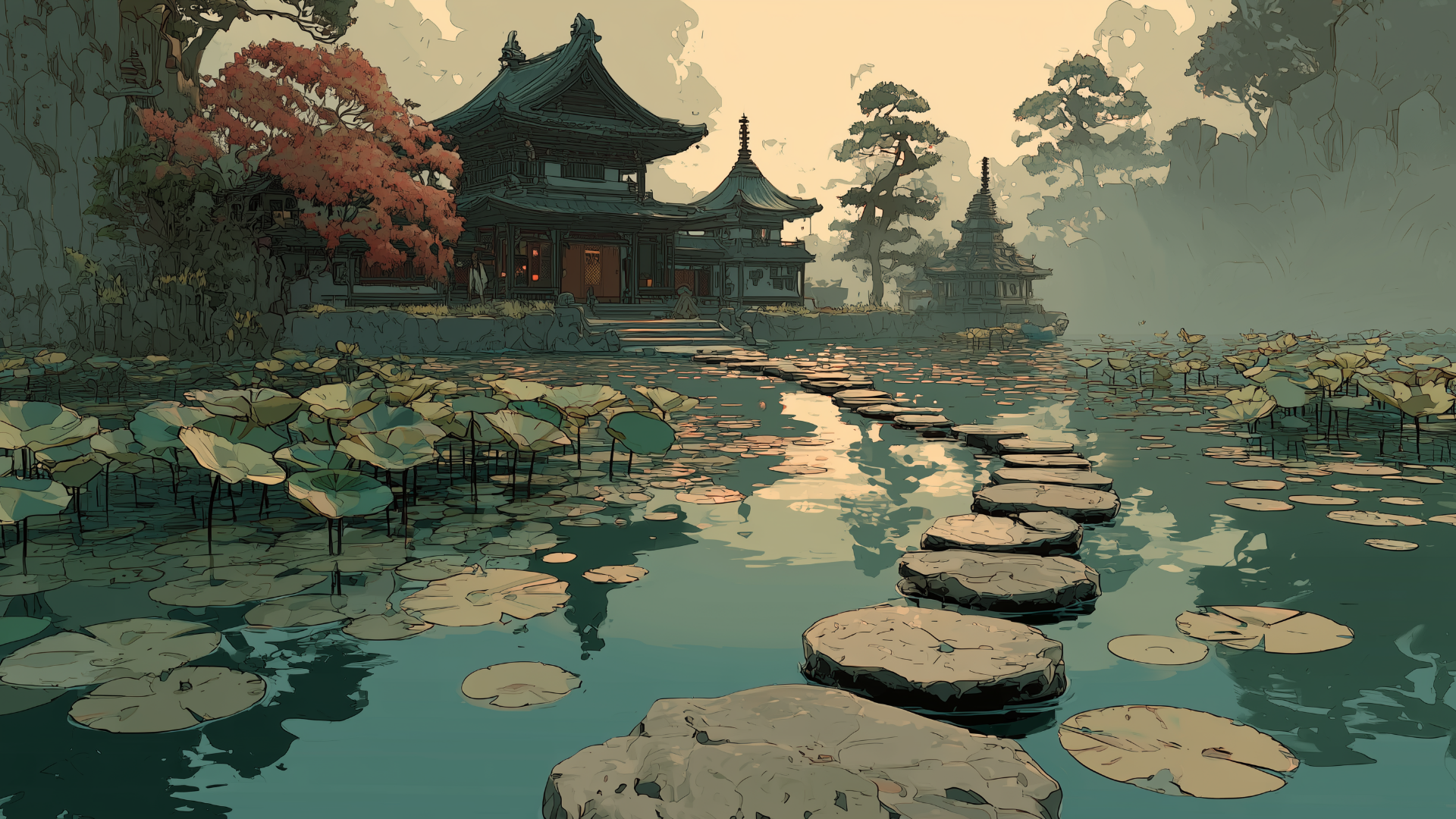 池一面に広がる蓮の葉と石橋が、古びた寺院へと続く静謐な風景を描いています。背後には深い森と朱色の木々が重なり、時代を超えた荘厳さを漂わせます。神秘的な雰囲気を演出するTRPGや古代伝承を題材にしたシナリオに適した背景画像です。