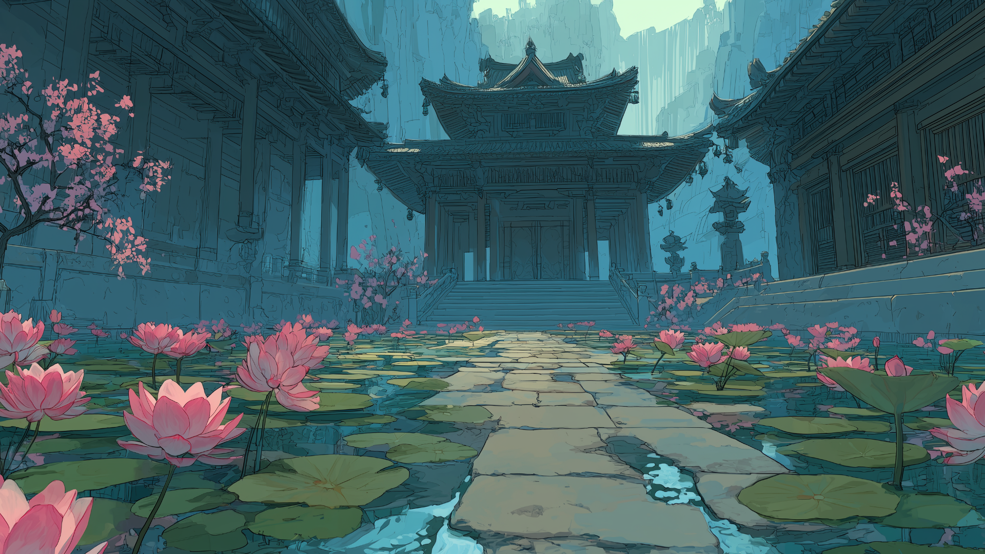 満開の蓮が浮かぶ池の中央に続く参道が、荘厳な古寺へとまっすぐ導かれる風景です。岩壁に囲まれた建物と水辺の対比が幻想的な印象を与えています。神殿探索や和風ファンタジーのTRPGに適したフリー背景素材です。
