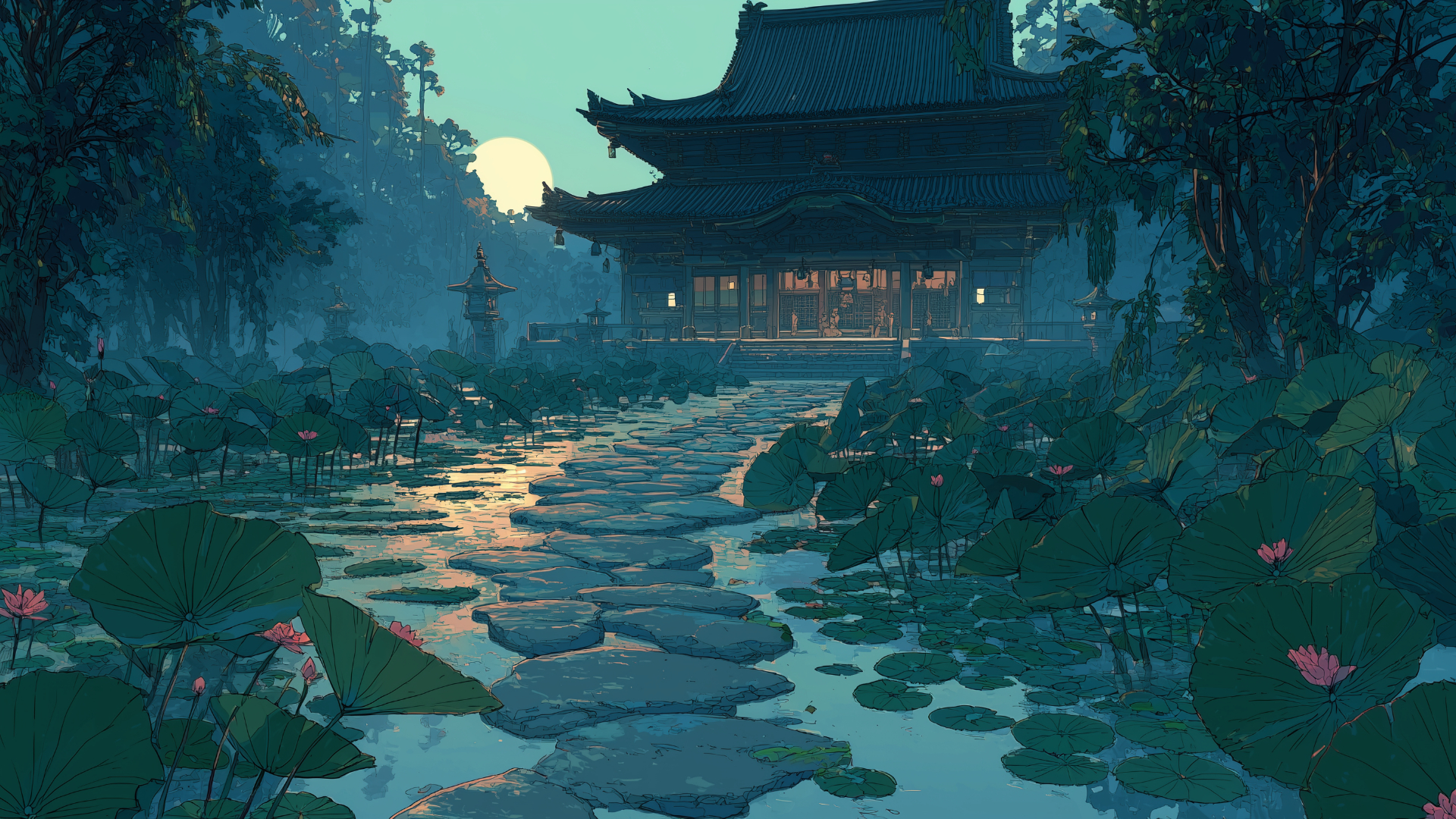 満月の光が水面に落ち、濃い緑の蓮に囲まれた寺院が幻想的に浮かび上がる夜の情景です。参道の石が濡れて輝き、幽玄な雰囲気を強調しています。和風ホラーや神秘的なTRPGシナリオに活かせる背景画像です。
