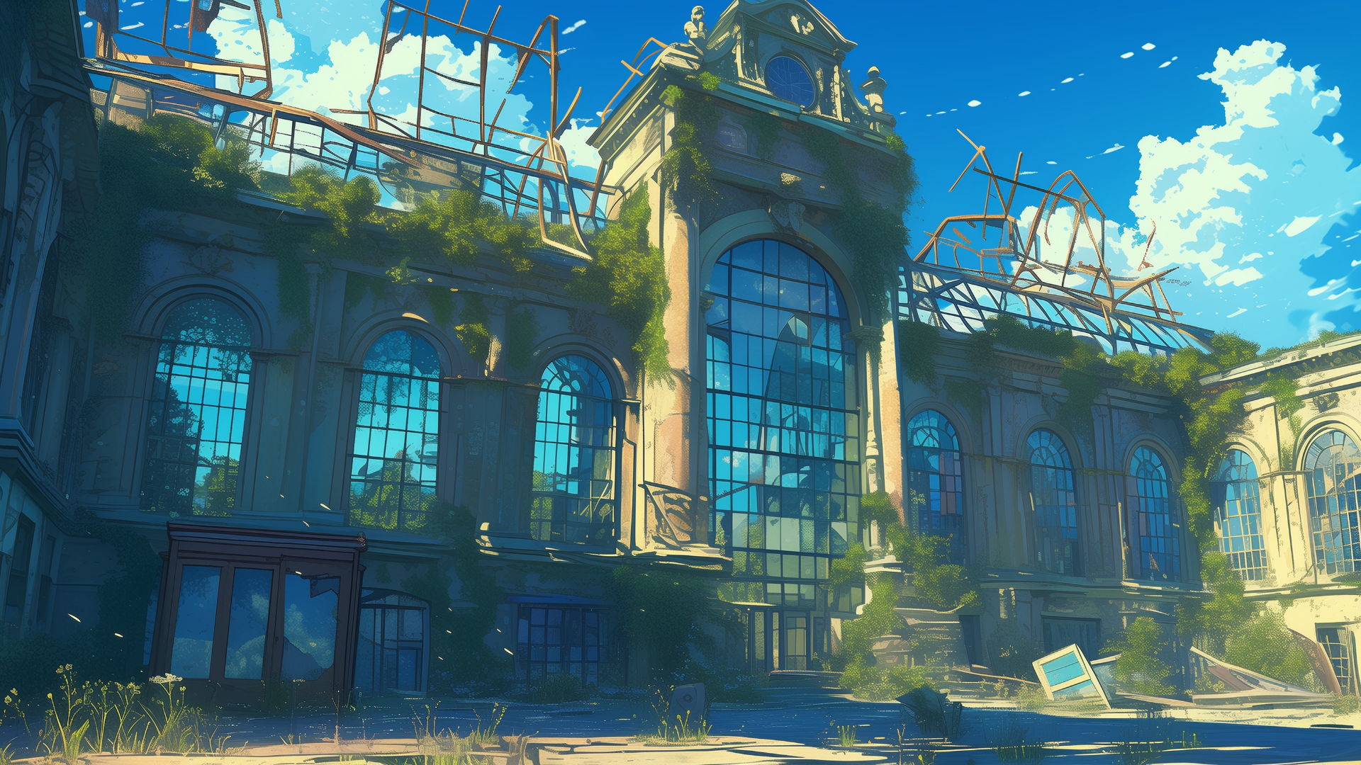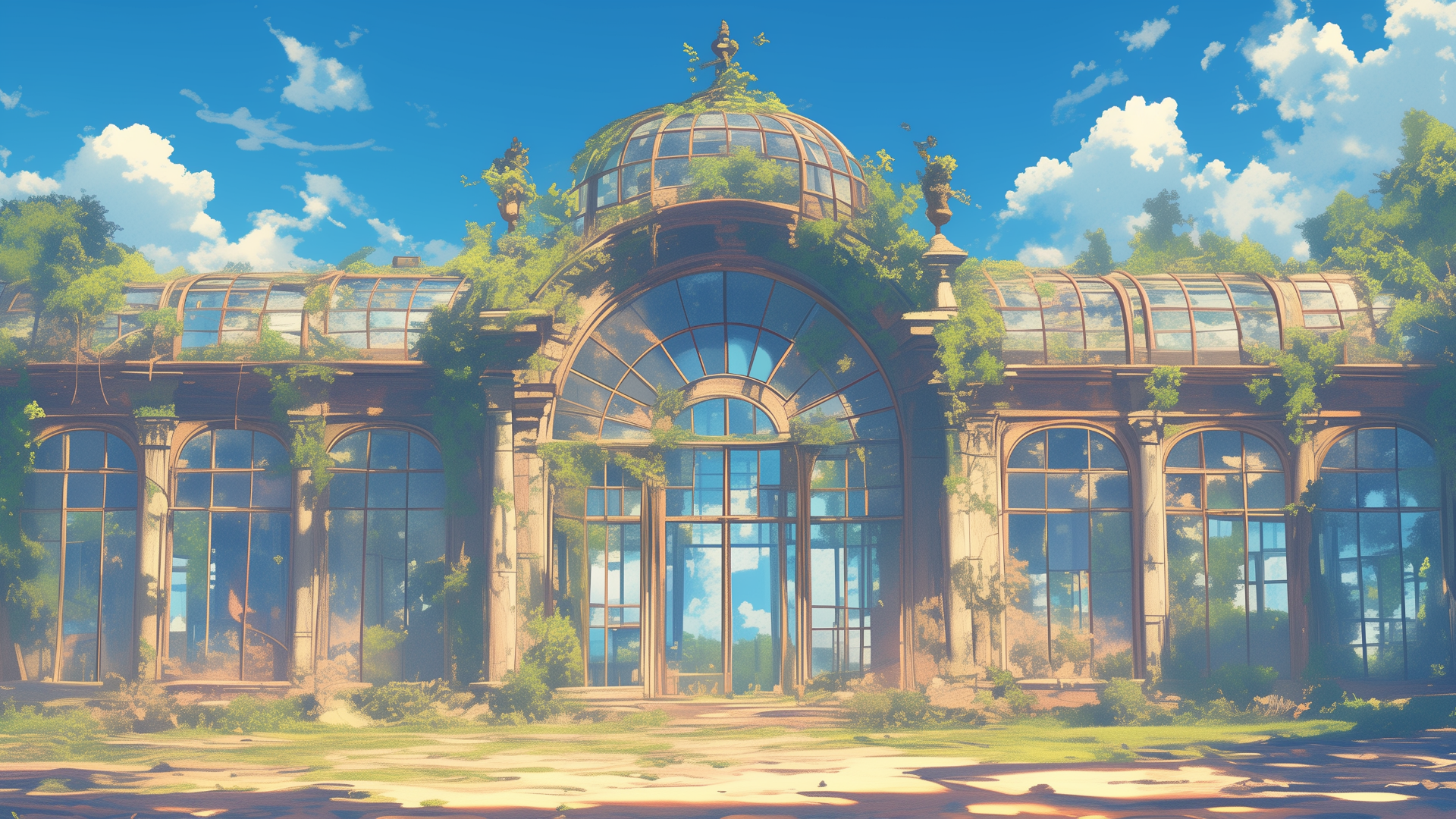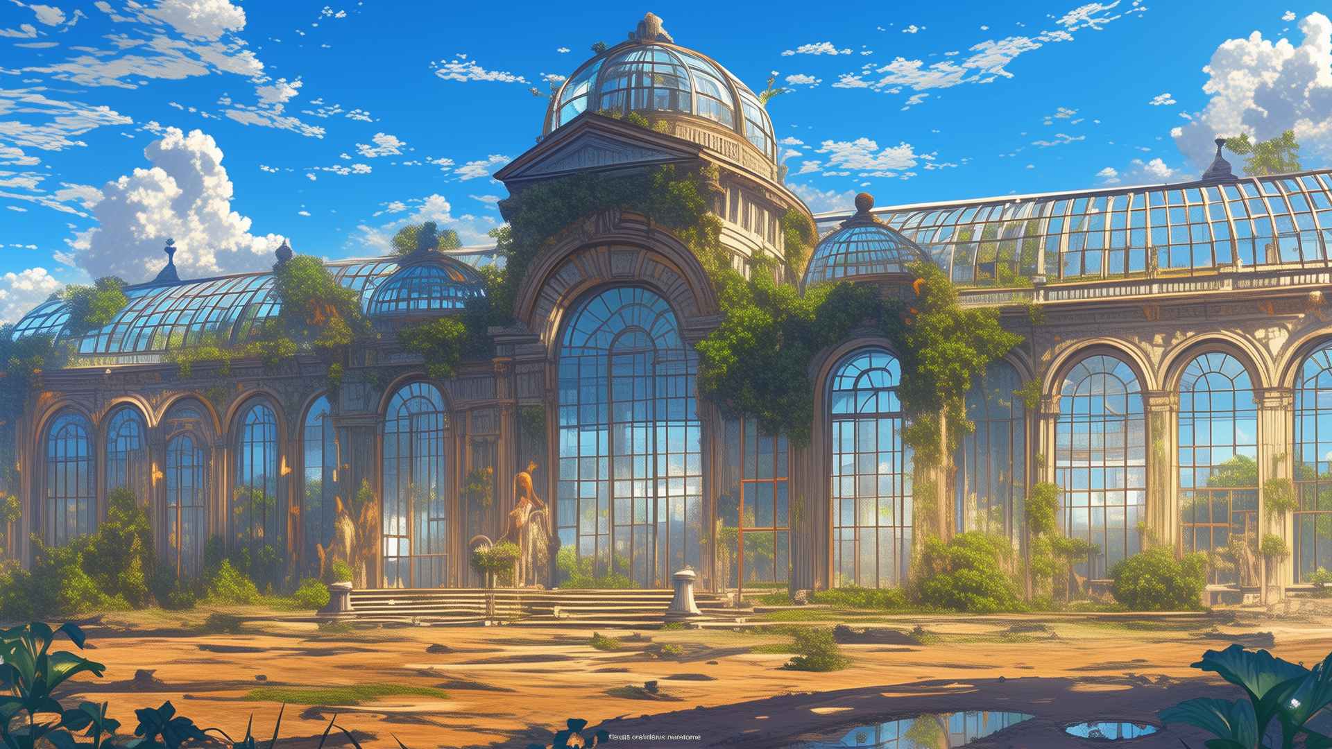 蔦が絡まる大きなガラスドームを持つ美術館の廃墟が青空に映える。アーチ窓や石造外壁が過去の優雅さを残している。芸術都市や遺跡探訪を舞台にしたTRPGシナリオに適した背景素材。