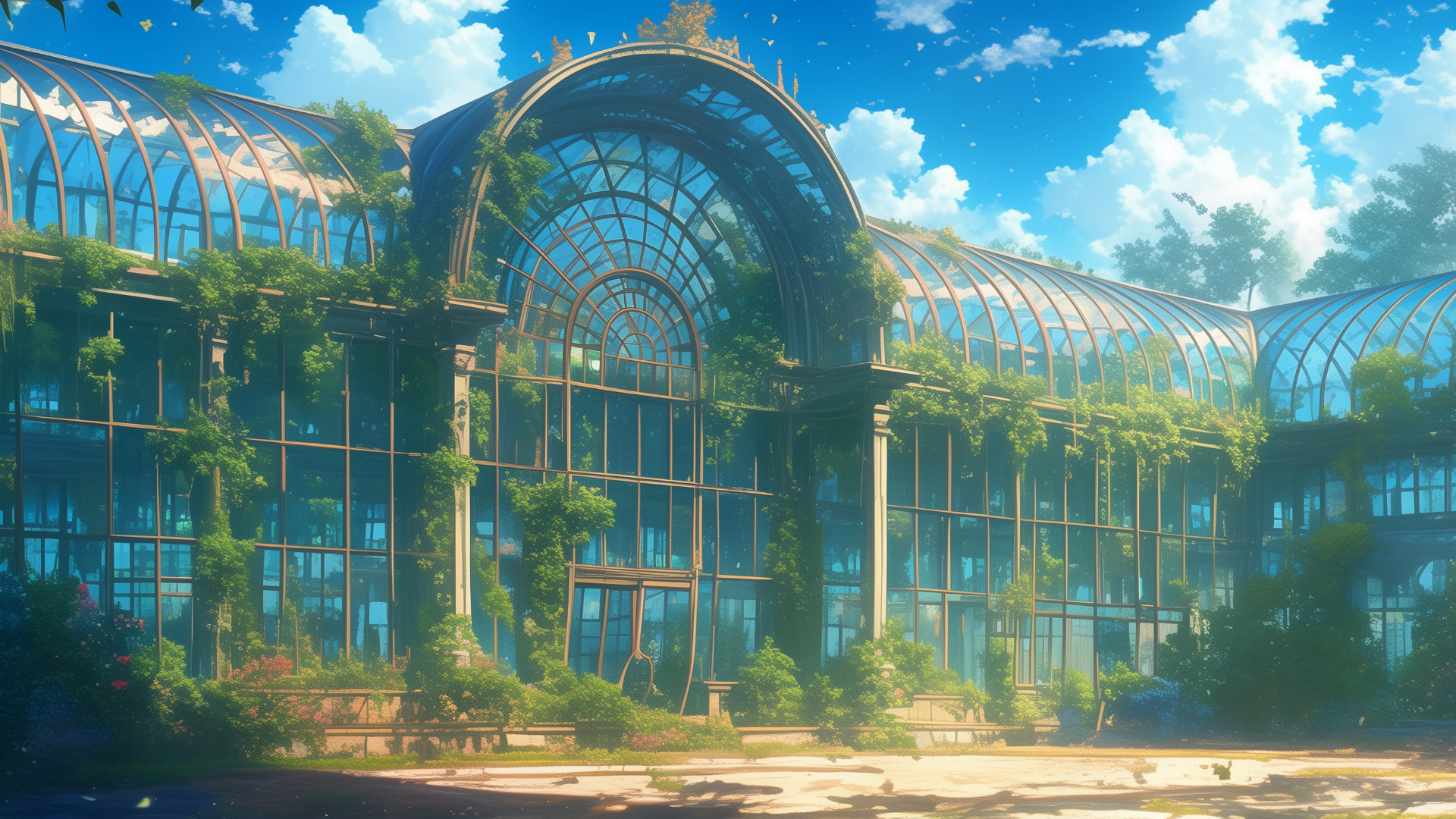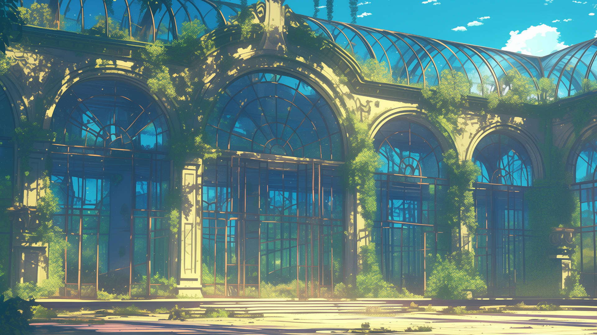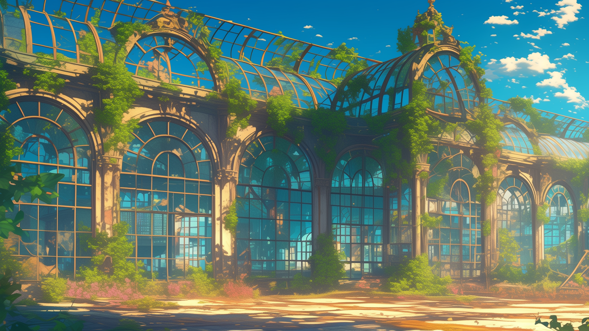 蔦が絡まる大きなガラスドームを持つ美術館の廃墟が青空に映える。アーチ窓や石造外壁が過去の優雅さを残している。芸術都市や遺跡探訪を舞台にしたTRPGシナリオに適した背景素材。