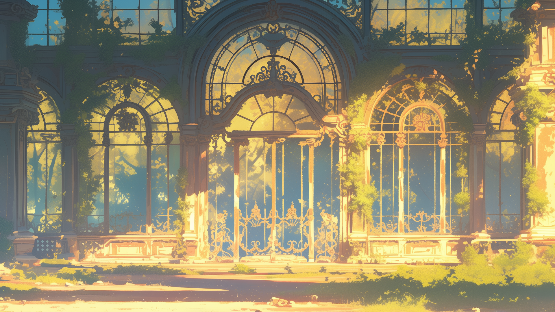 高いガラスのアーチが並ぶ美術館の正面。陽光と影が交錯し、外壁は蔦や苔に覆われている。遺跡探索やミステリアスな出会いの場面に映える背景素材。