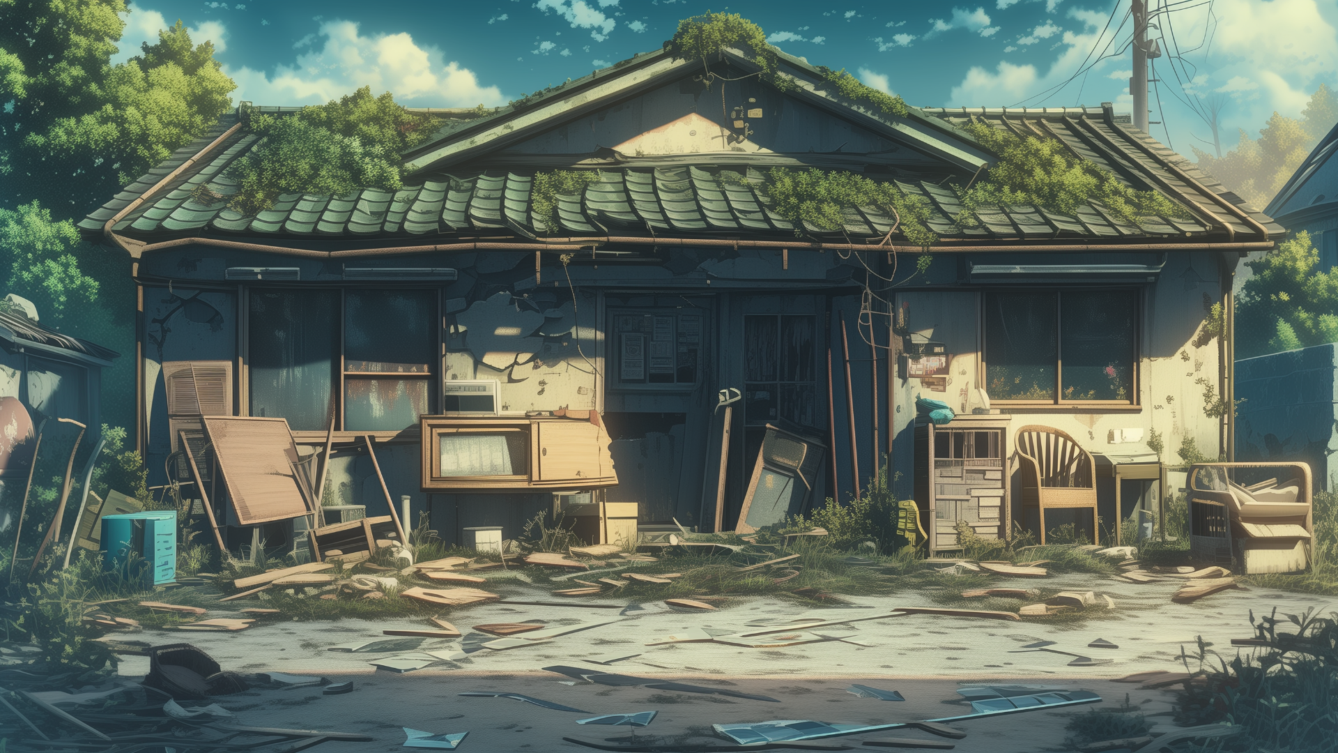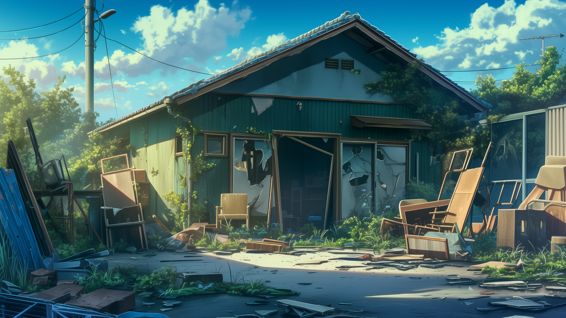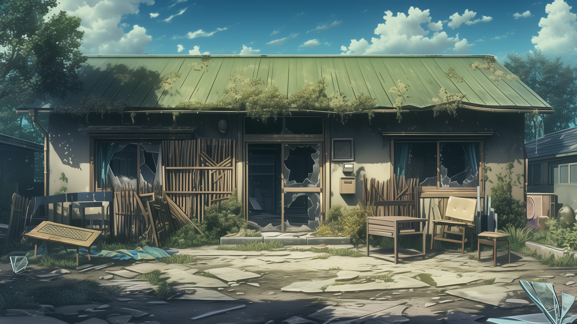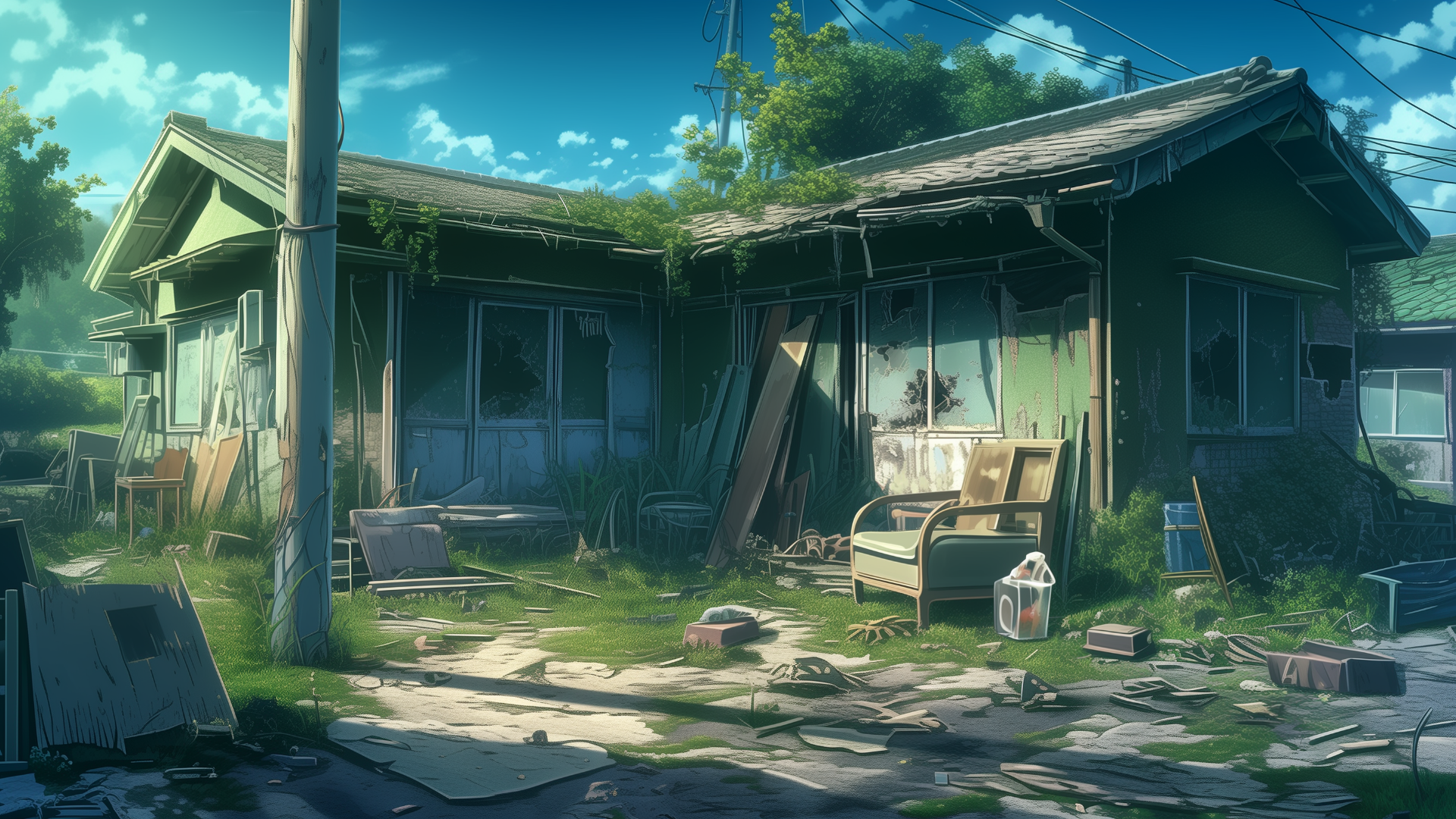昼間でも不気味な雰囲気を漂わせる廃れた住宅。玄関は破壊され、家具や廃材が無造作に散乱している。失踪事件や都市伝説の舞台としてTRPGシナリオに使える背景。