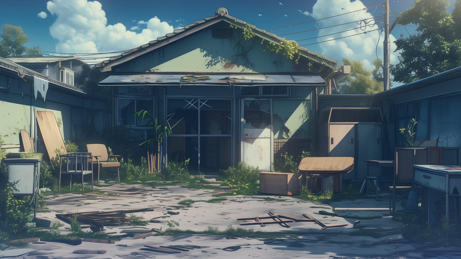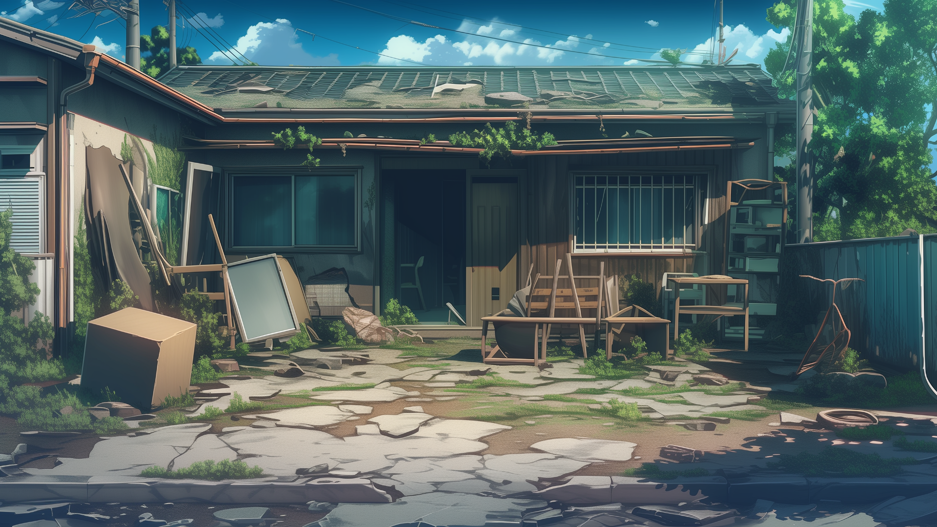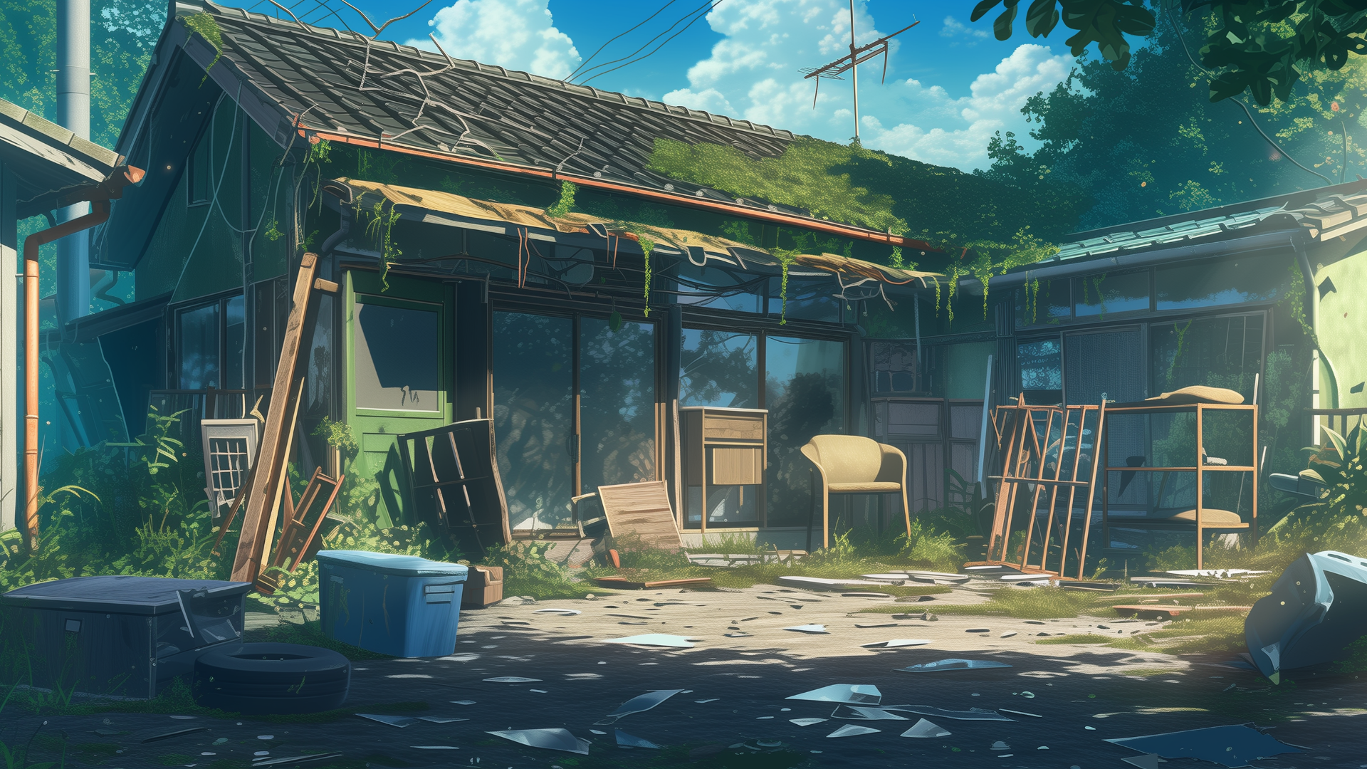 荒れ果てた民家の庭先。散乱する家具や割れたガラス、雑草に覆われた地面が、長年の放置を物語る。探索シナリオや事件の舞台に適したTRPG用背景画像。
