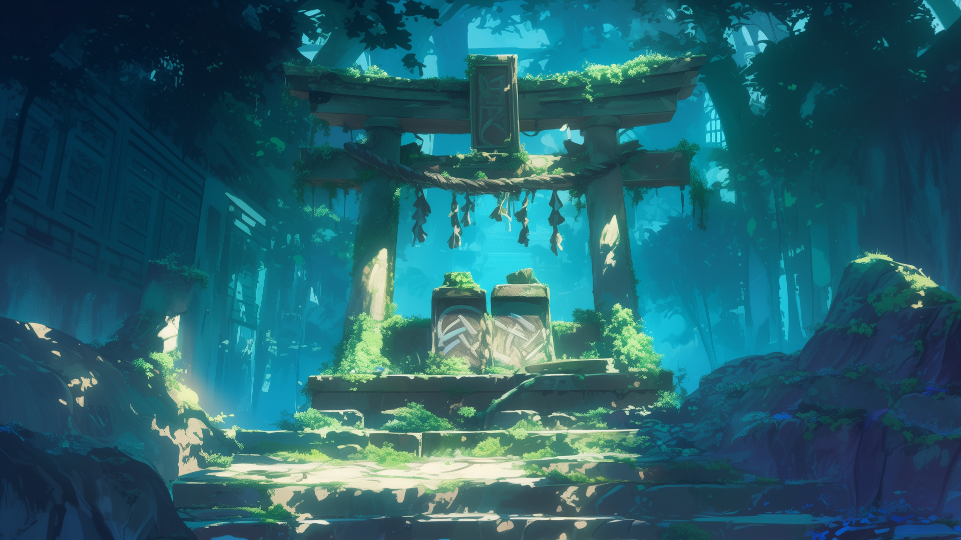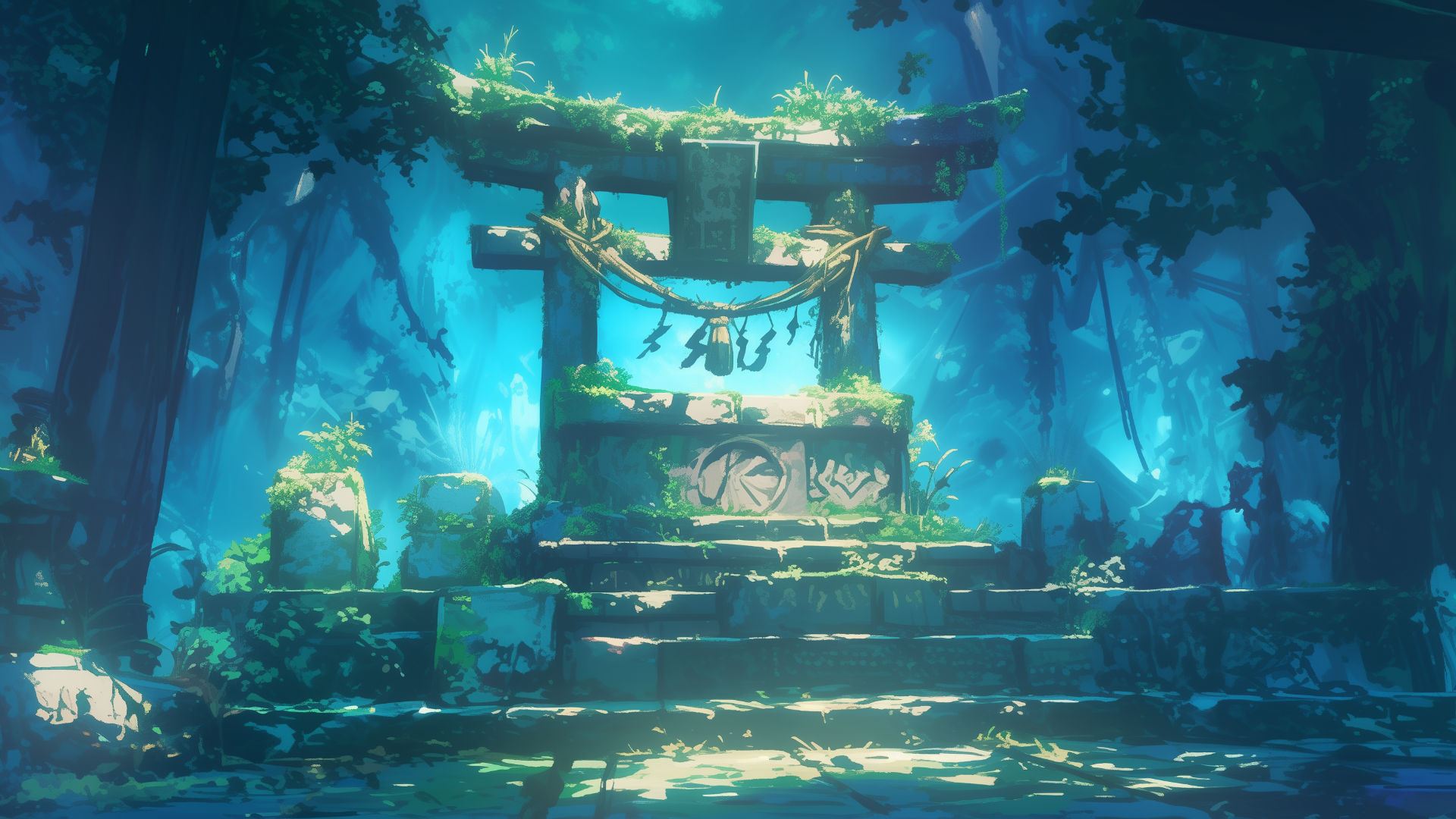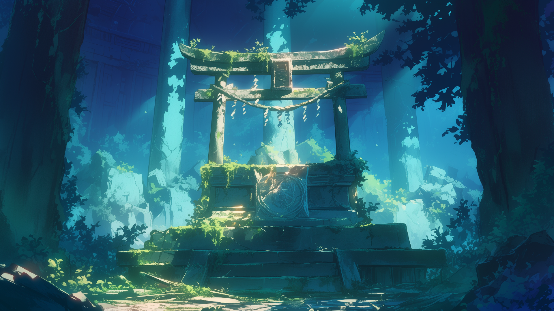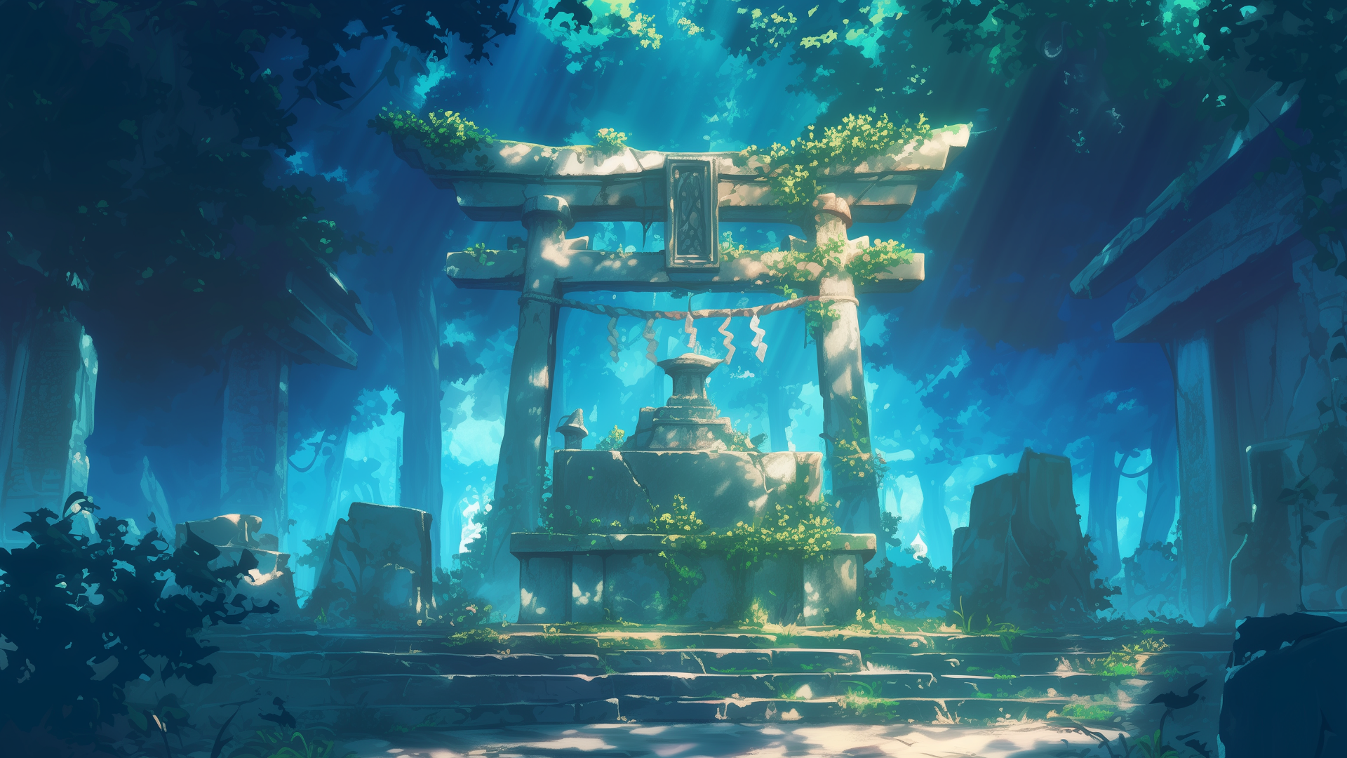 崩れかけた石の鳥居と祠が密林に囲まれた、光差す神聖な祭壇跡。遺跡の柱や石像が周囲に散在し、長い時の流れを感じさせる。精霊信仰や古代文明をモチーフにしたTRPGシナリオに使えるフリー背景素材。