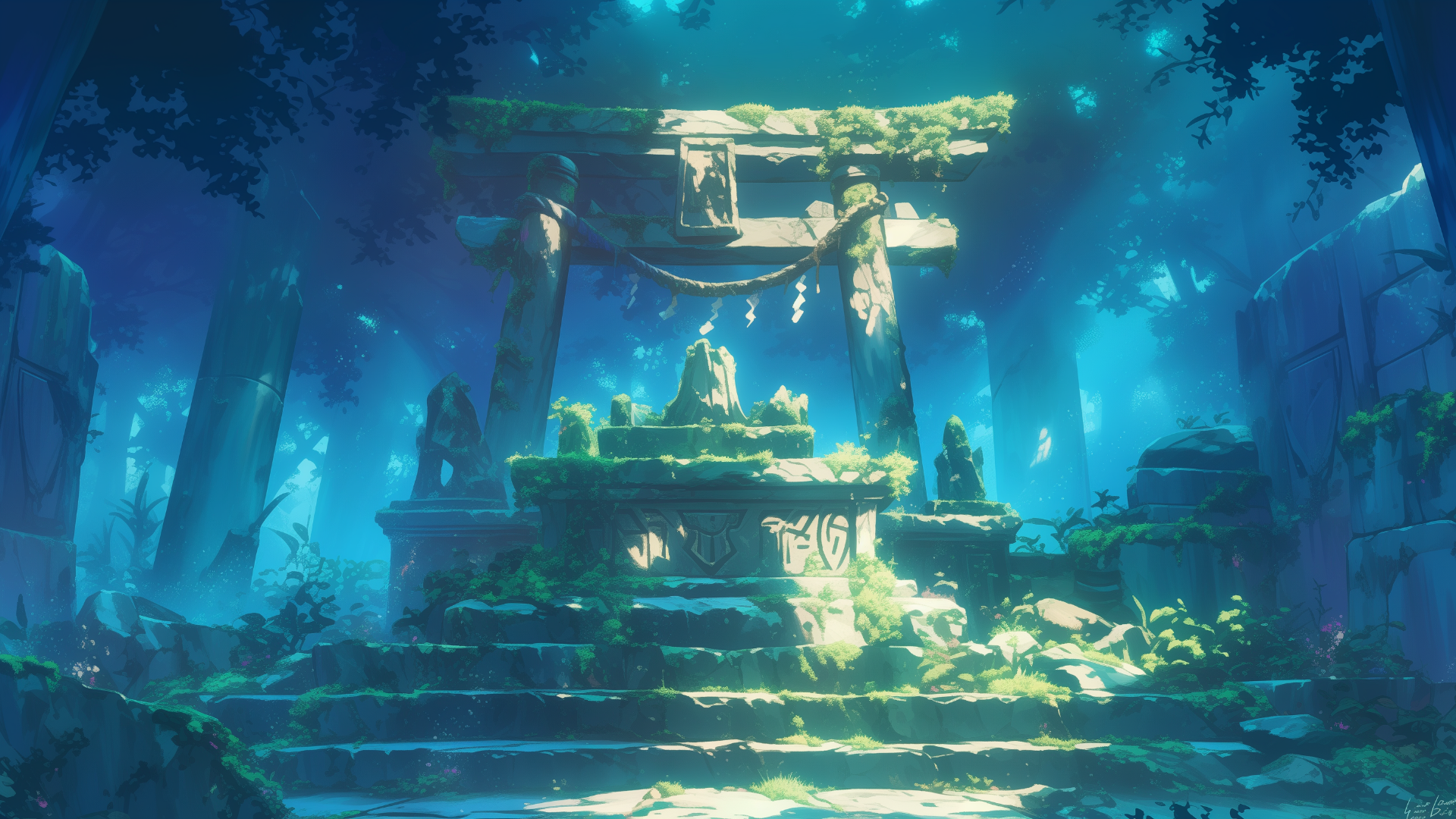 荘厳な鳥居と石造の祭壇が、青く輝く森の中で光に包まれている。周囲には朽ちた石柱や自然に飲み込まれた構造物が広がっている。儀式の場面や探索パートに活かせるTRPG向けのフリー背景素材。