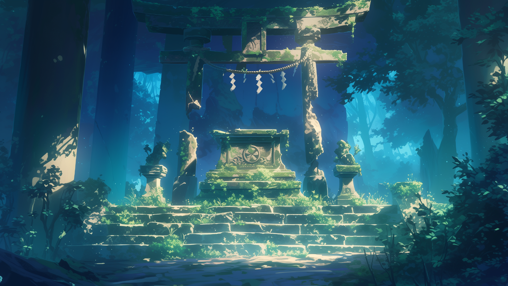 草木に覆われた石段の先に、鳥居と丸い装飾が施された祭壇が静かに佇む。左右には小さな獣の石像が配置され、奥深い森の静けさが印象的。古代の崇拝や神話をテーマにしたシナリオで活用しやすい背景画像。