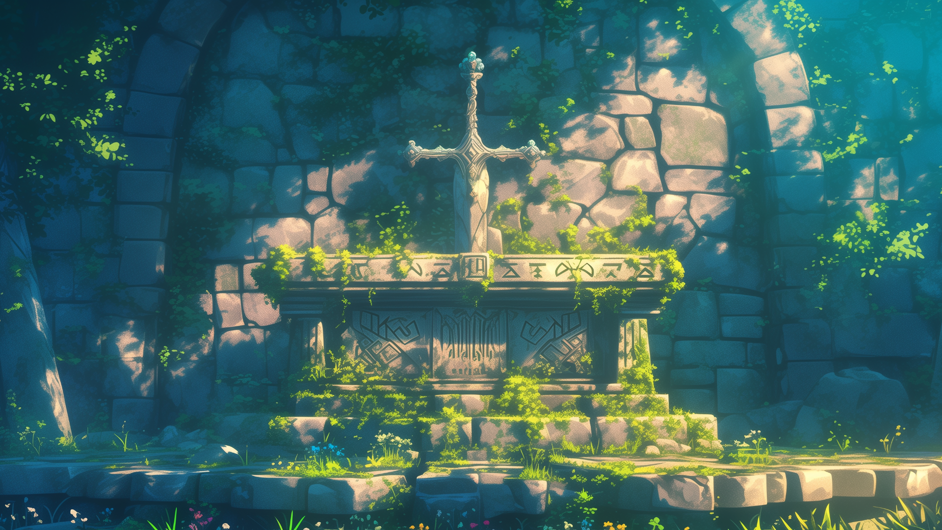 木漏れ日が差し込む深い森の奥に、苔むした石造りの祭壇が佇む。 周囲は静寂に包まれ、古代の儀式を思わせる神秘的な空気が漂う。 ファンタジーや遺跡探索のTRPGの場面に適したフリー背景素材。