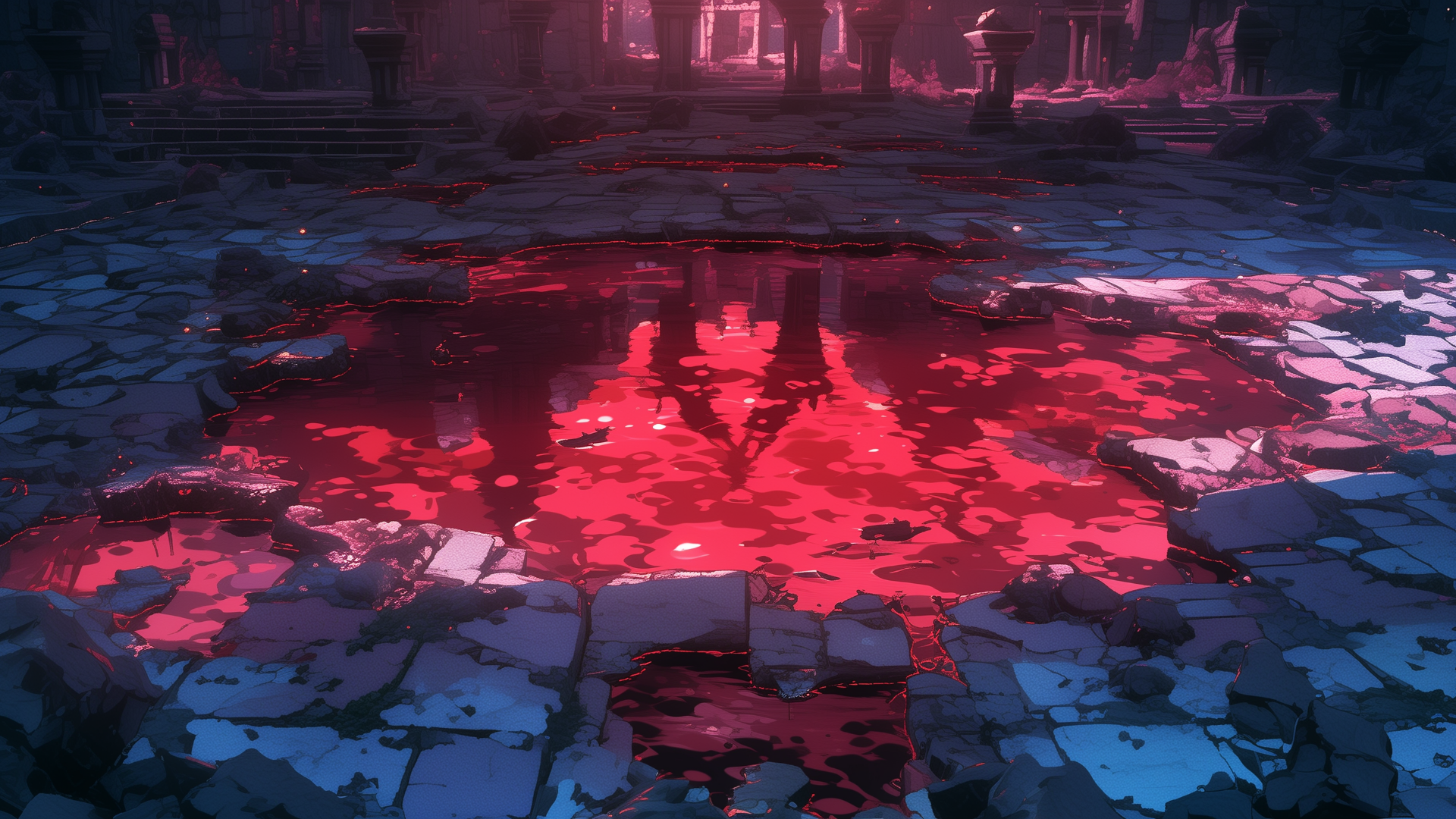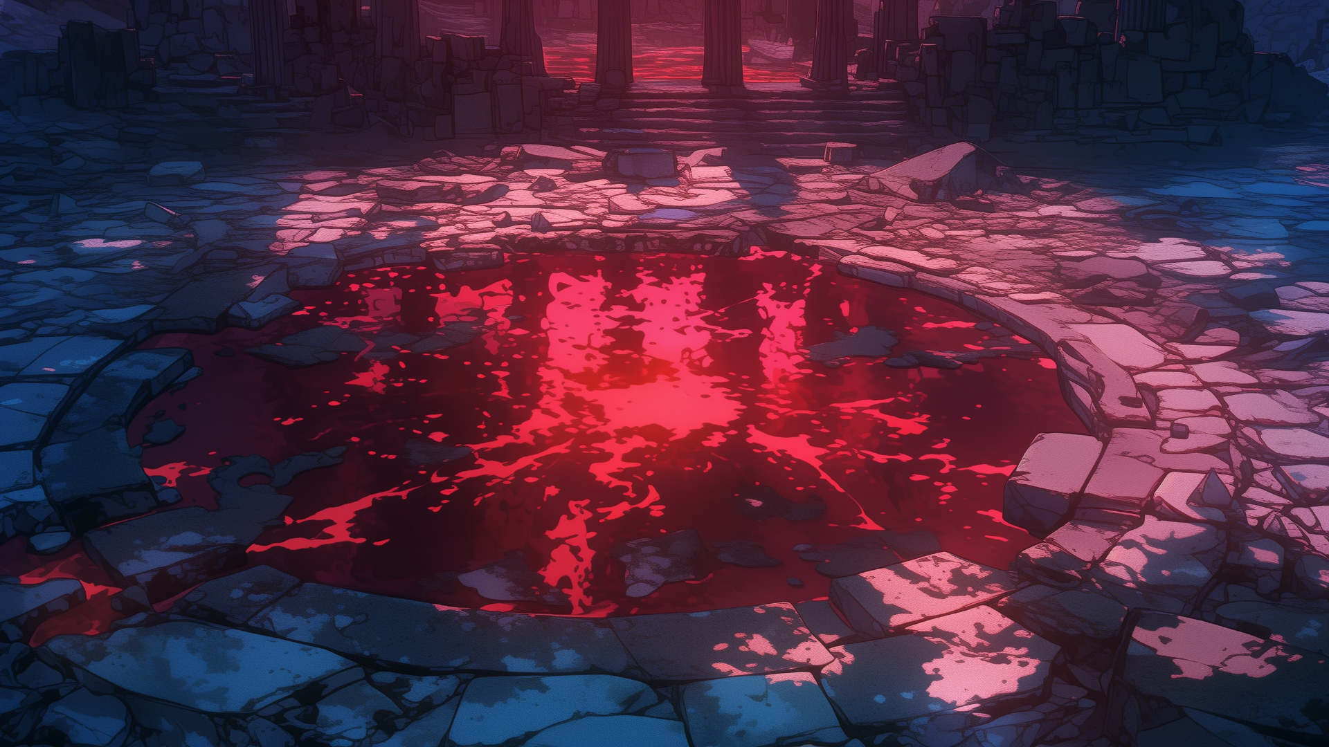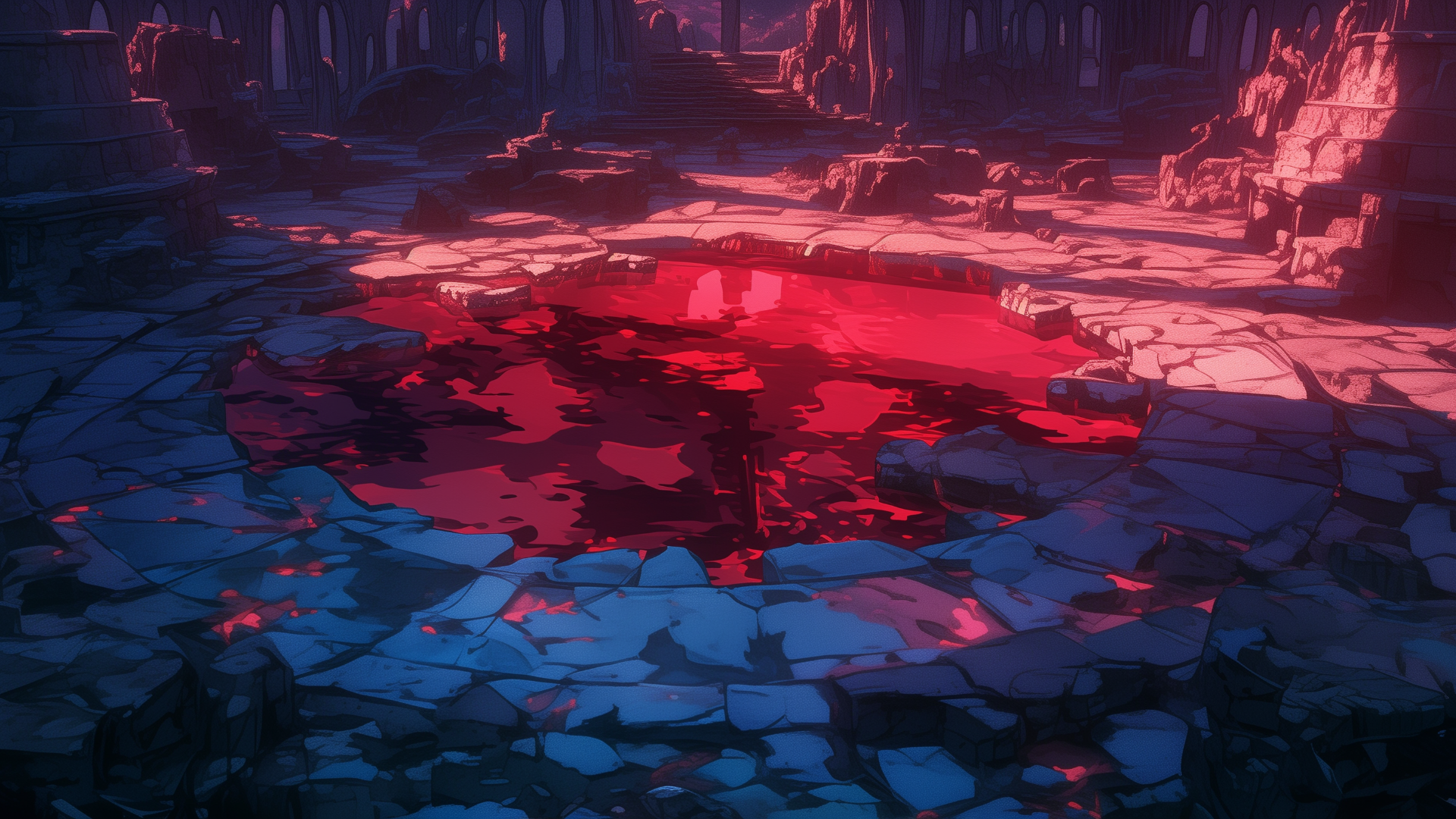 赤く染まった広大な池が、廃墟と化した神殿のような空間の中央に広がる。反射する光と飛び散る赤いしぶきが、神秘的かつ不穏な雰囲気を醸し出している。ホラーや魔術儀式の場面に活用できる背景素材。