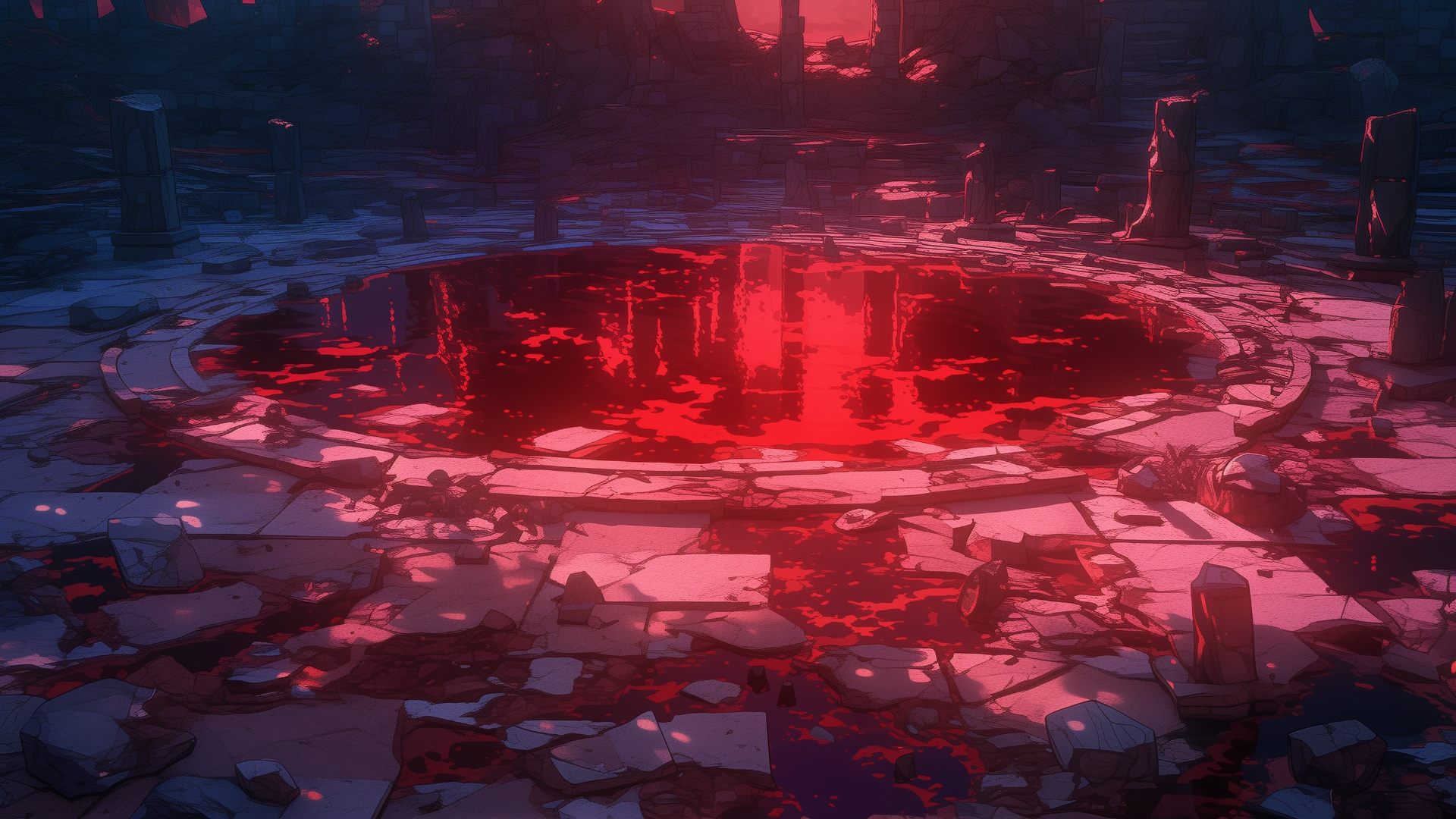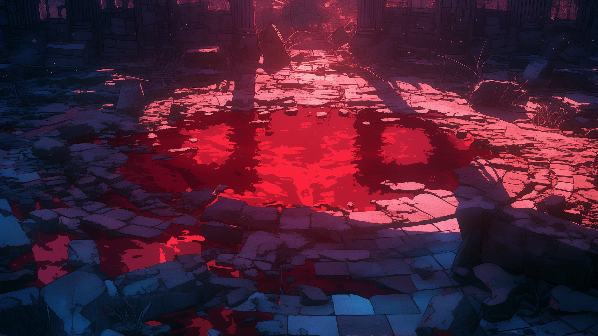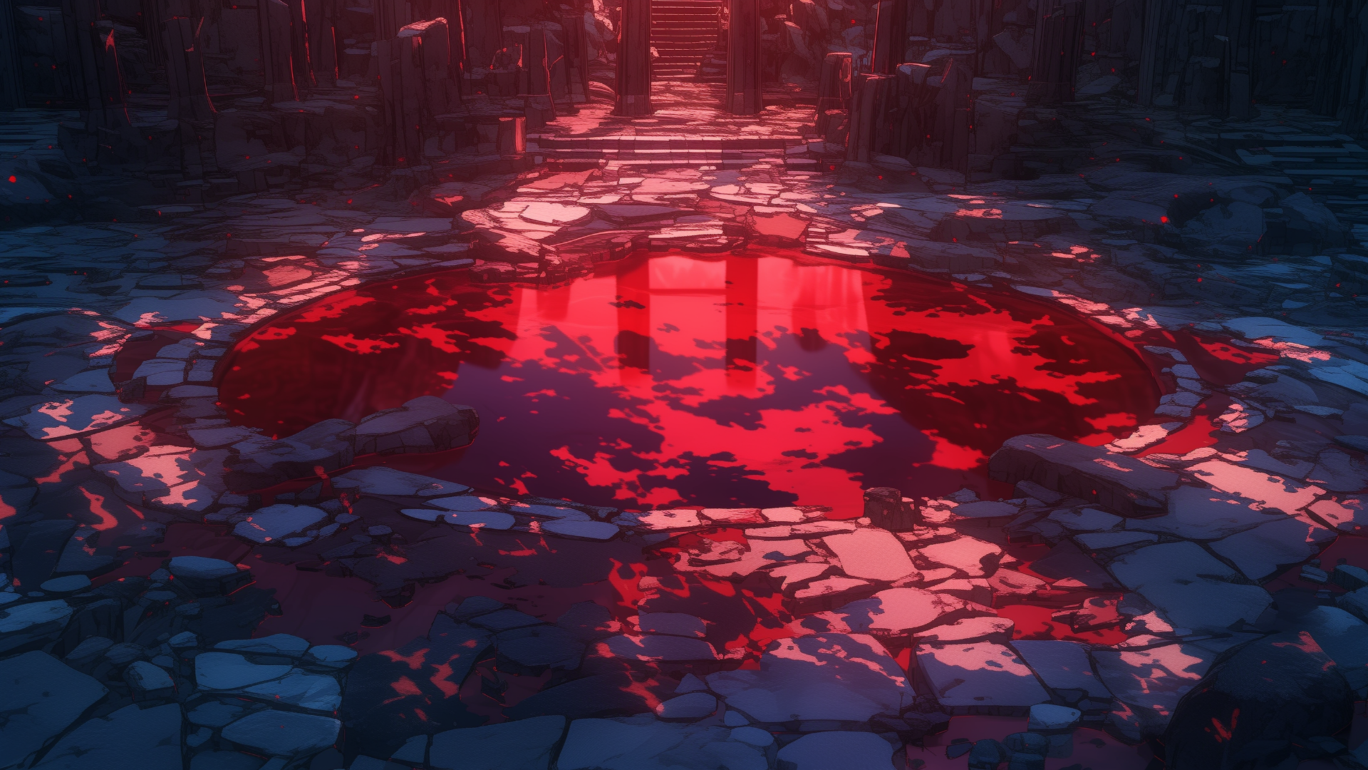 赤く染まった広大な池が、廃墟と化した神殿のような空間の中央に広がる。反射する光と飛び散る赤いしぶきが、神秘的かつ不穏な雰囲気を醸し出している。ホラーや魔術儀式の場面に活用できる背景素材。