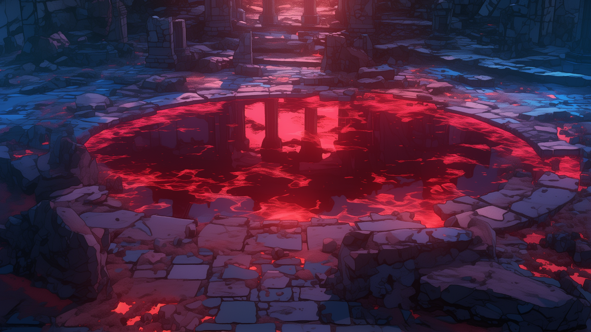 巨大な赤い池が遺跡の中央に広がり、反射する光と周囲の暗がりが強いコントラストを生んでいる。石畳の隙間からは赤い液体が滲み出ており、呪術的な雰囲気が漂う。魔術師のアジトや禁断の儀式にふさわしい背景素材。