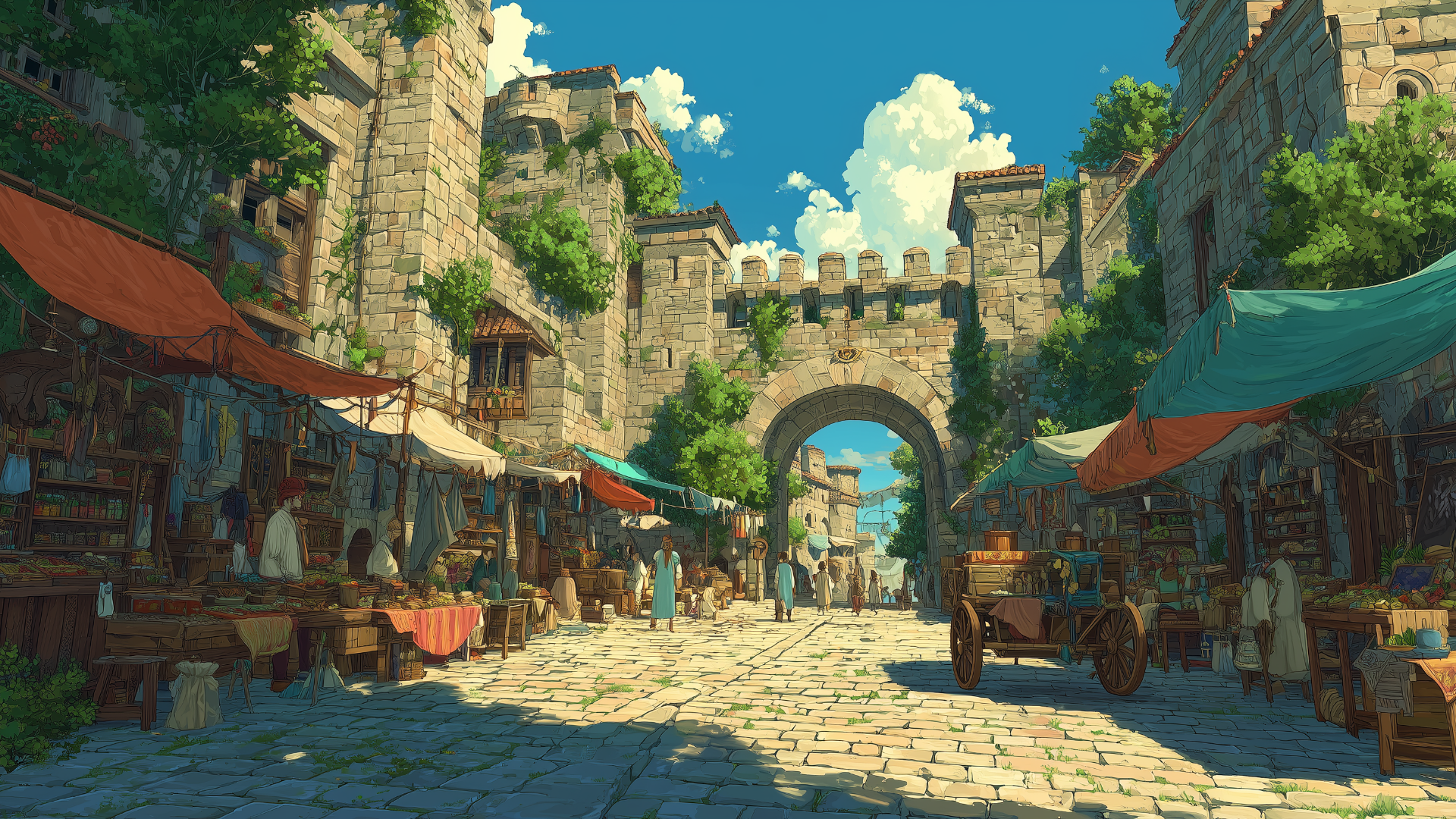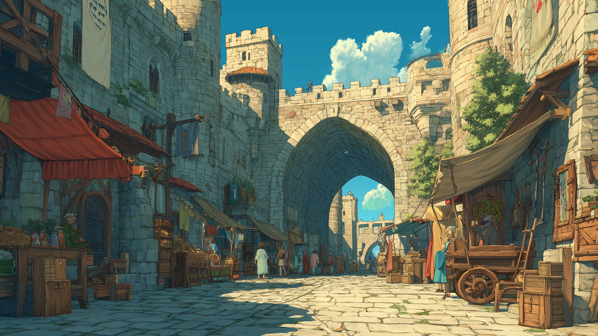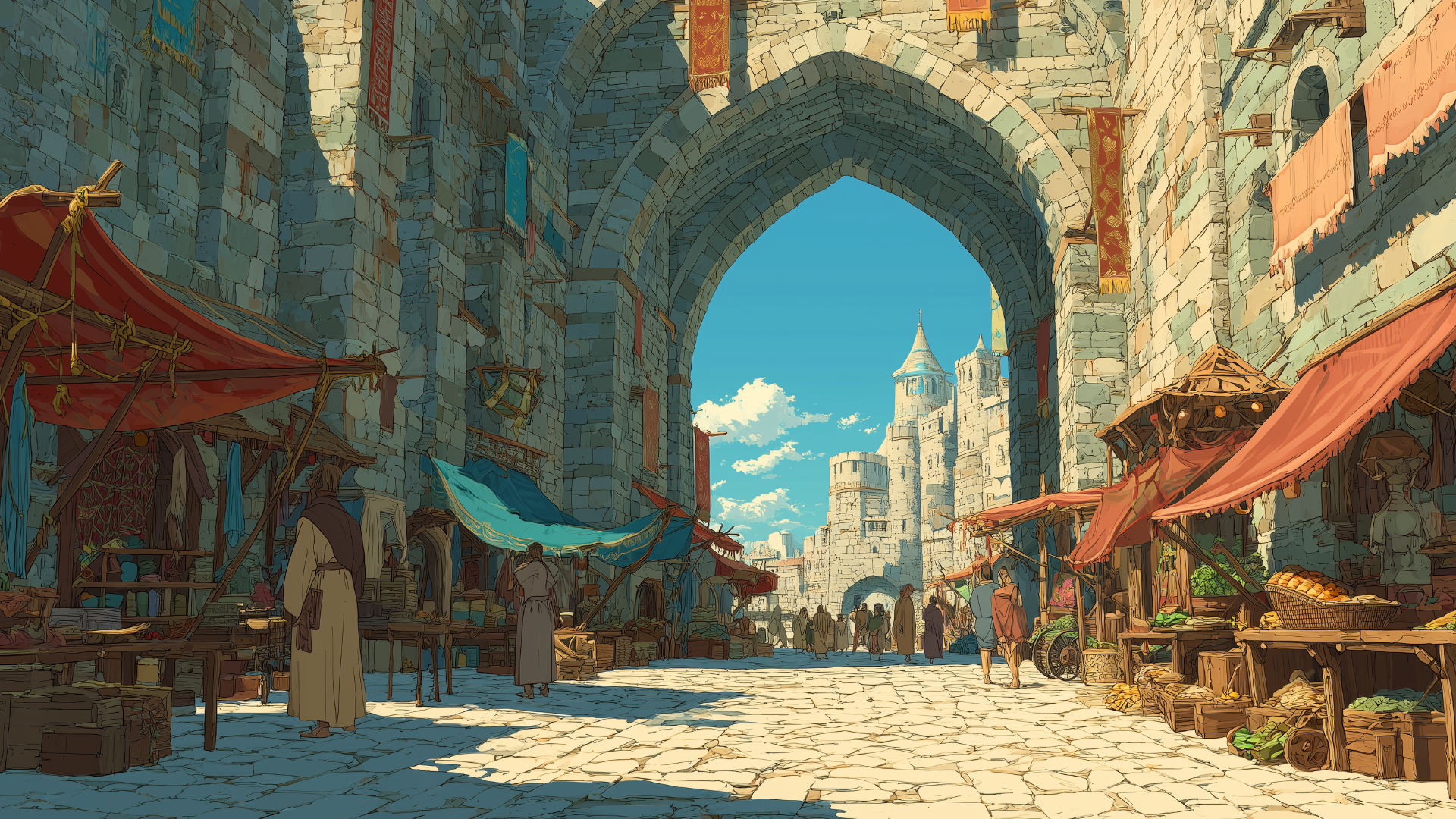 石畳の道沿いに多彩な屋台が立ち並び、城門のアーチを背景に人々が買い物を楽しむ光景。野菜や香辛料、手工芸品が並ぶ情景は交易の盛んな城下町の雰囲気を演出するのに最適な背景画像。