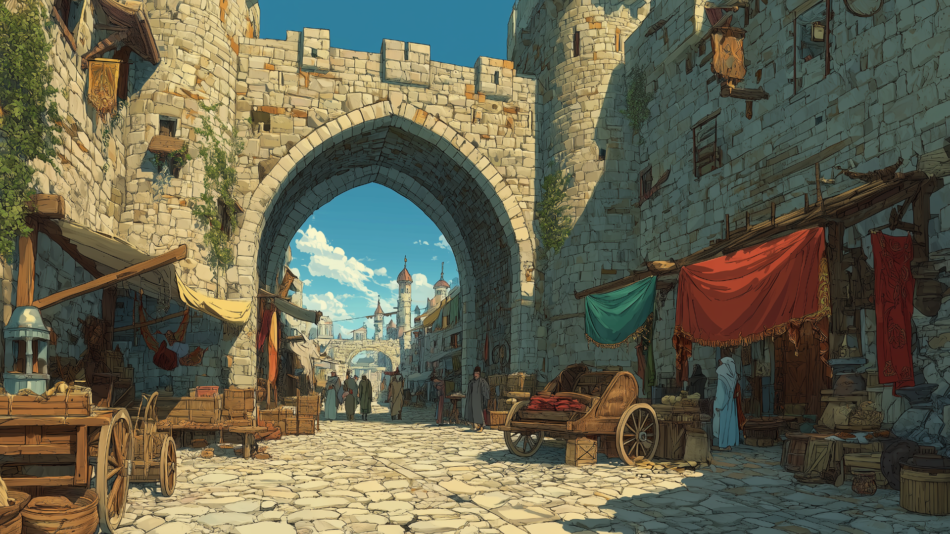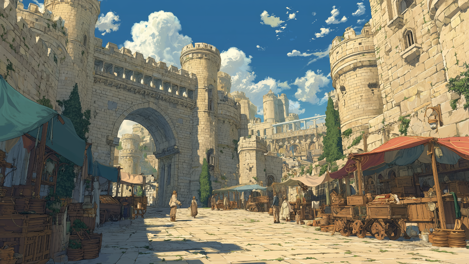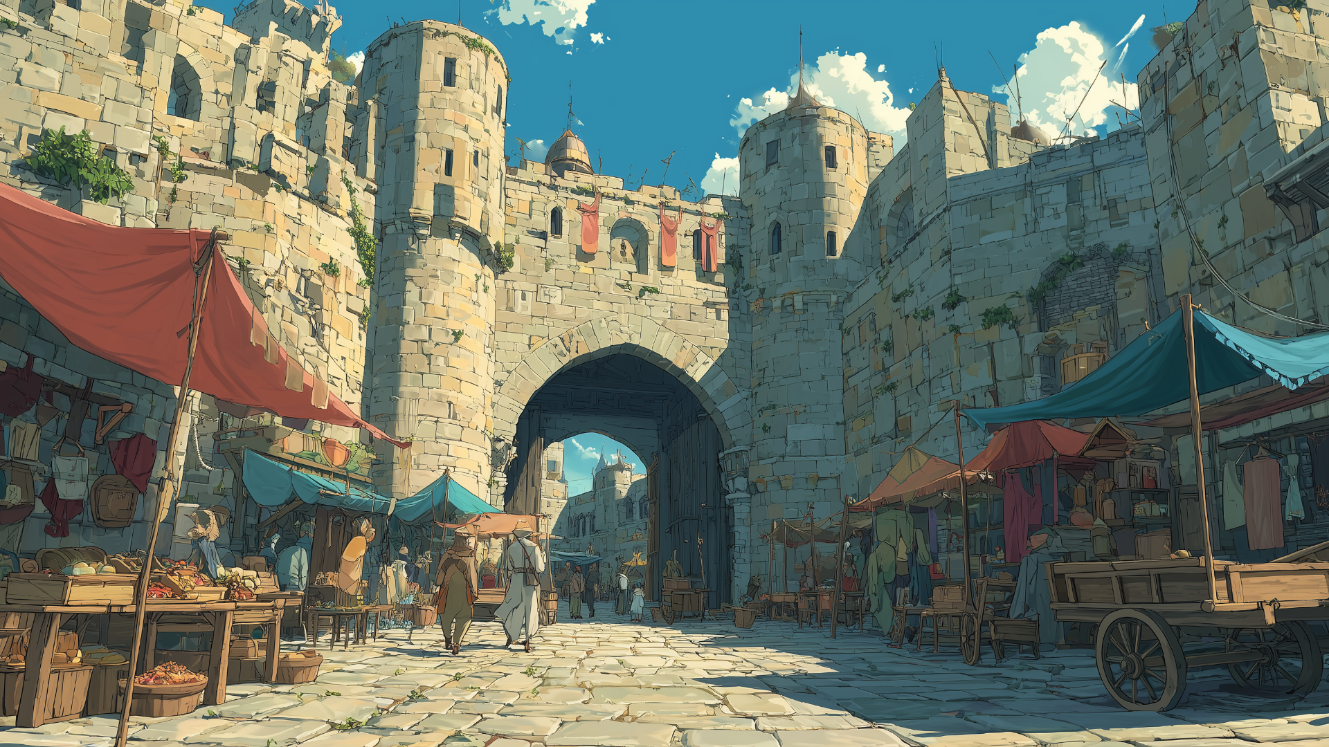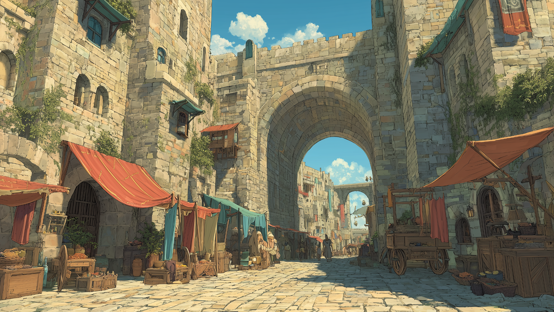 石畳の道沿いに多彩な屋台が立ち並び、城門のアーチを背景に人々が買い物を楽しむ光景。野菜や香辛料、手工芸品が並ぶ情景は交易の盛んな城下町の雰囲気を演出するのに最適な背景画像。