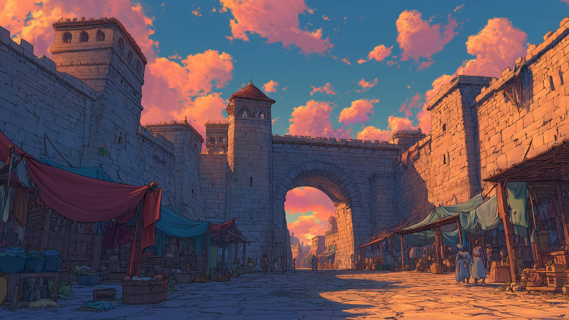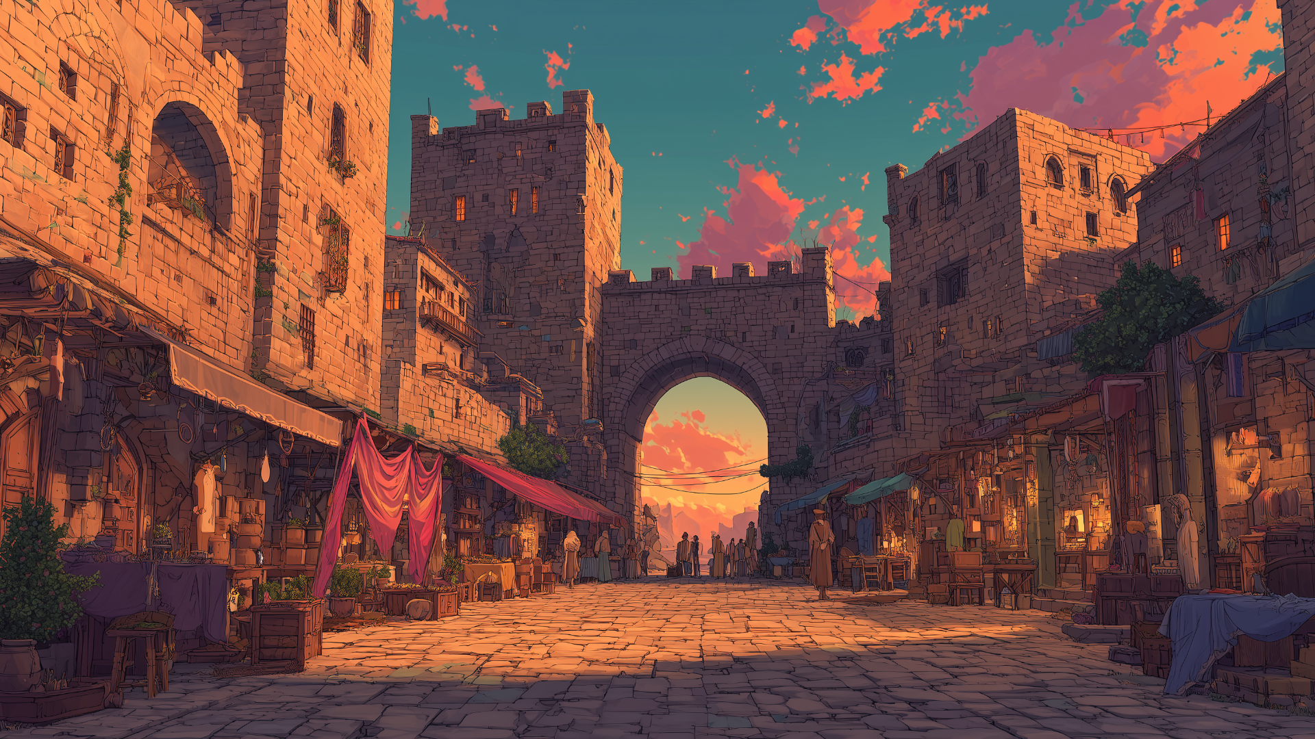 夕陽に照らされる、城下町の市場のフリー背景素材です。