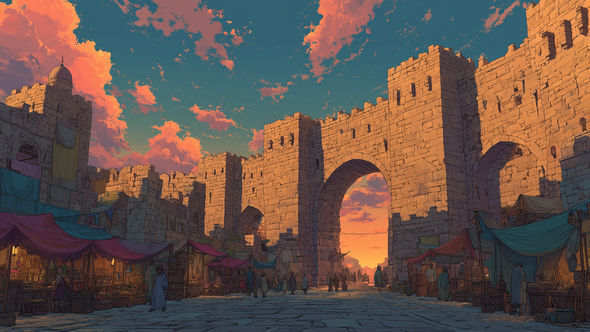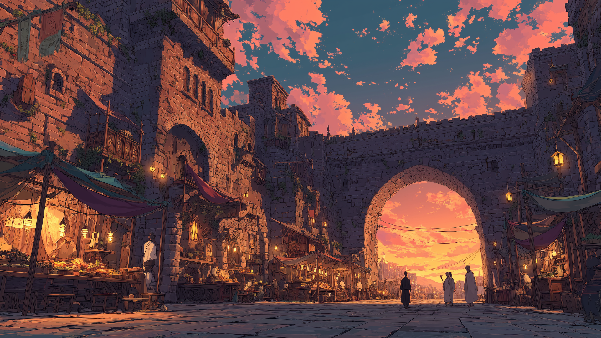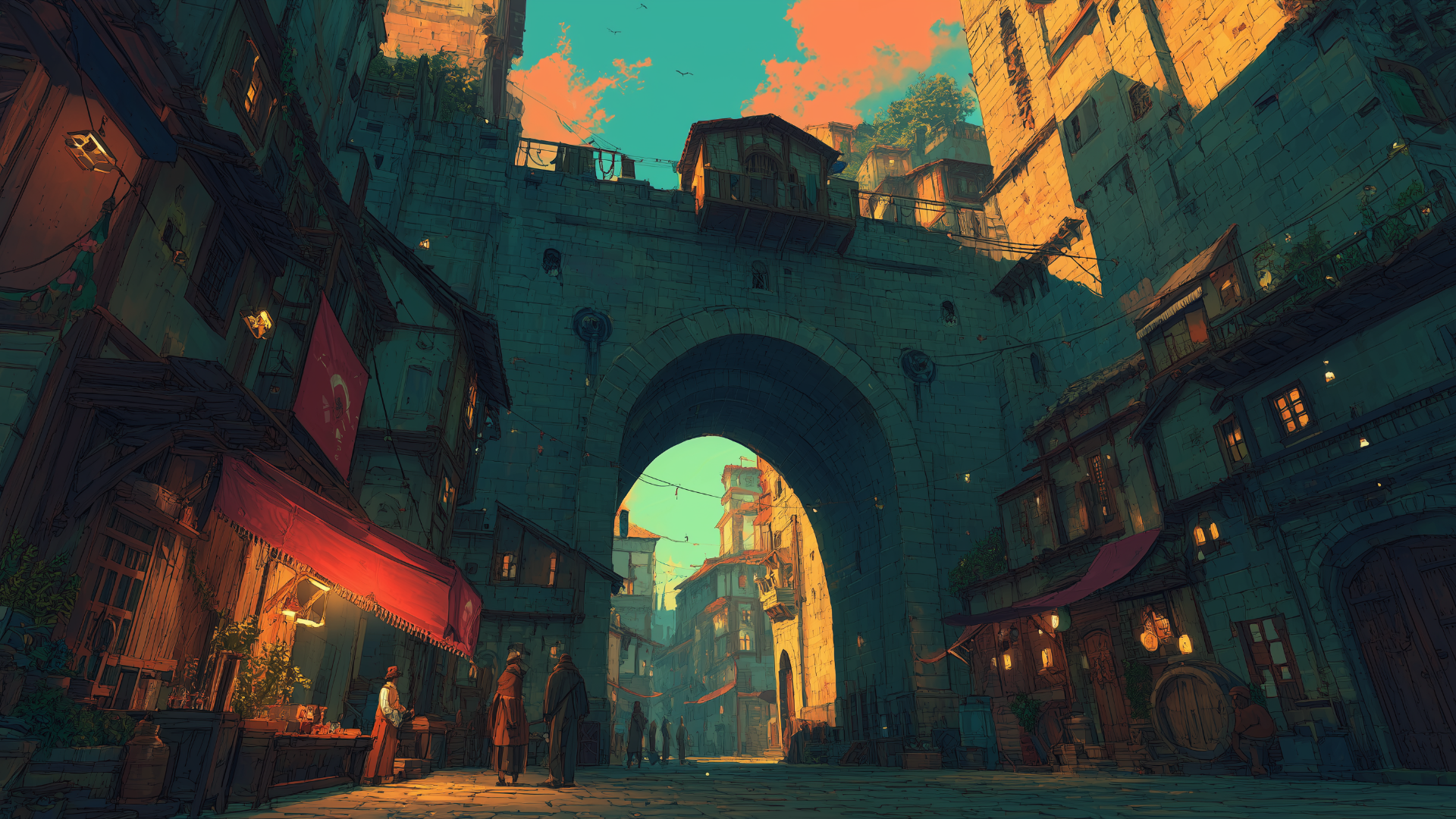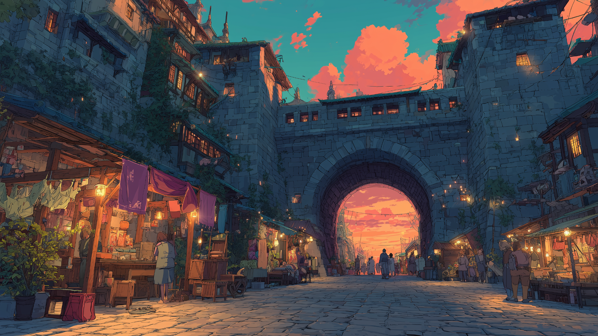 城下町, 夕暮れ, 茜色, 市場, アーチ